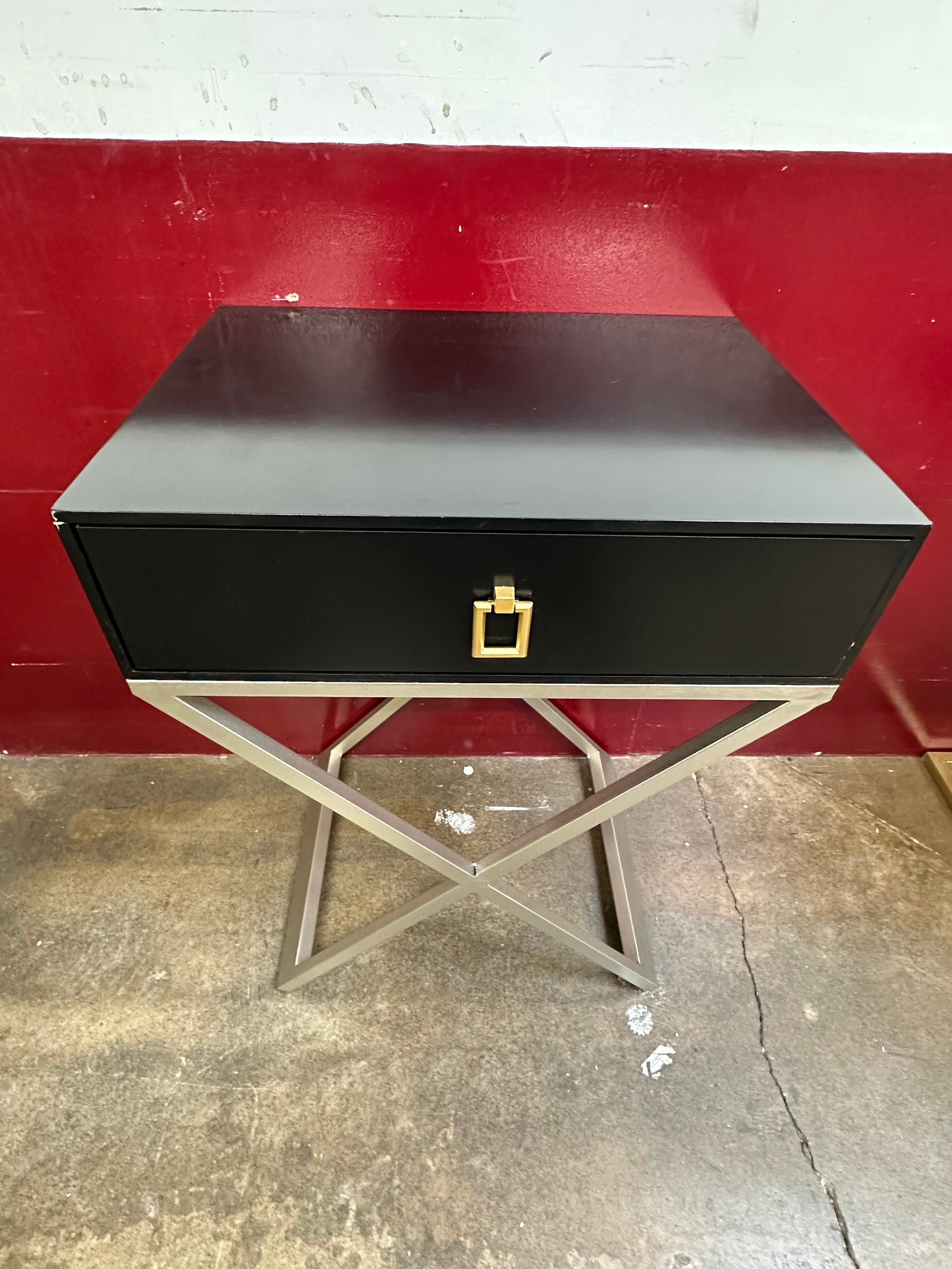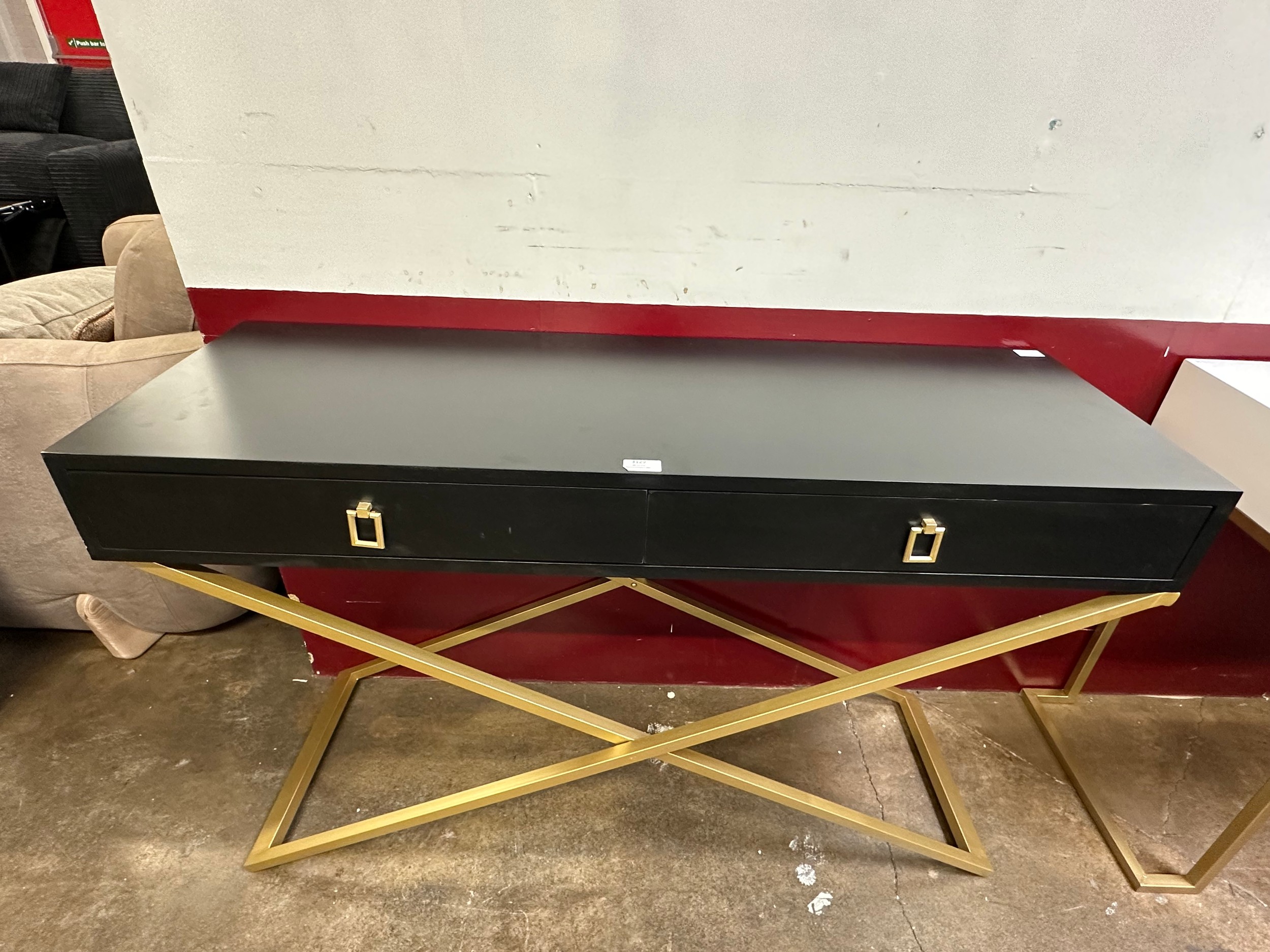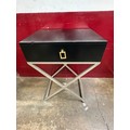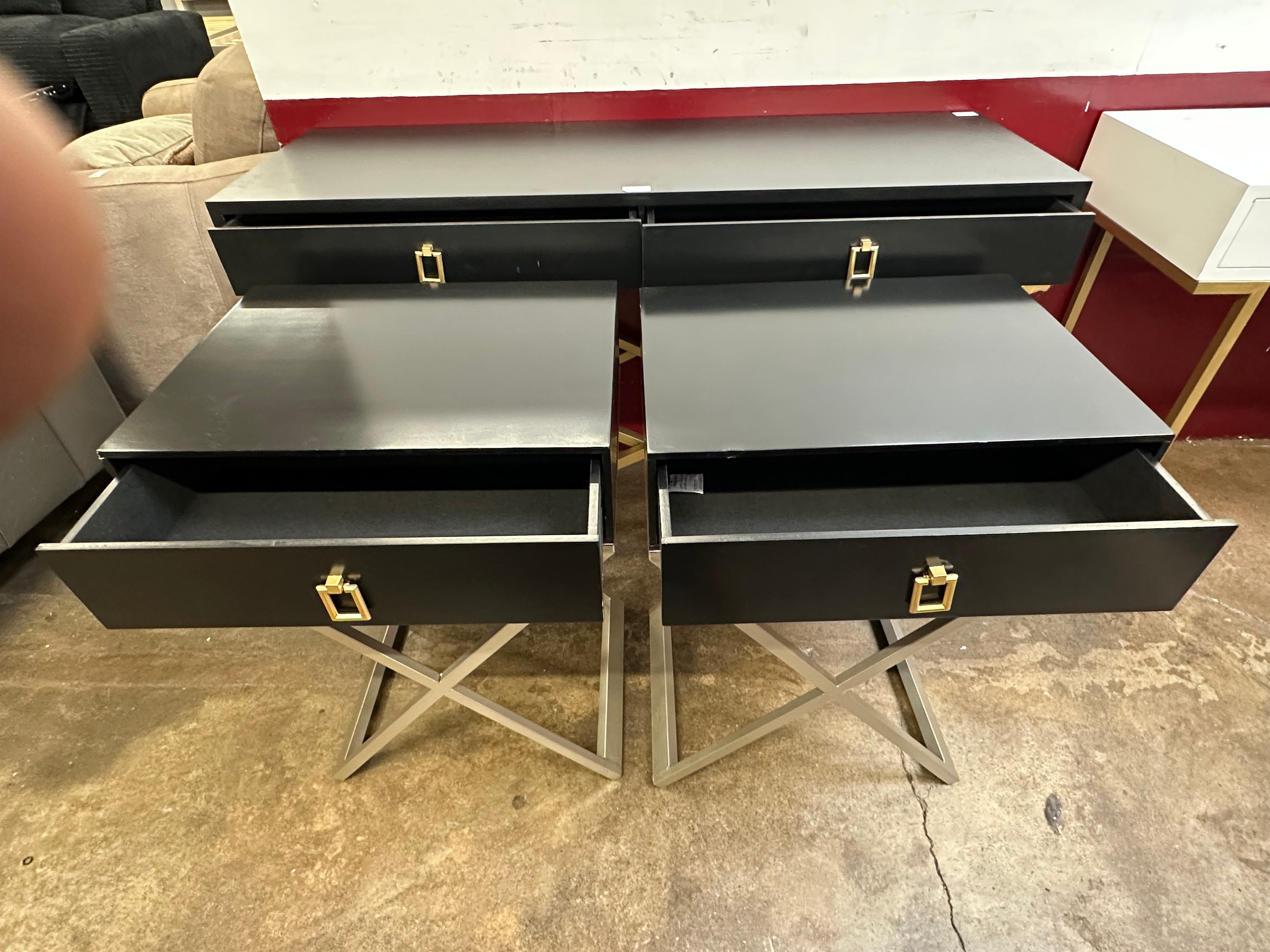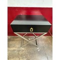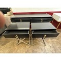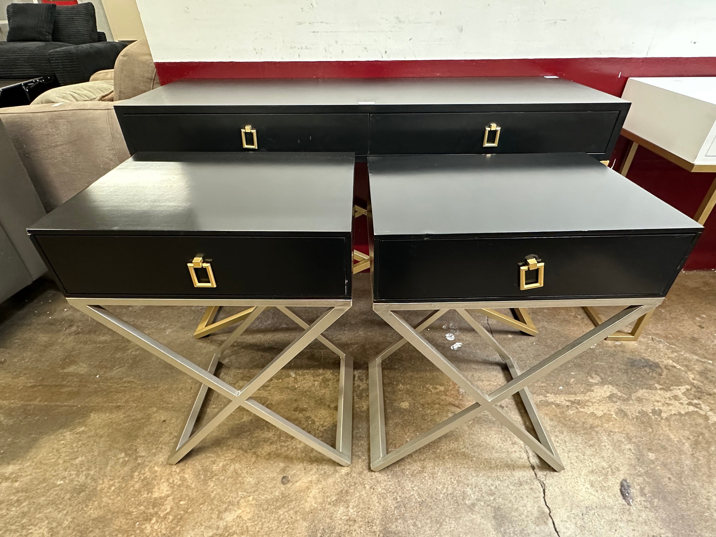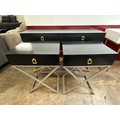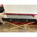 A black 2 drawer console table and a pair of single drawer side tables