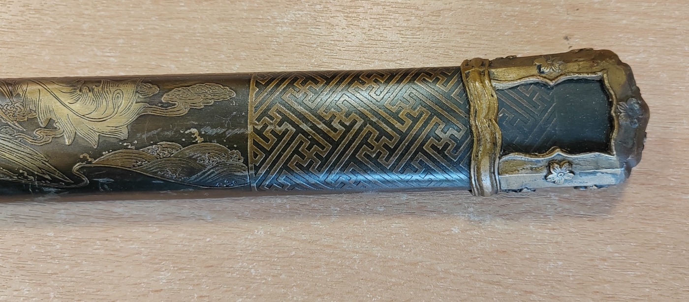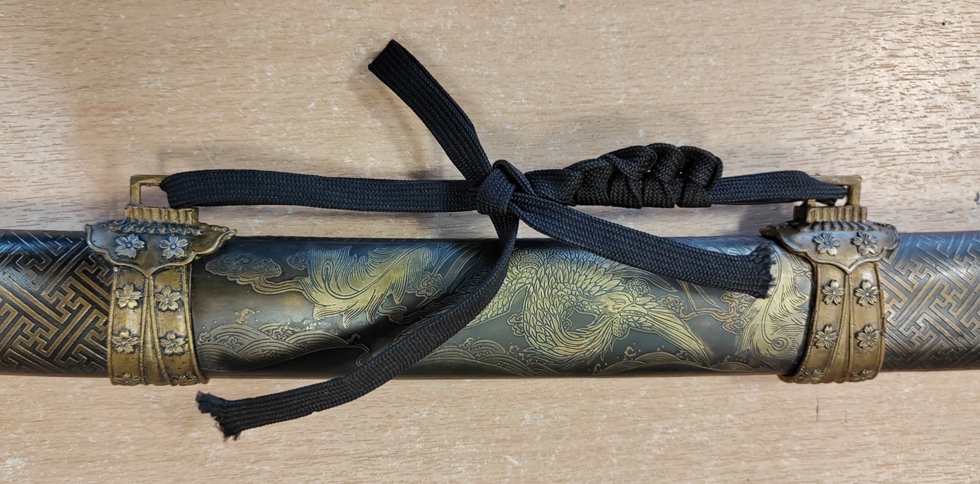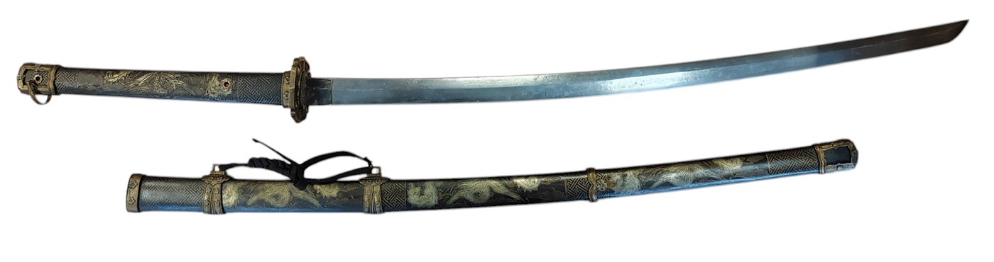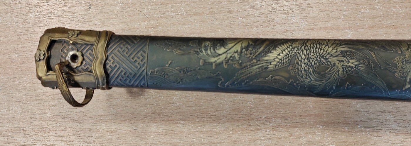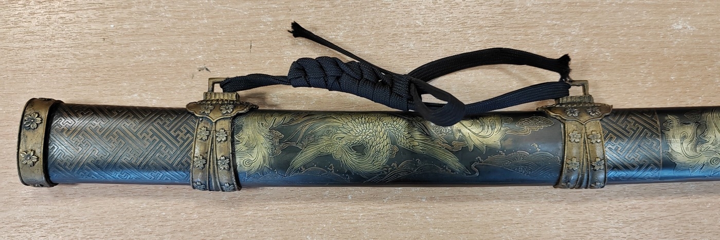 Japanese Tachi with decorative metal scabbard, blade extremely fine, fuchi, tsuba, kashira each with floral pattern (loose tsuba/seppa), metal grip with Phoenix pattern, held by single wooden pin, scabbard depicted with same phoenix and floral patterns, overall extremely fine, believed to be modern production, viewing recommended. BUYER MUST COLLECT.