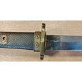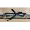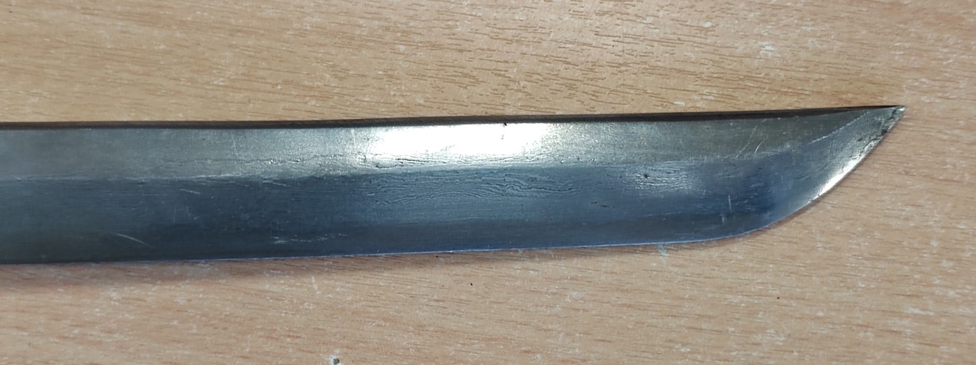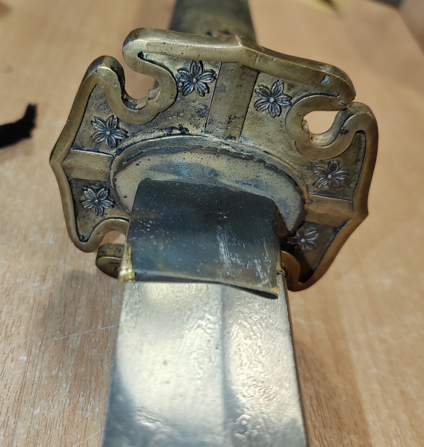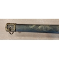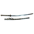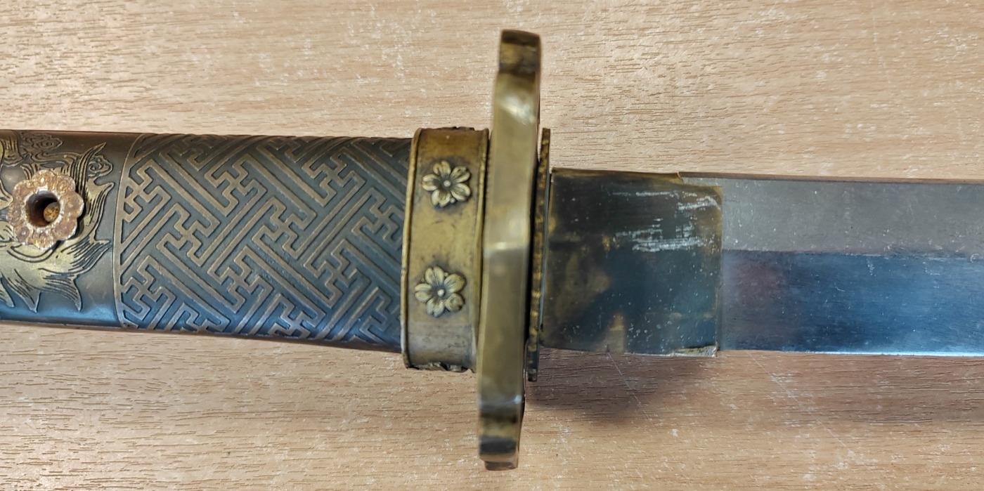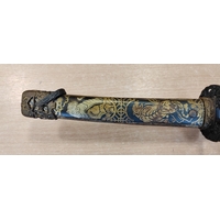 Japanese Tachi with decorative metal scabbard, blade extremely fine, fuchi, tsuba, kashira each with floral pattern (loose tsuba/seppa), metal grip with Phoenix pattern, held by single wooden pin, scabbard depicted with same phoenix and floral patterns, overall extremely fine, believed to be modern production, viewing recommended. BUYER MUST COLLECT.