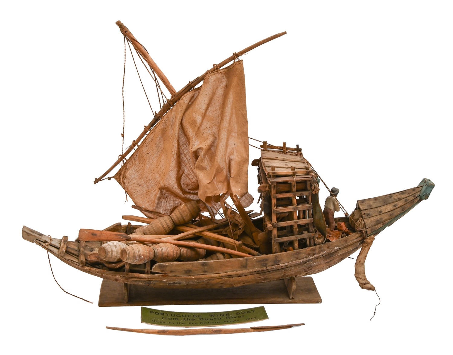A wooden model of a Douro River wine boat, built by Rev'd. Richard Adams, 1967, with sails and rigging, figure and casks, approx 60cm l