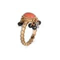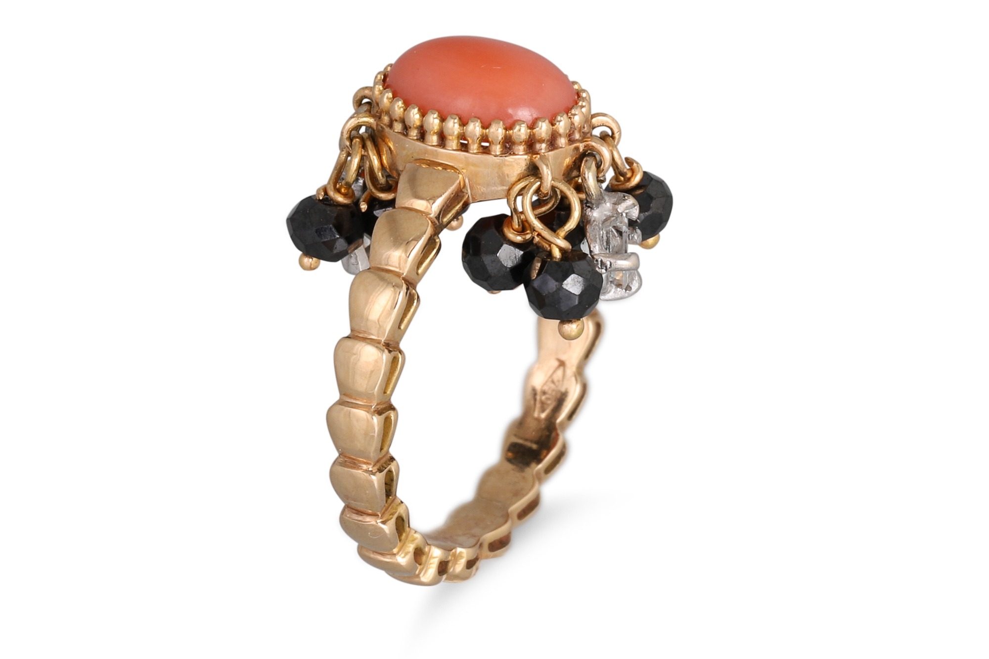 AN UNUSUAL DESIGN CORAL AND DIAMOND RING, featuring drops, mounted in 18ct gold, size K