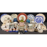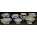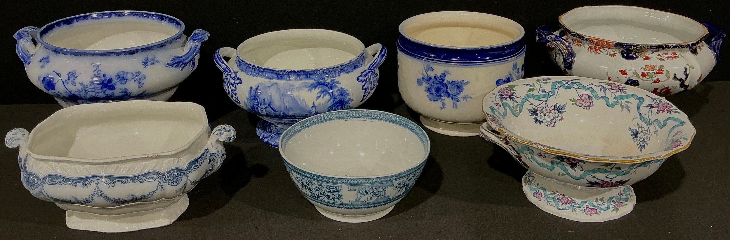 A large 19th century Mason's Ironstone two-handled pedestal bowl, 34cm wide over handles; a Doulton Geneva pattern two-handled pedestal bowl, 30cm over handles; a Royal Doulton blue and white jardiniere; etc (7)