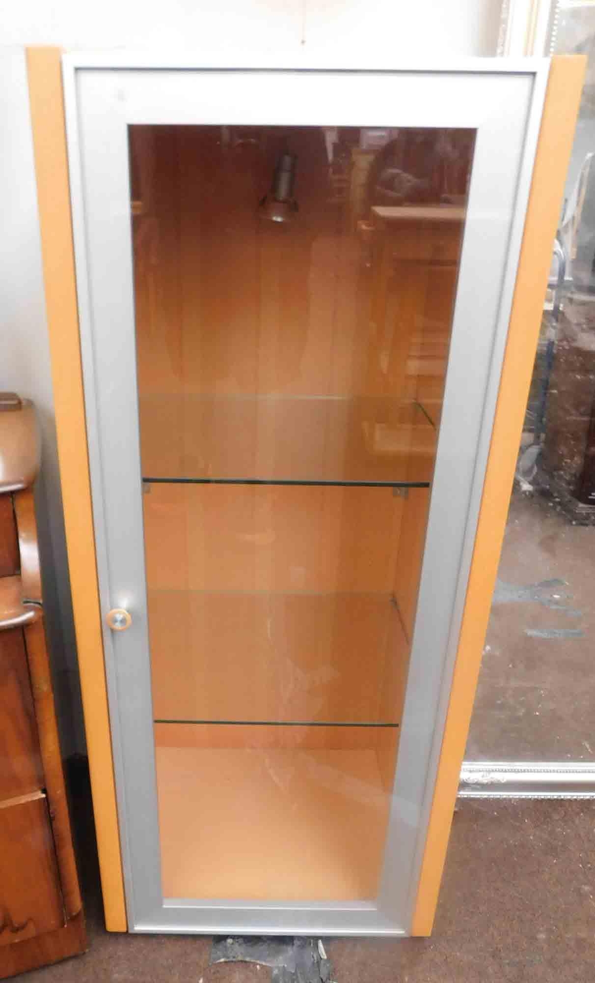Beech coloured glass fronted display cabinet, approx 18x16x42"