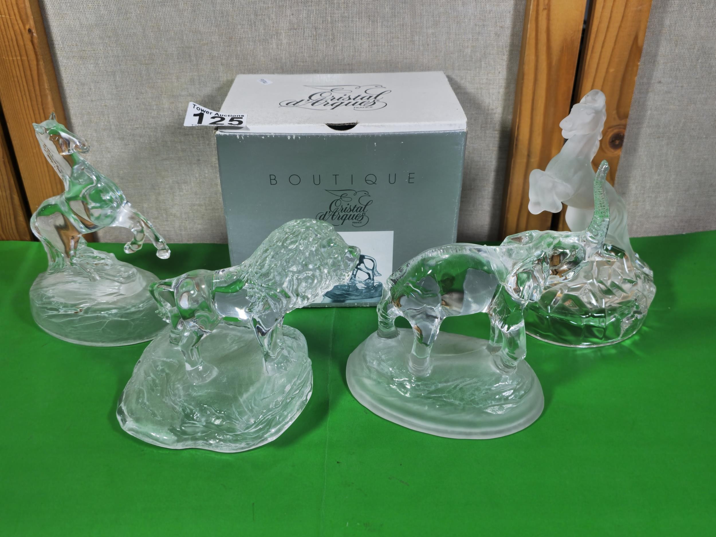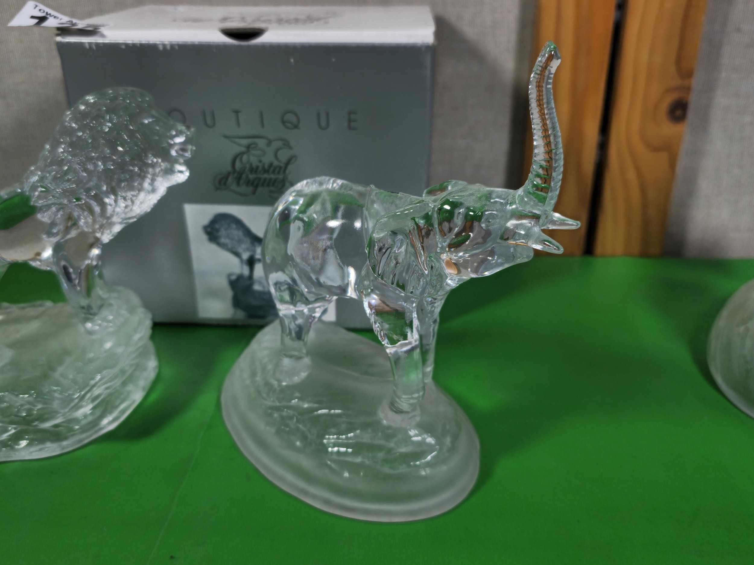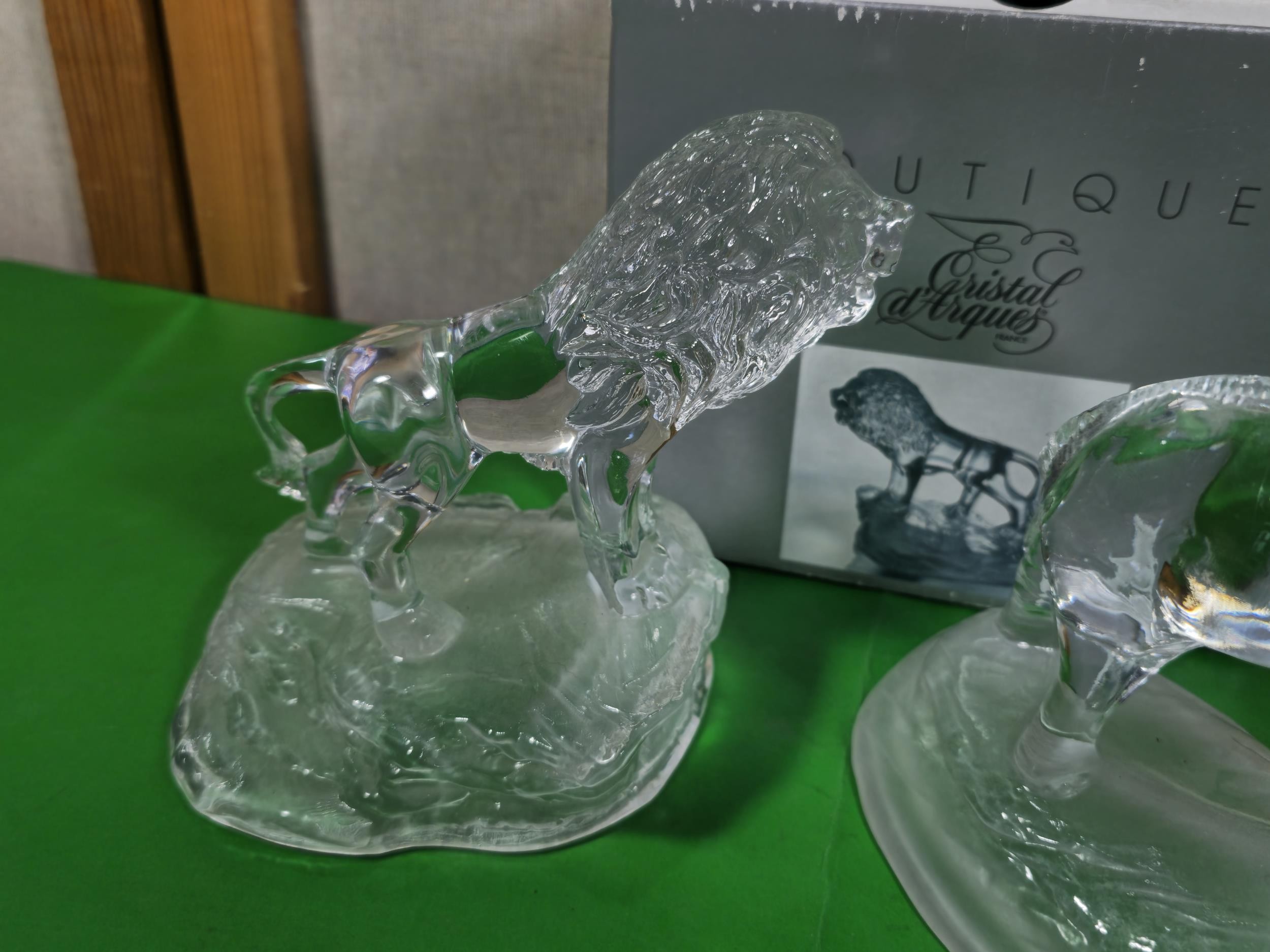 A collection of 4x Cristal D' Arques France glass animal figures to include a lion, an elephant, a horse and an opaque horse, all in good order the lion comes with its box, the tallest piece stands at 17cm high