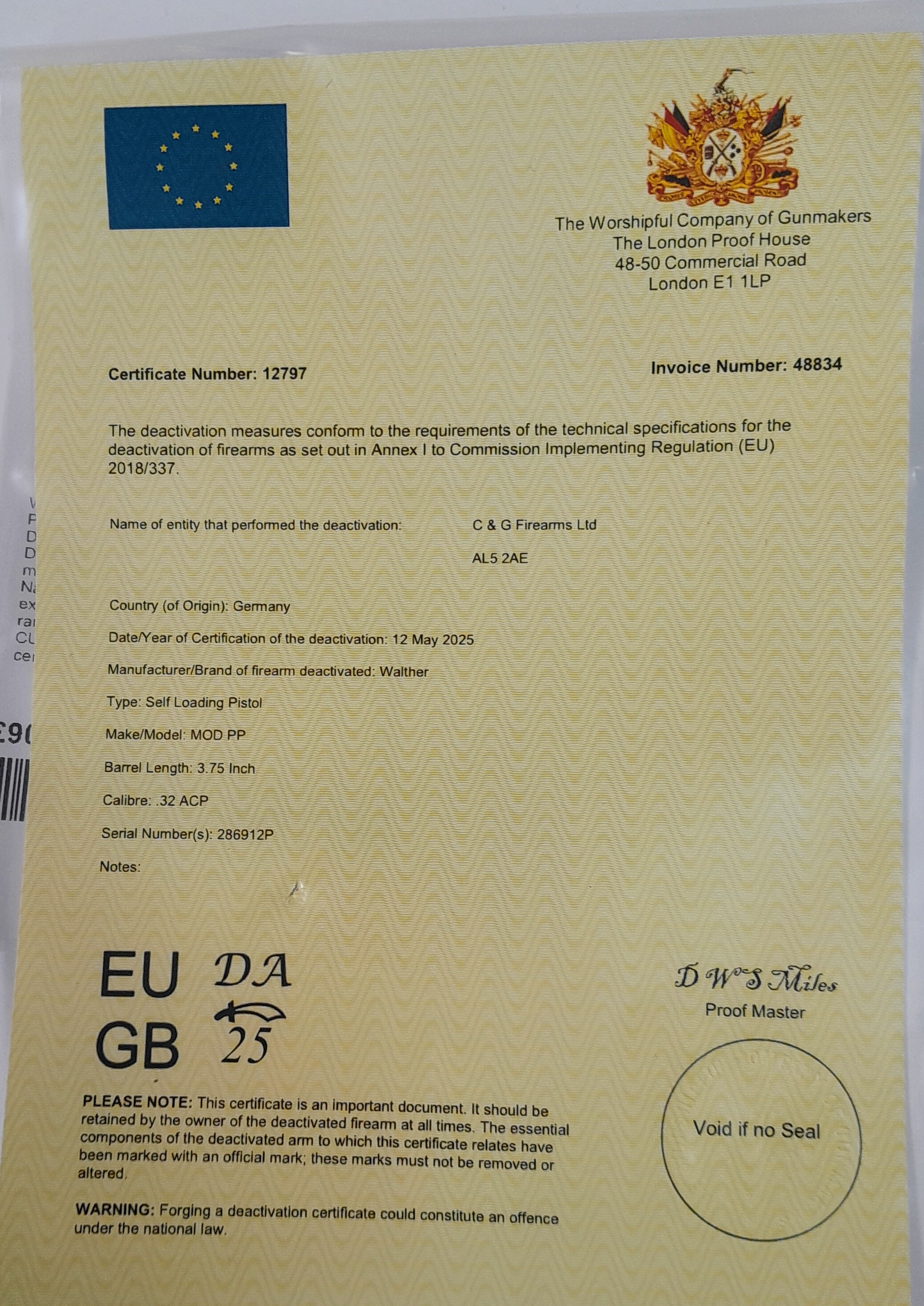 A deactivated Walther MOD PP self loading pistol, 3.75 inch barrel length, .32 ACP calibre. UK/EU Sales only - Not Holland. Comes with an EU deactivation certificate.