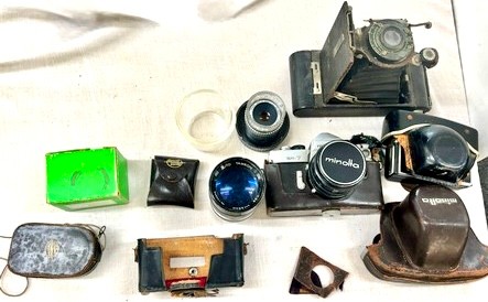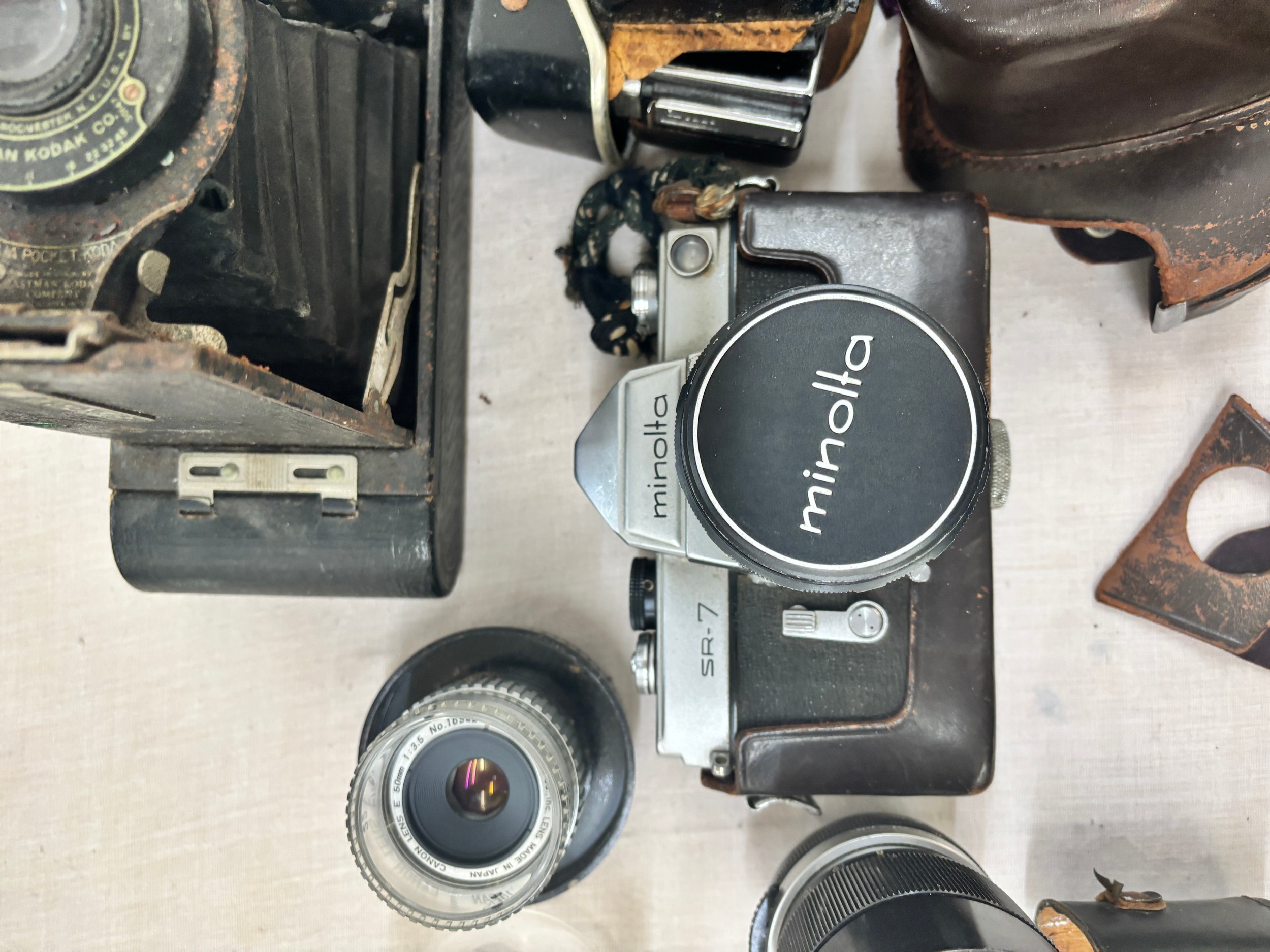 Selection of vintage and later cameras and lenses includes Minolta SR 7 etc