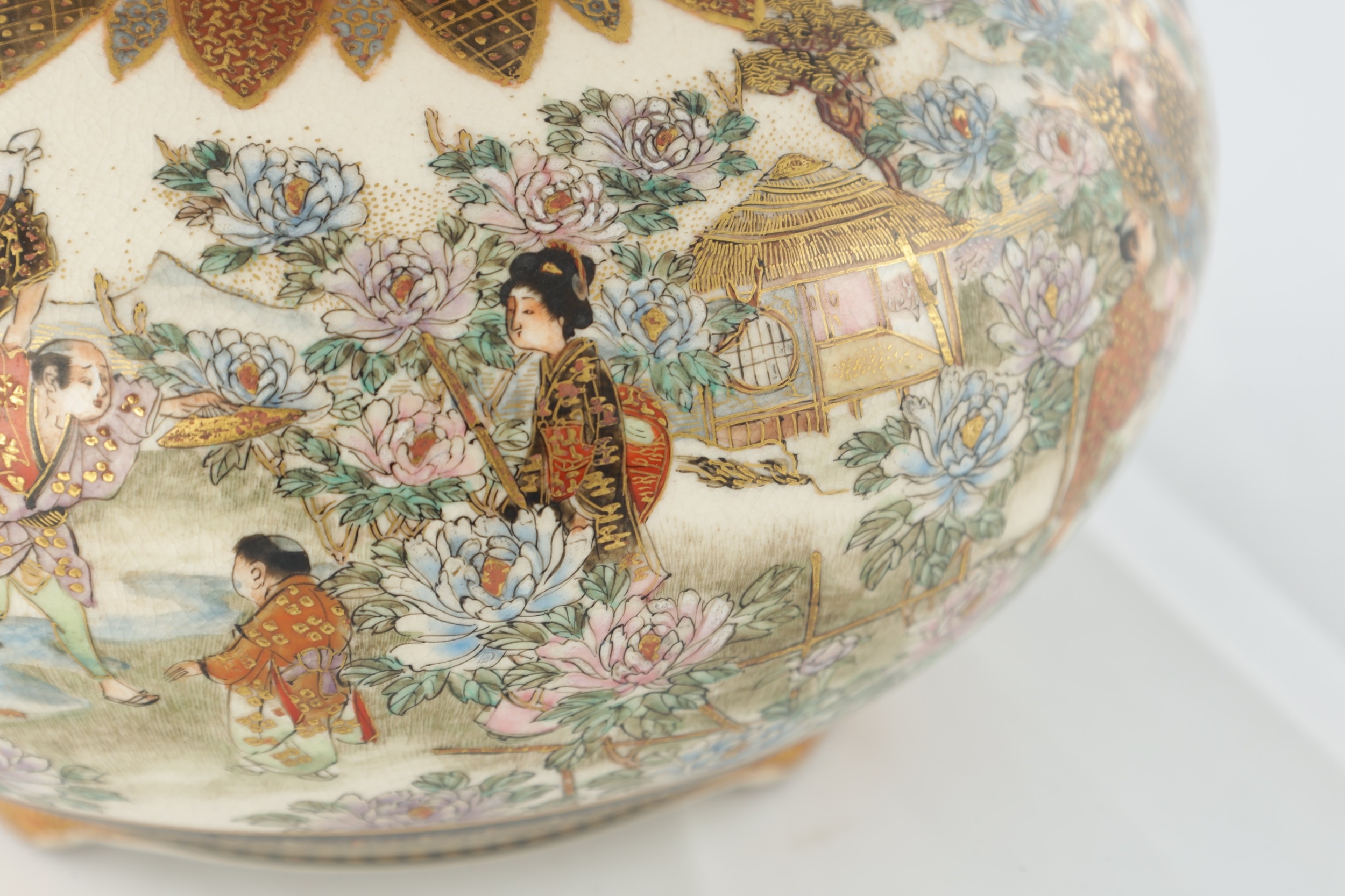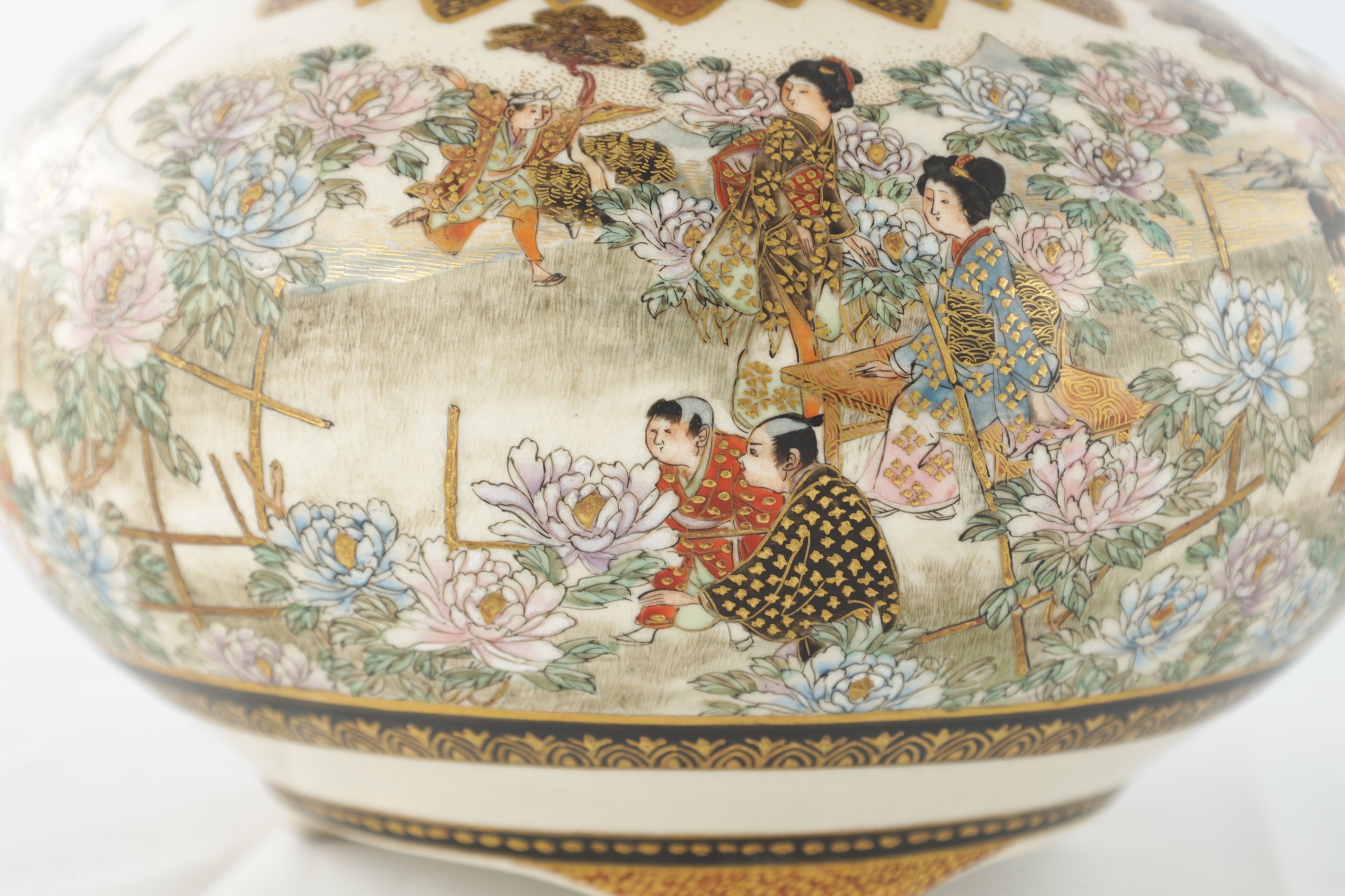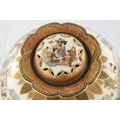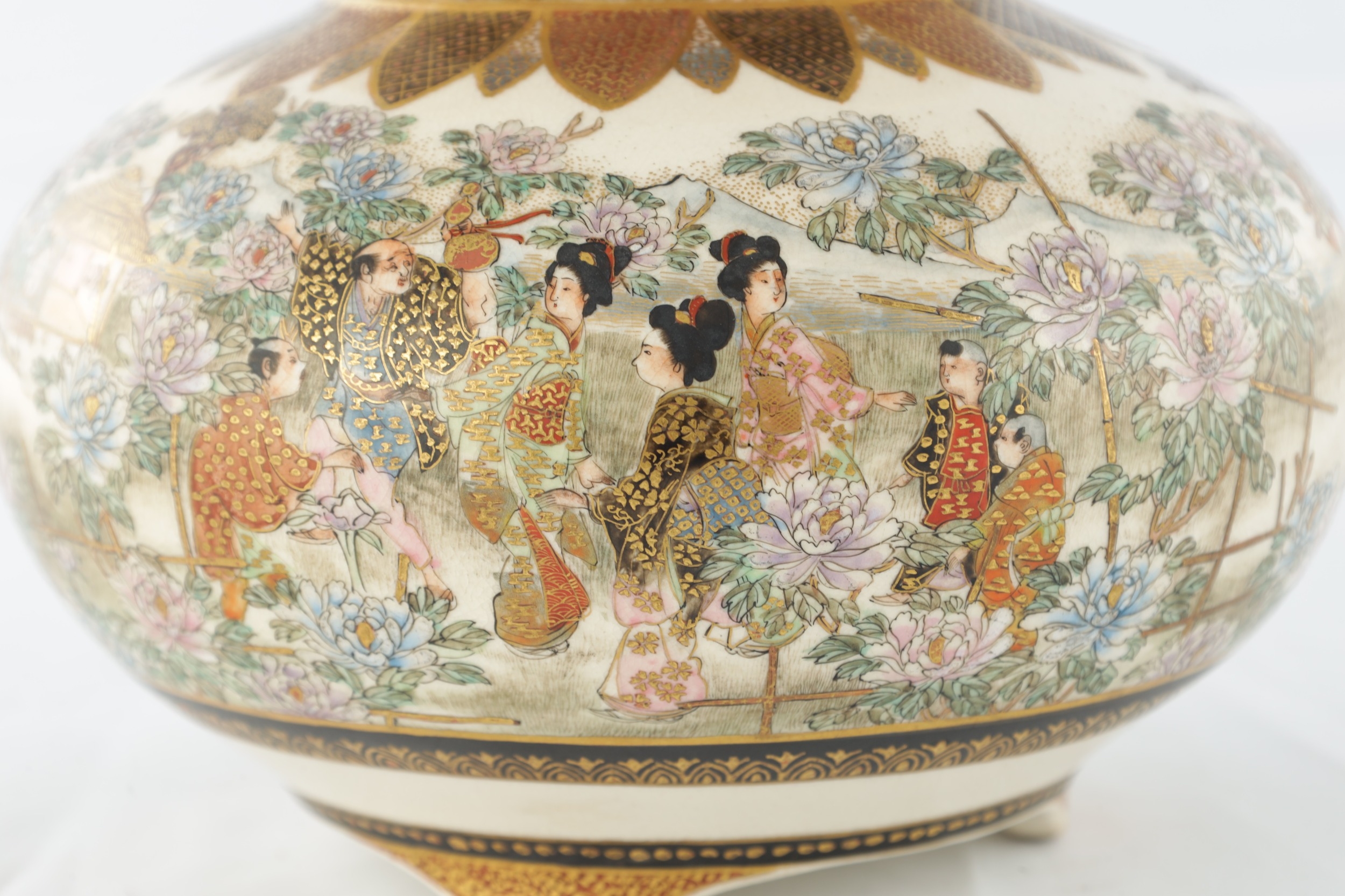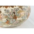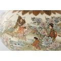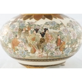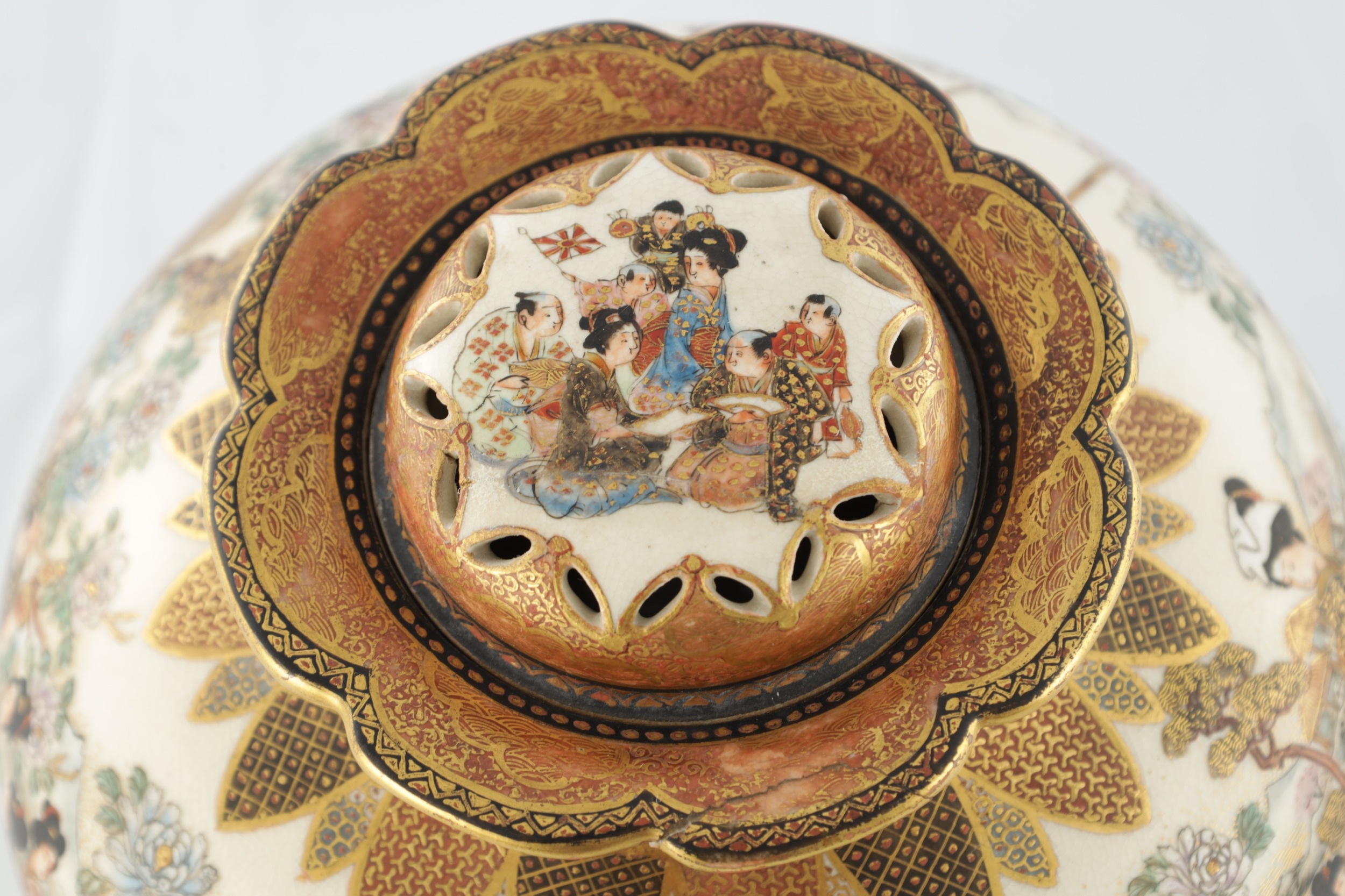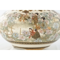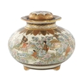 A JAPANESE MEIJI PERIOD SATSUMA KORO OF BULBOUS FORM decorated with continuous figural landscape, having pierced lid with petal shaped rim - signed signature beneath (15cm diameter 12.5cm high )