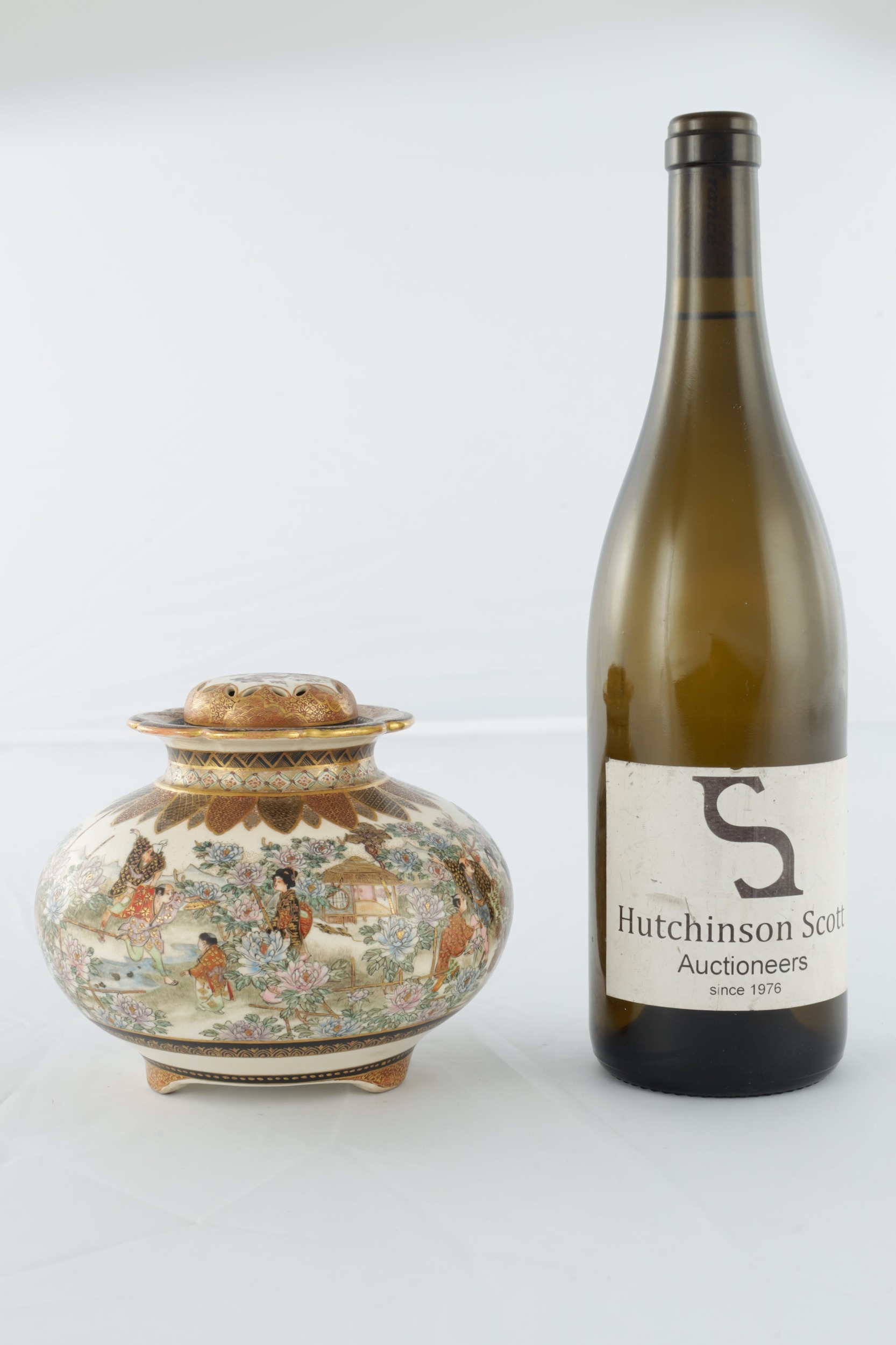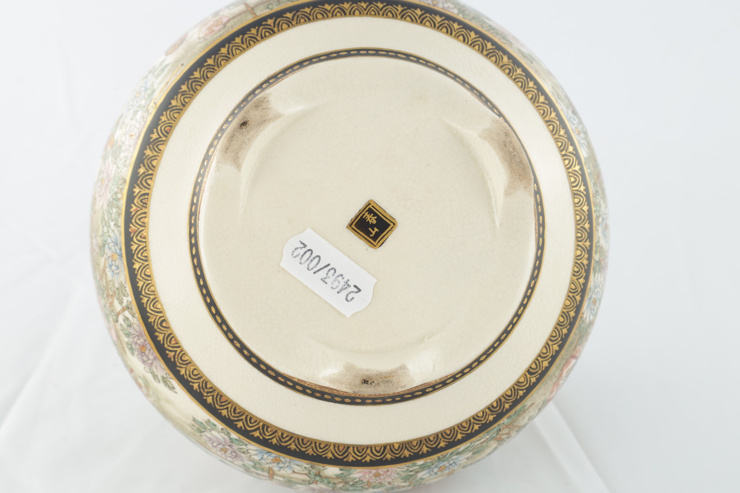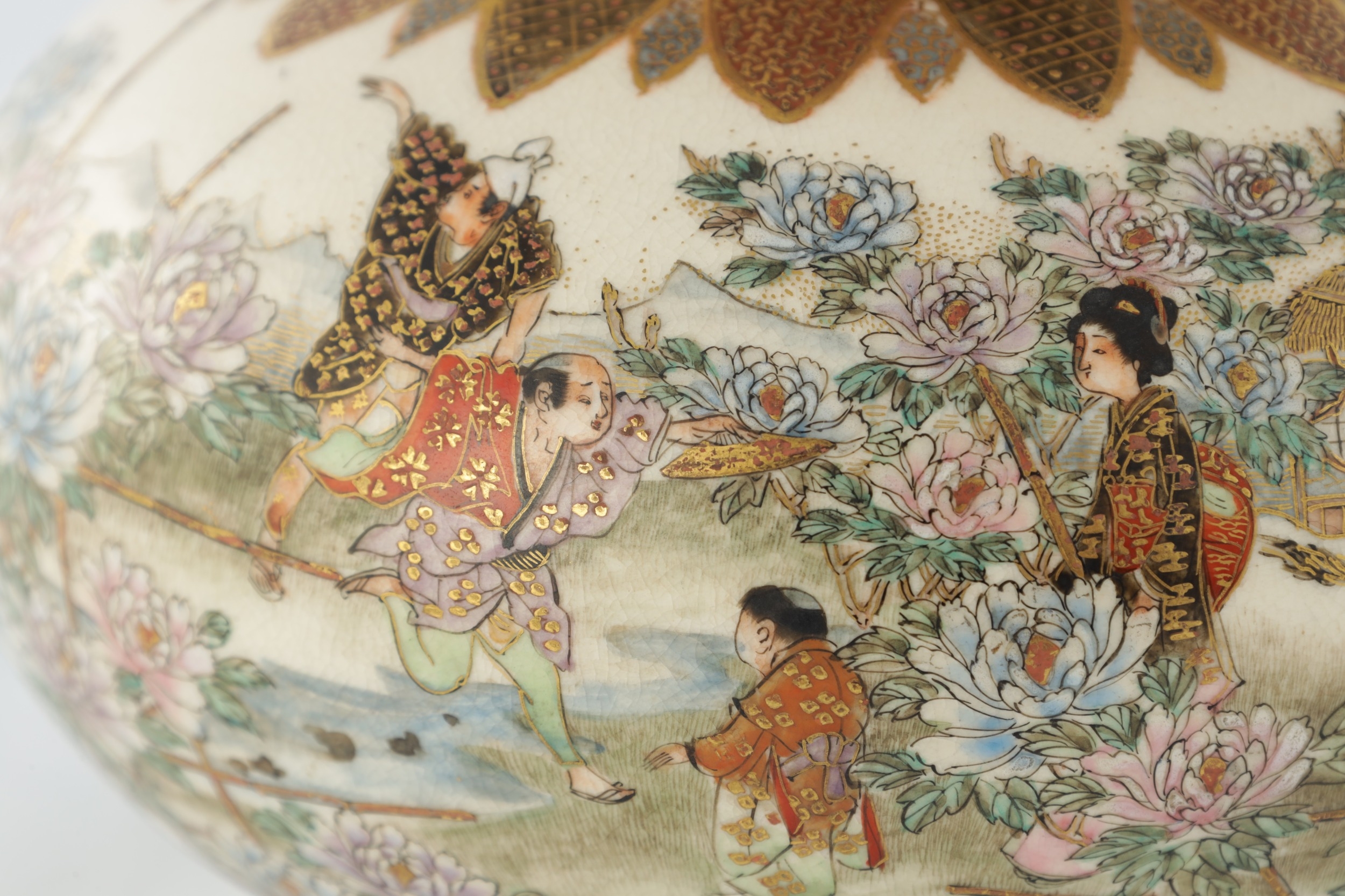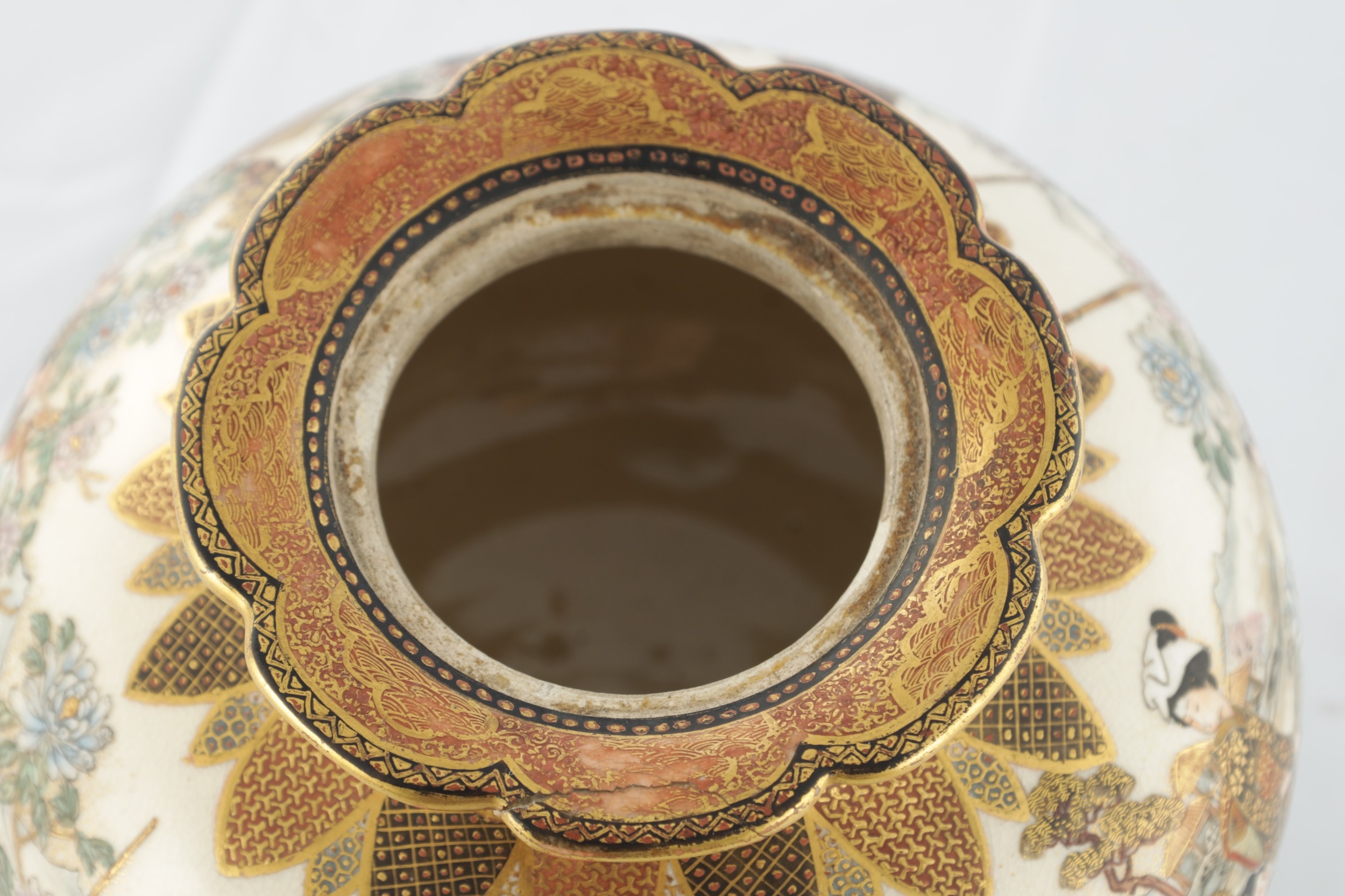 A JAPANESE MEIJI PERIOD SATSUMA KORO OF BULBOUS FORM decorated with continuous figural landscape, having pierced lid with petal shaped rim - signed signature beneath (15cm diameter 12.5cm high )