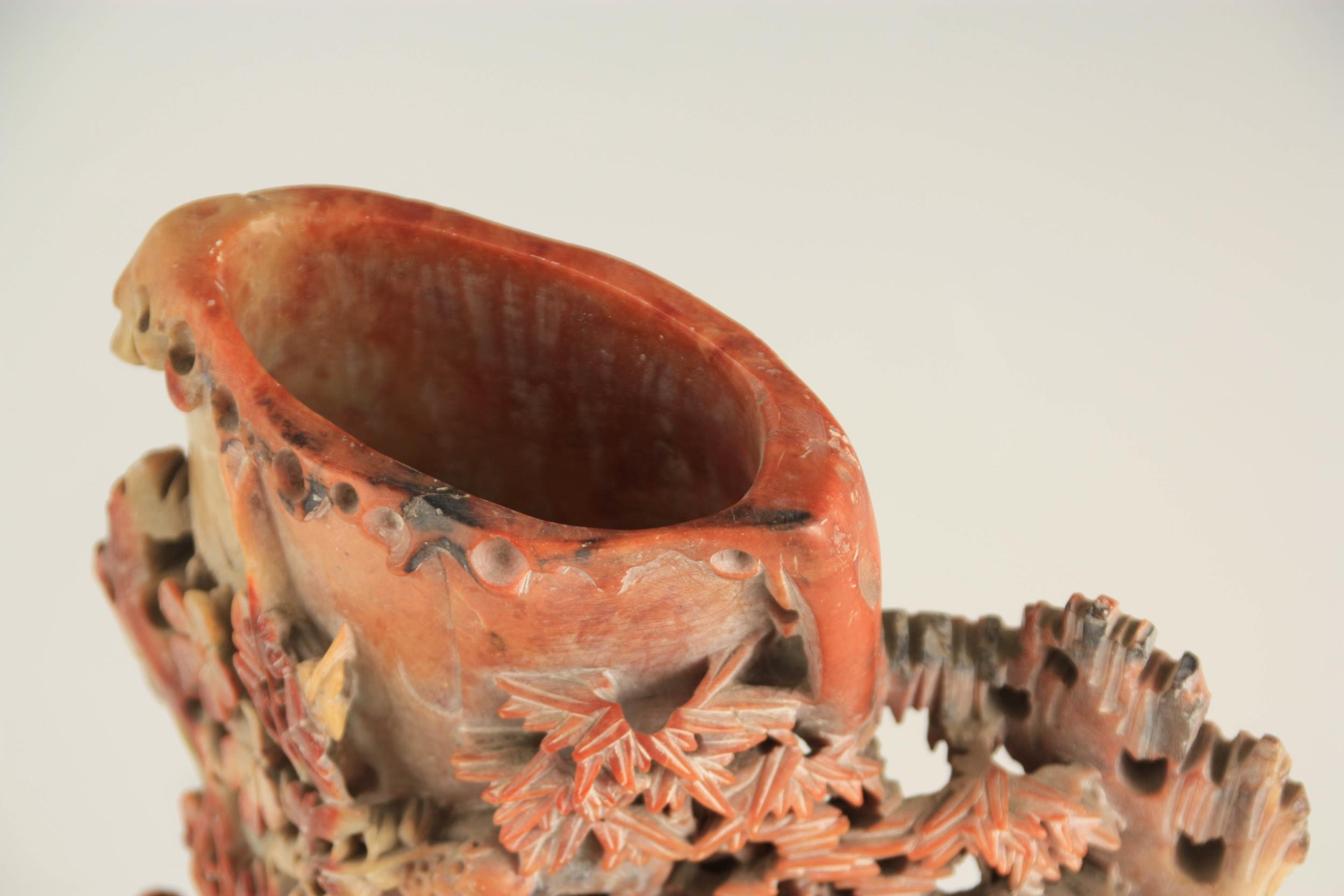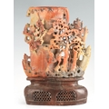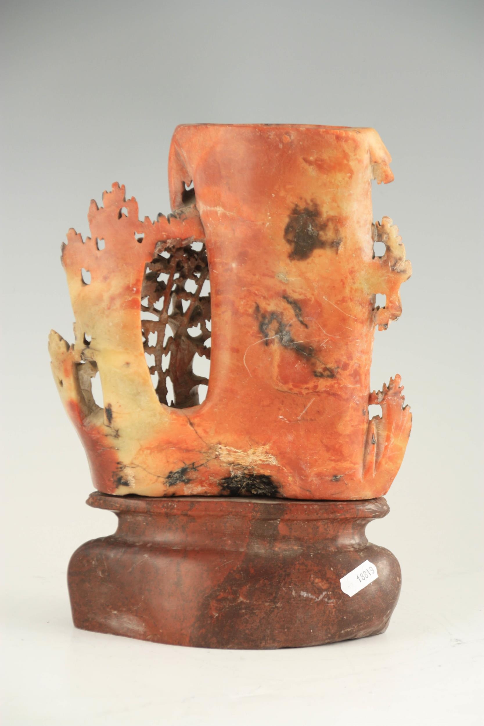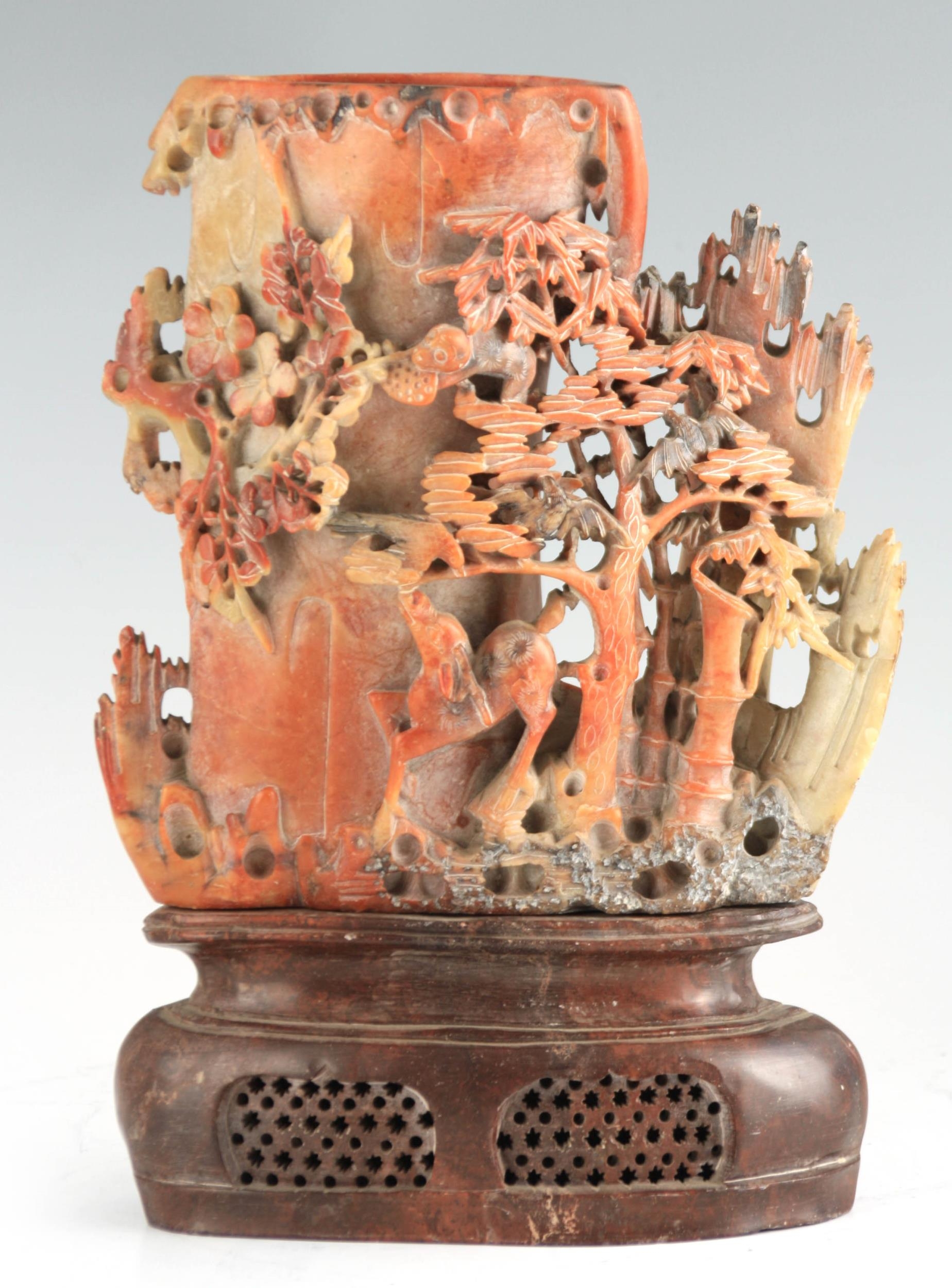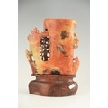A LATE 19TH CENTURY CHINESE SOAPSTONE VASE ON STAND with finely carved woodland animals amongst trees, mounted on a carved stone base. (31cm high)