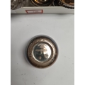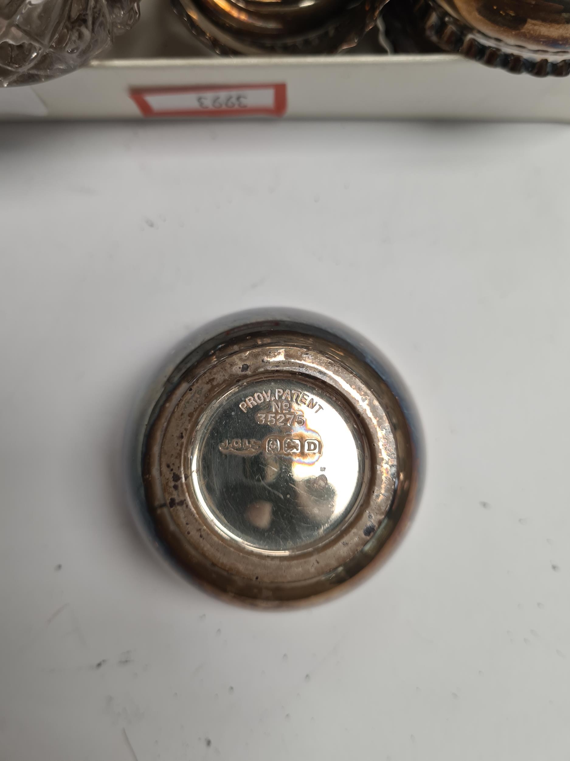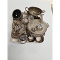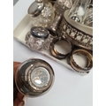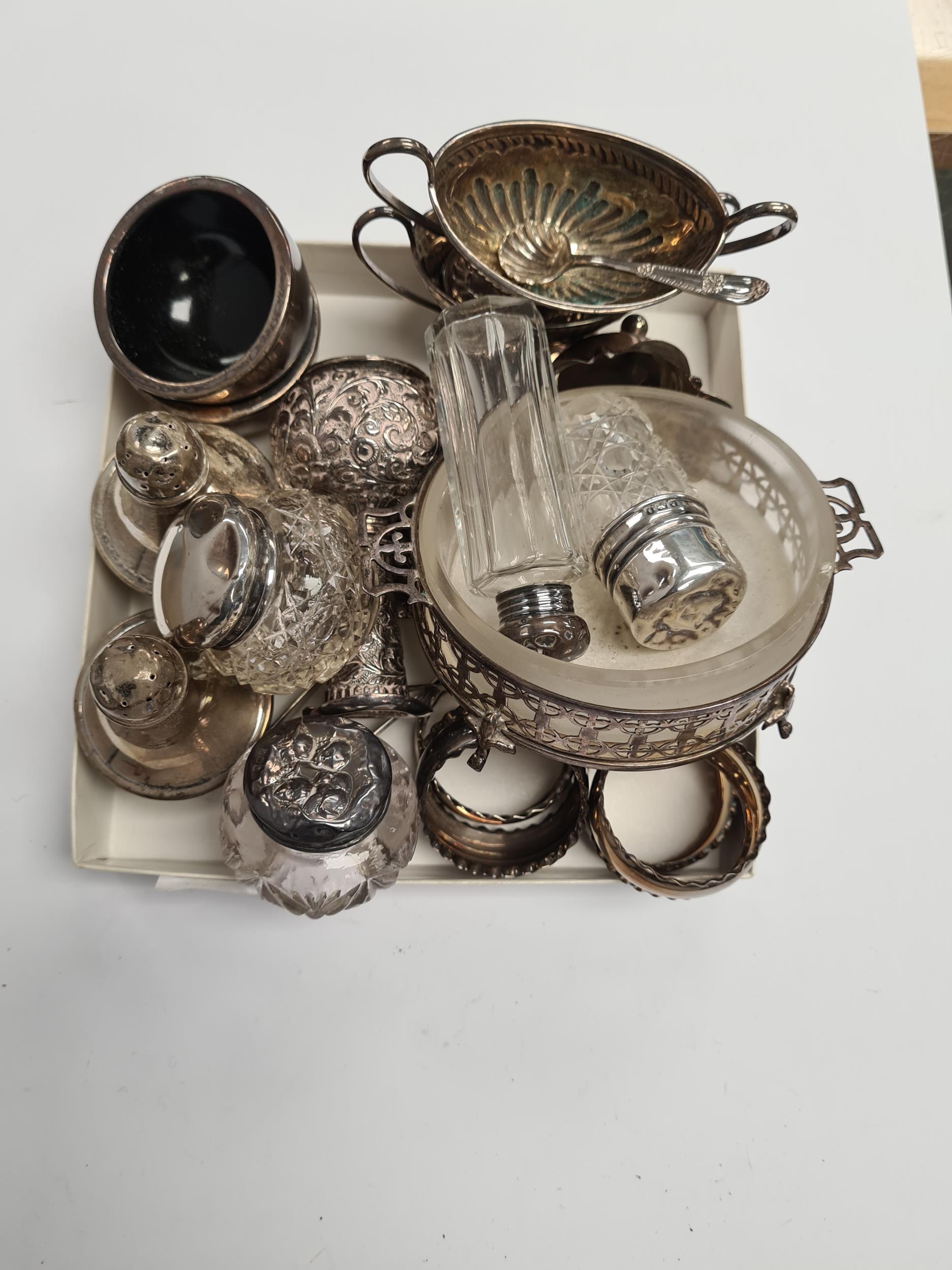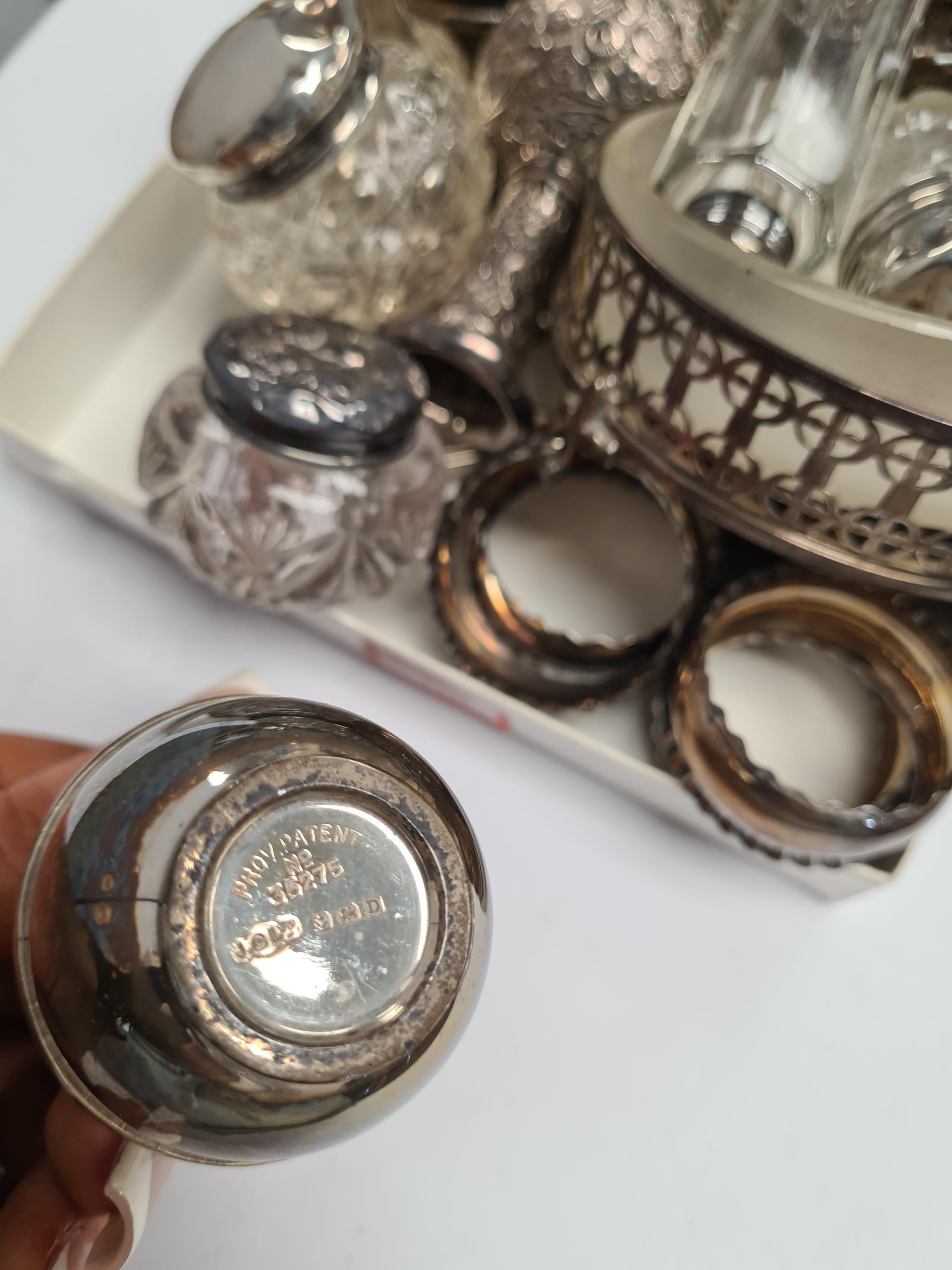 A quantity of silver items to include a set of napkin rings, silver topped cut glass bottles, mustards, salt set with pepper, tongs etc. Only silver 7.18ozt approx. Condition Report: Some denting and wear