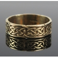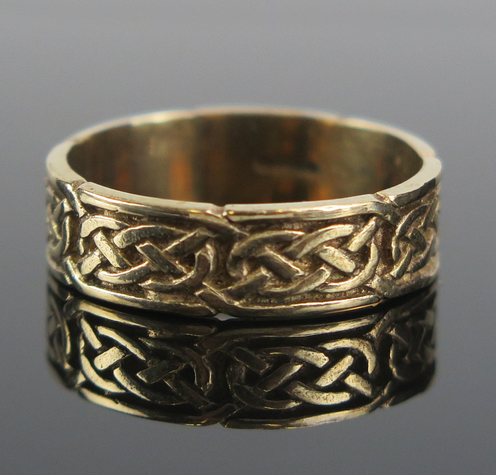 A 9ct gold Celtic knot band, 6mm wide, size S.5, 4.48g. Made by Shipton & Co. and in its original box