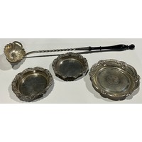 An Edwardian silver tankard mustard, pierced sides, Birmingham 1905, 42g, EP spoon; a George V silver capstan inkwell, glass liner, Birmingham 1918, 97g gross; four silver napkin rings, 116g; an unmarked tea strainer, 33g (7)