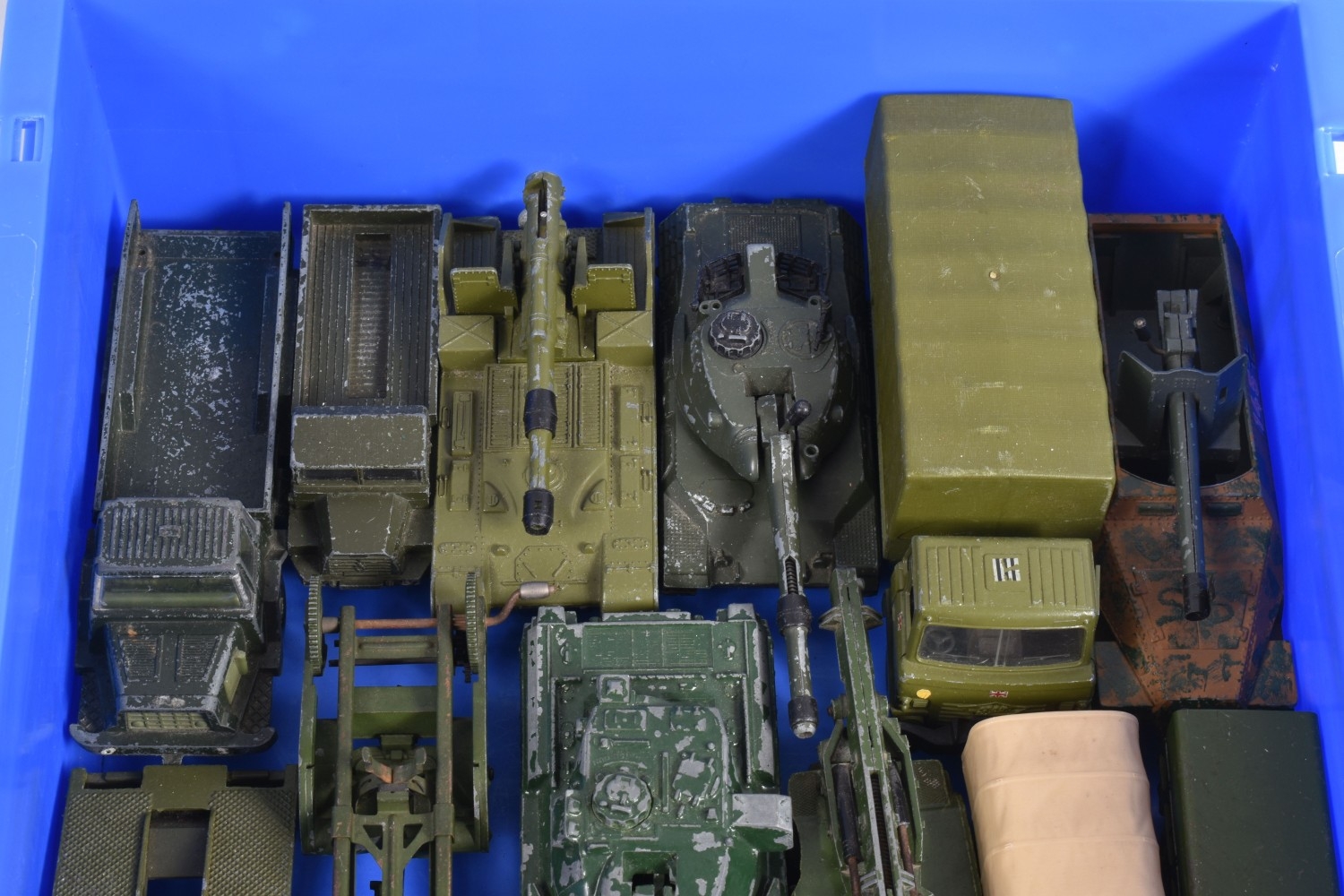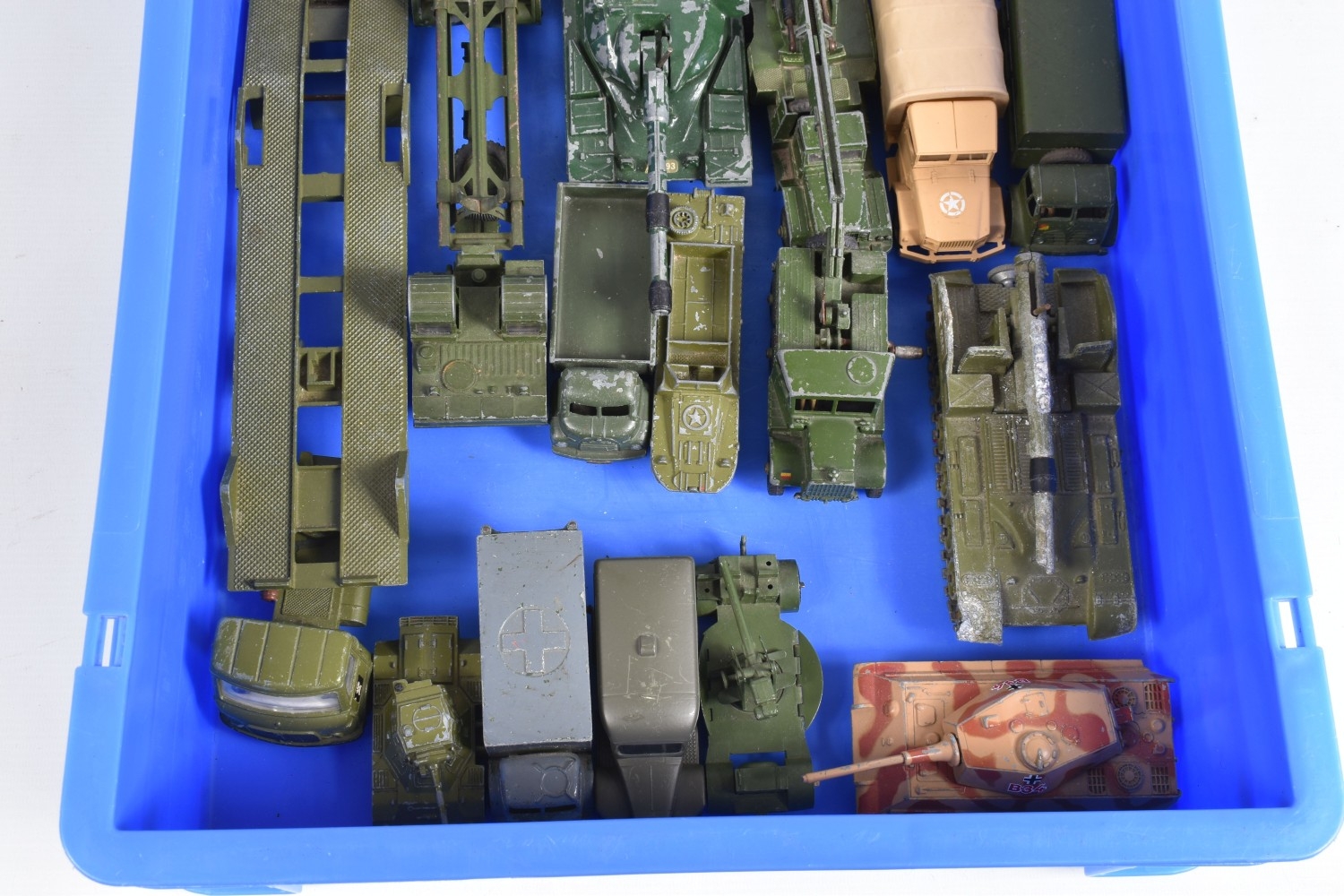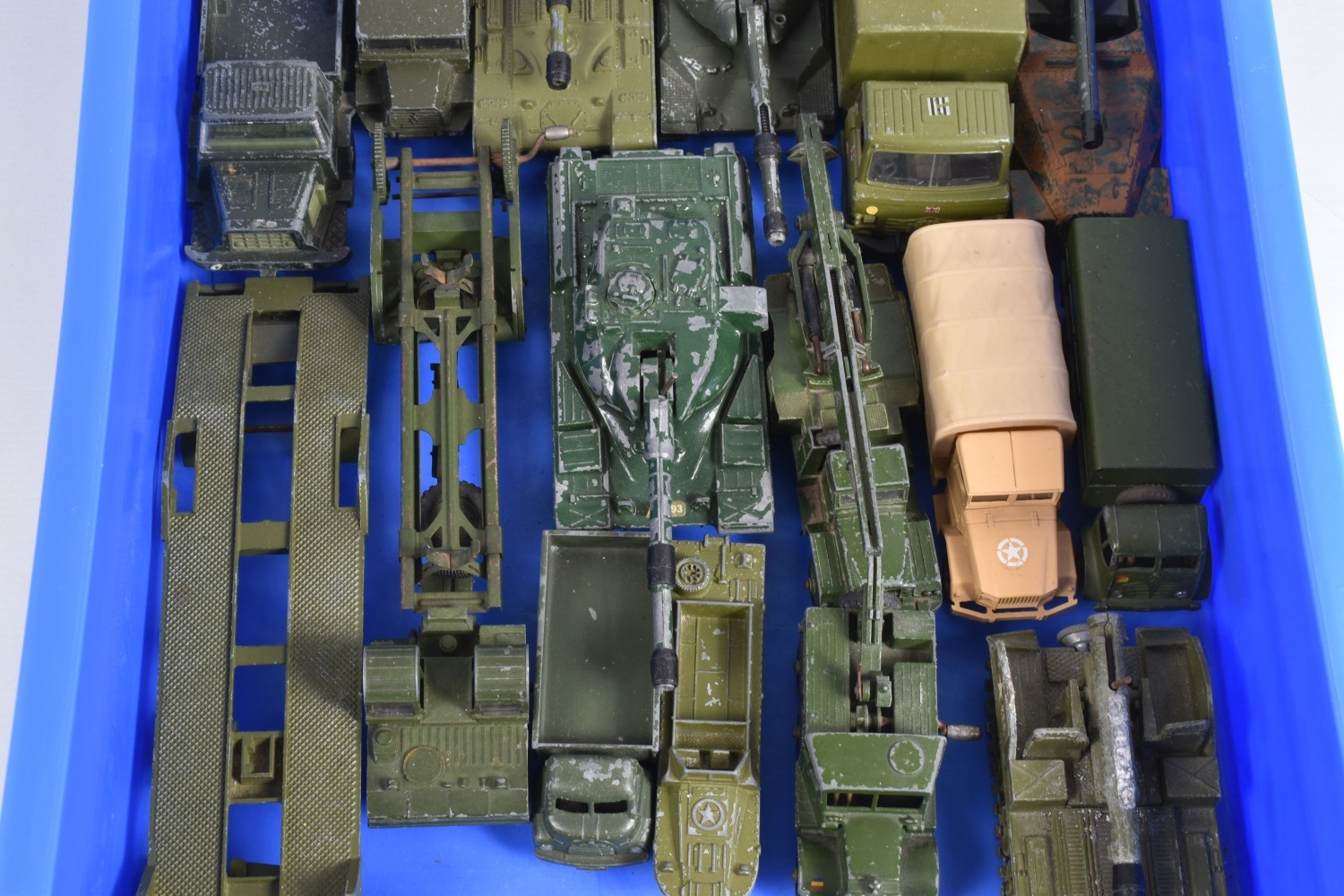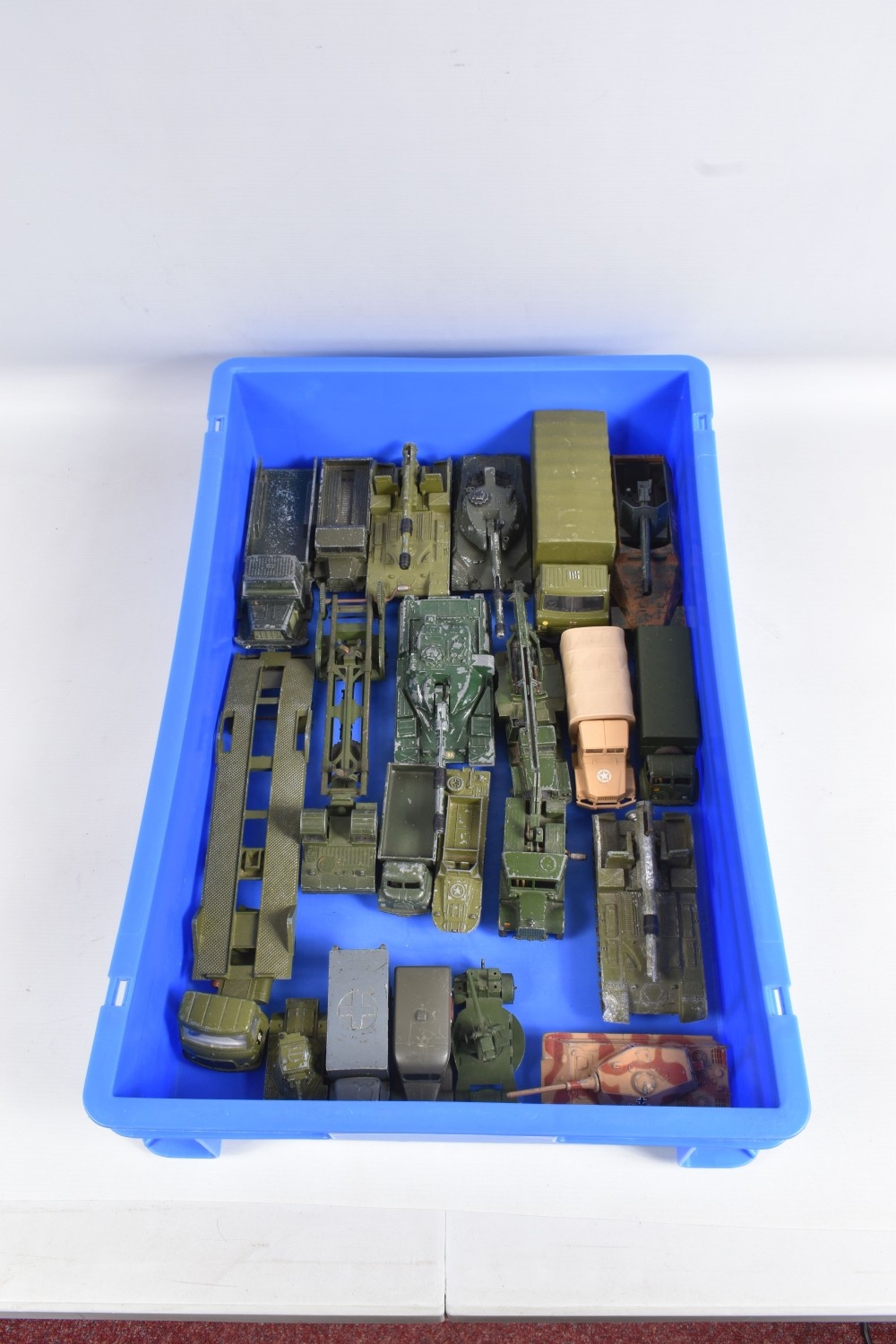 A QUANTITY OF UNBOXED ASSORTED PLAYWORN DIECAST MILITARY VEHICLES, various Dinky, Corgi, Solido and Crescent models, to include Dinky Anti-Aircraft Gun on Trailer, No.161b, Foden 10T Truck, No.622, Hanomag Tank Destroyer, No.694, Solido Kaiser Jeep M34 6x6 Truck, No.245, majority in playworn condition with paint loss, marking and wear, some with damage and/or missing parts, all missing ammunition, includes some repainted items