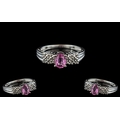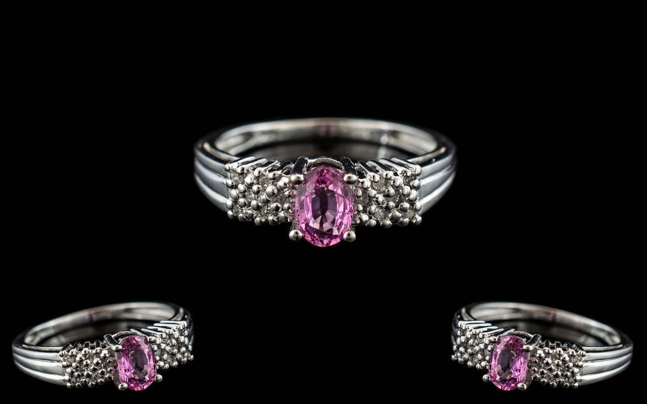 Ladies - Attractive 10ct White Gold Pink Sapphire and Diamond Set Dress Ring. Marked 9ct Gold to Interior of Shank. The Faceted Pink Sapphire of Excellent Colour. Est Weight 0.75 pts. The Diamonds of Good Colour and Clarity. Ring Size M - N. The Shank / Setting In Excellent Condition.