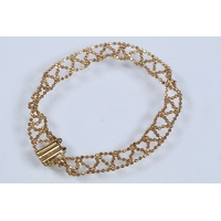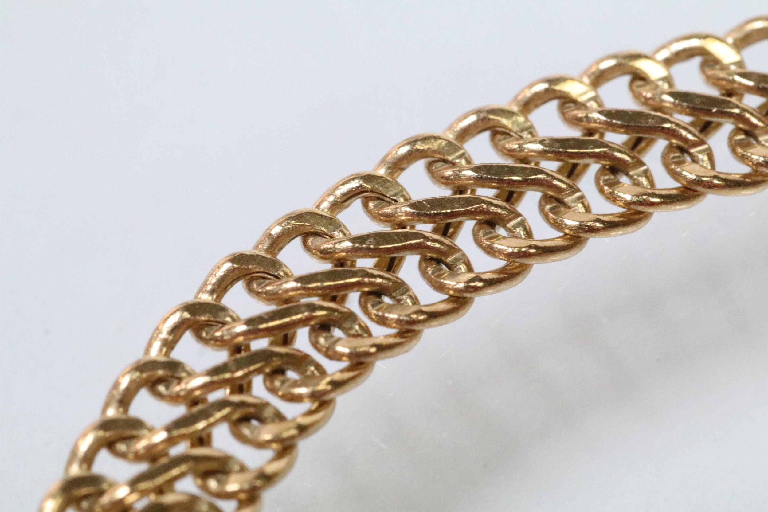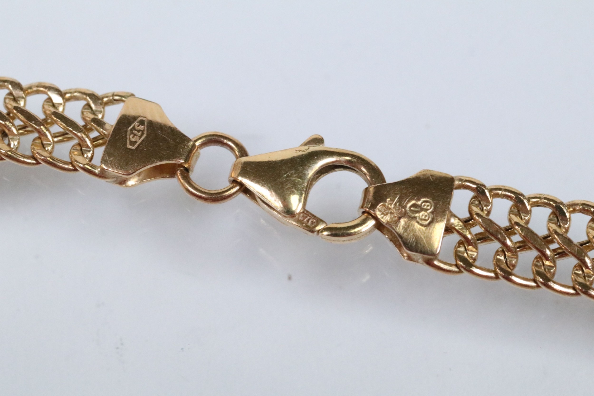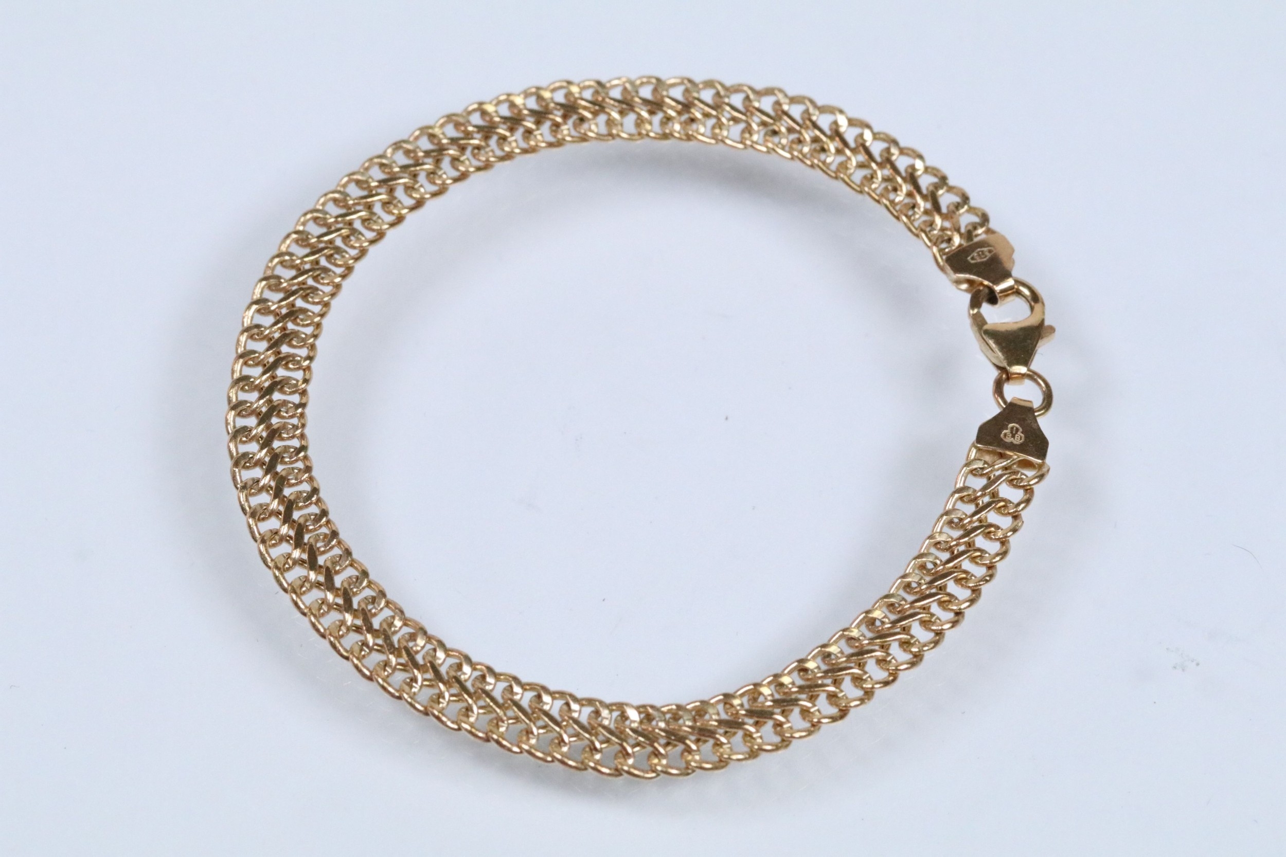 9ct gold double flat link bracelet with lobster clasp. Hallmarked Sheffield to clasp. Measures 7.5 inches.
