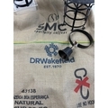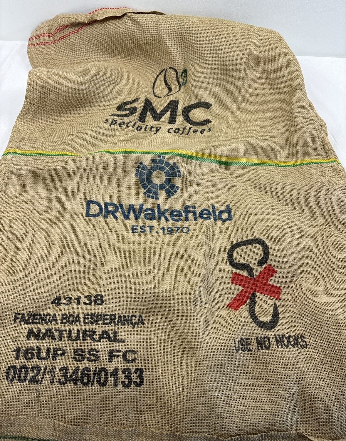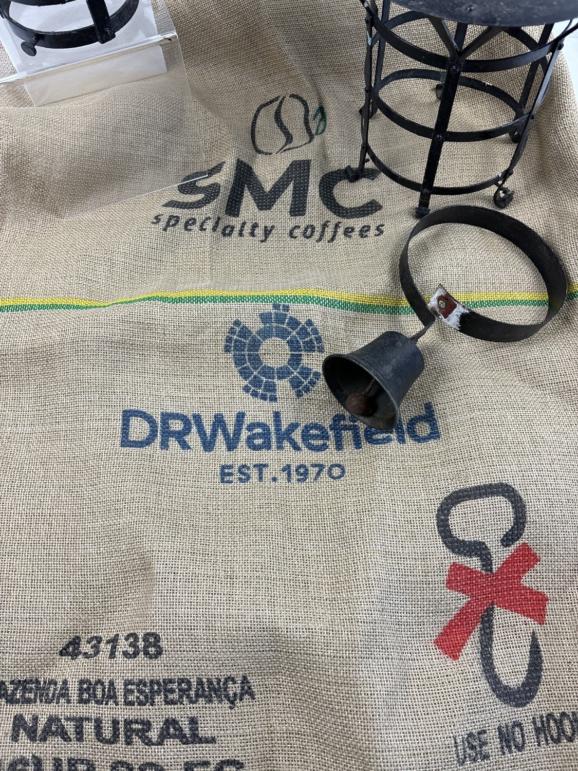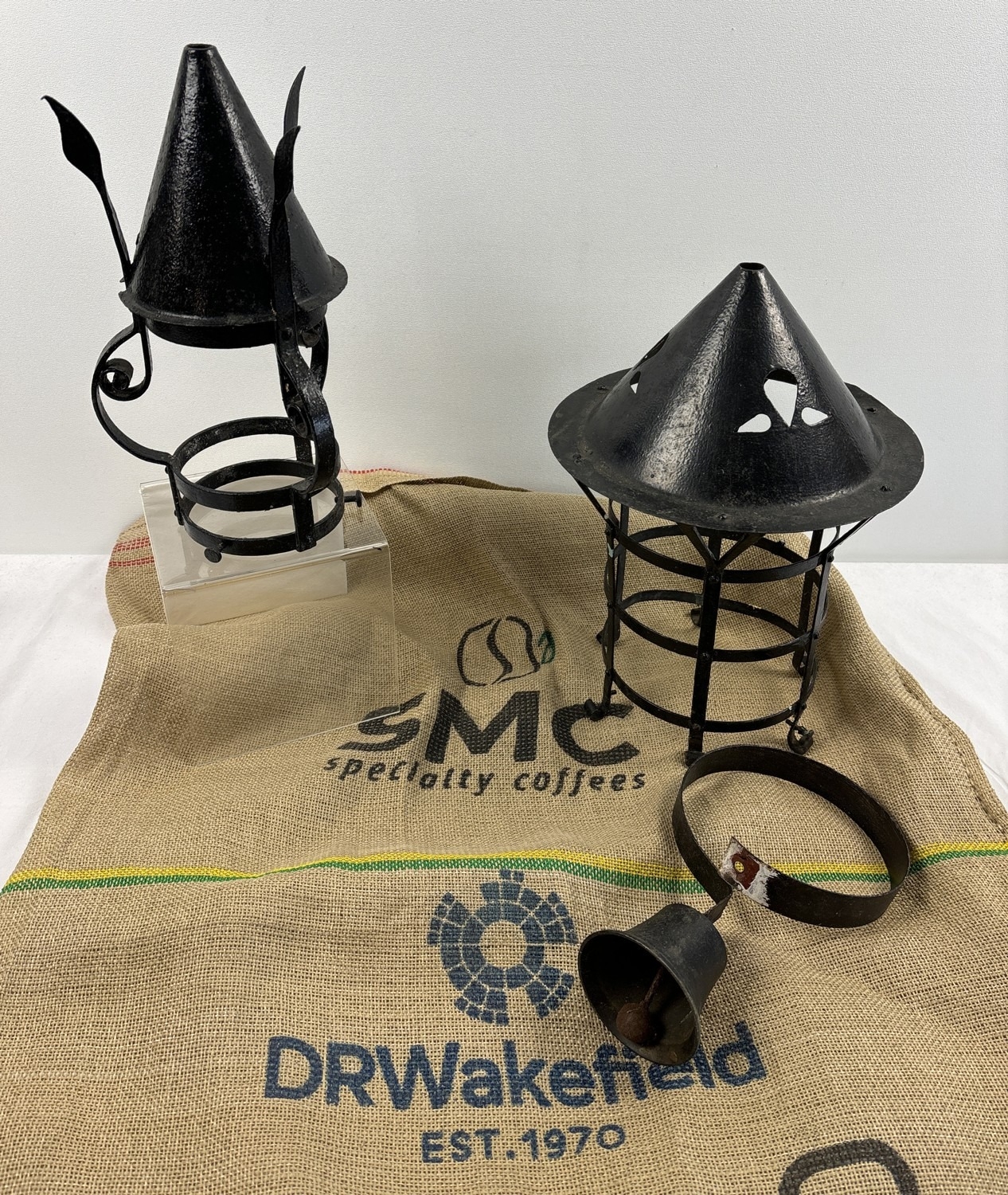 2 vintage black metal lanterns together with an antique shops bell & a hessian advertising sack for SMC special coffees. Tallest lantern approx. 35cm.