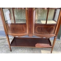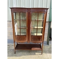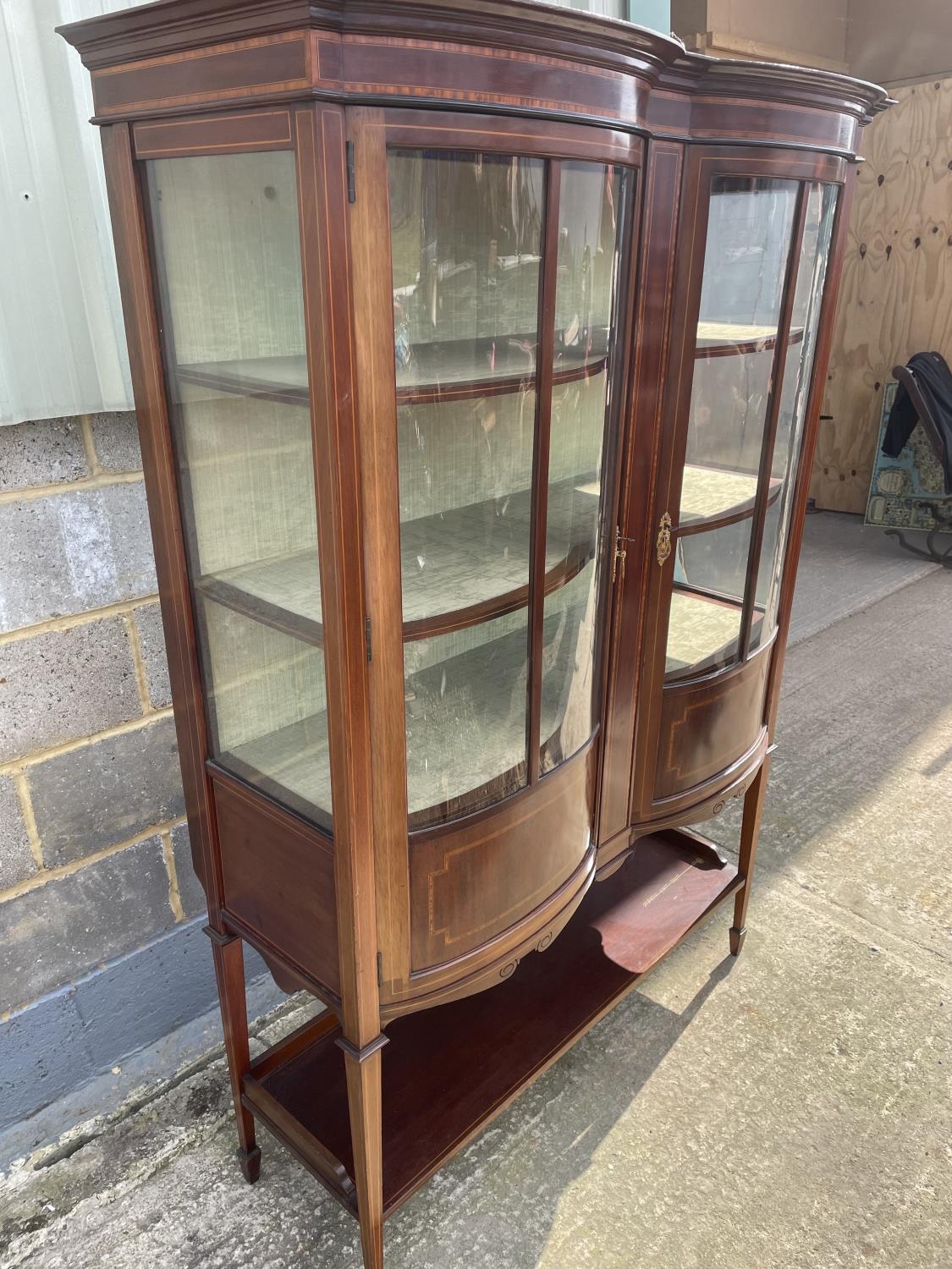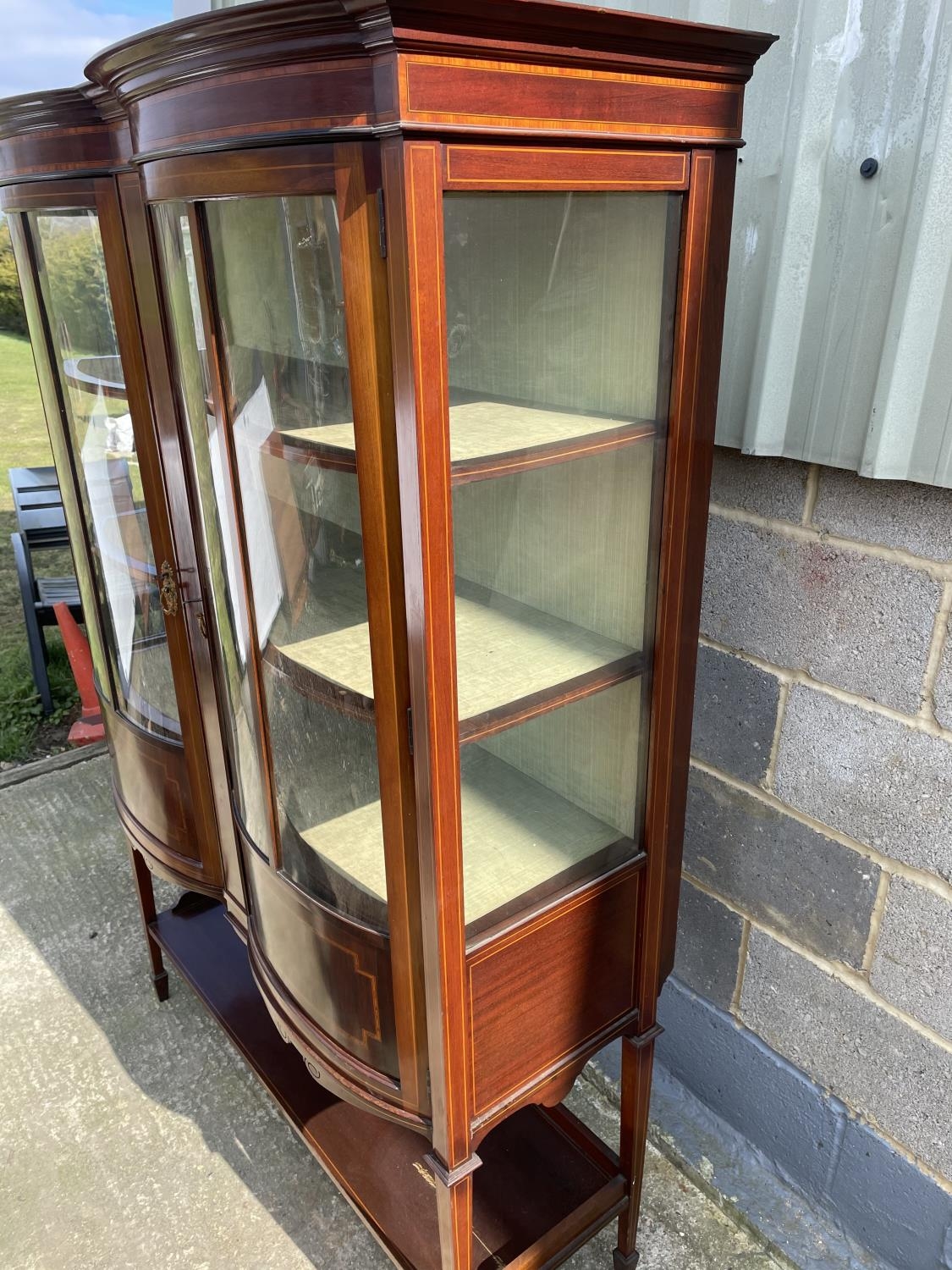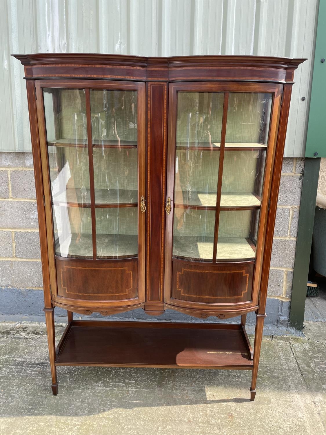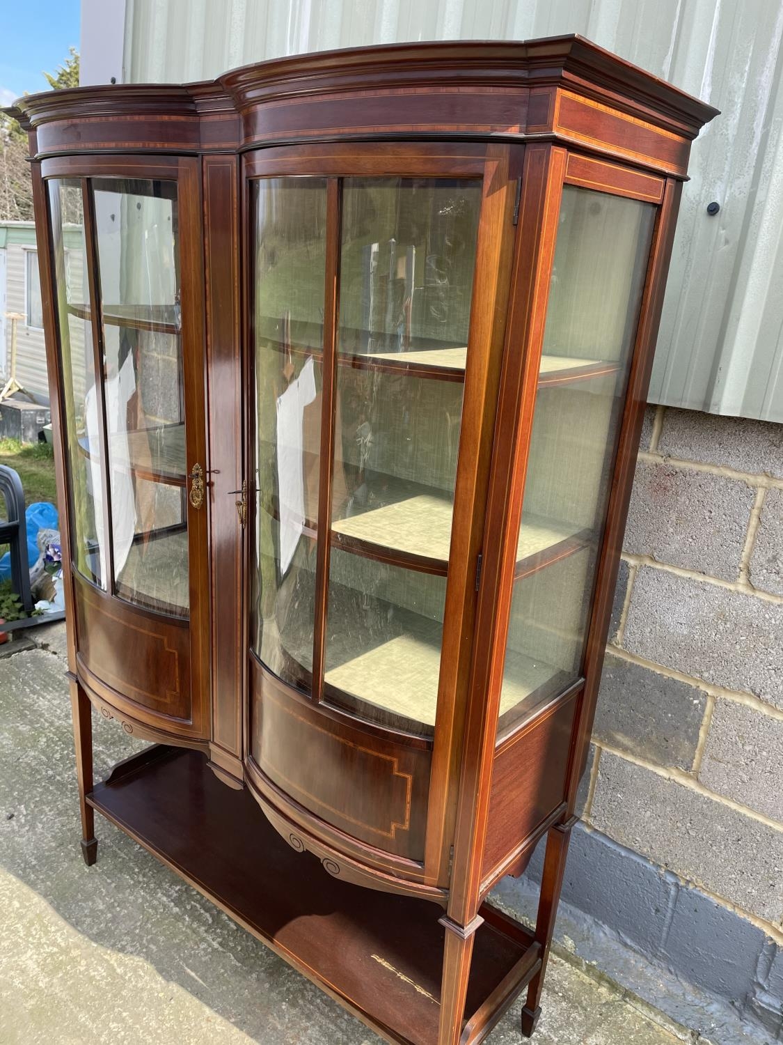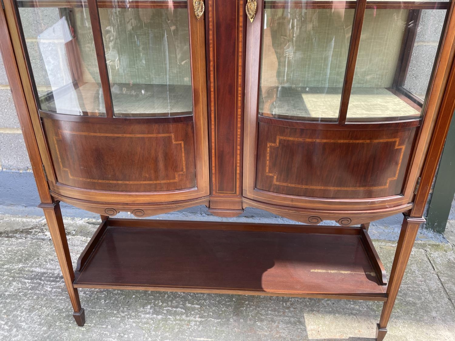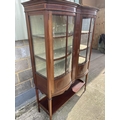 An Edwardian mahogany double bow fronted display cabinet with satin wood inlay, 114 x 45 x 157cm