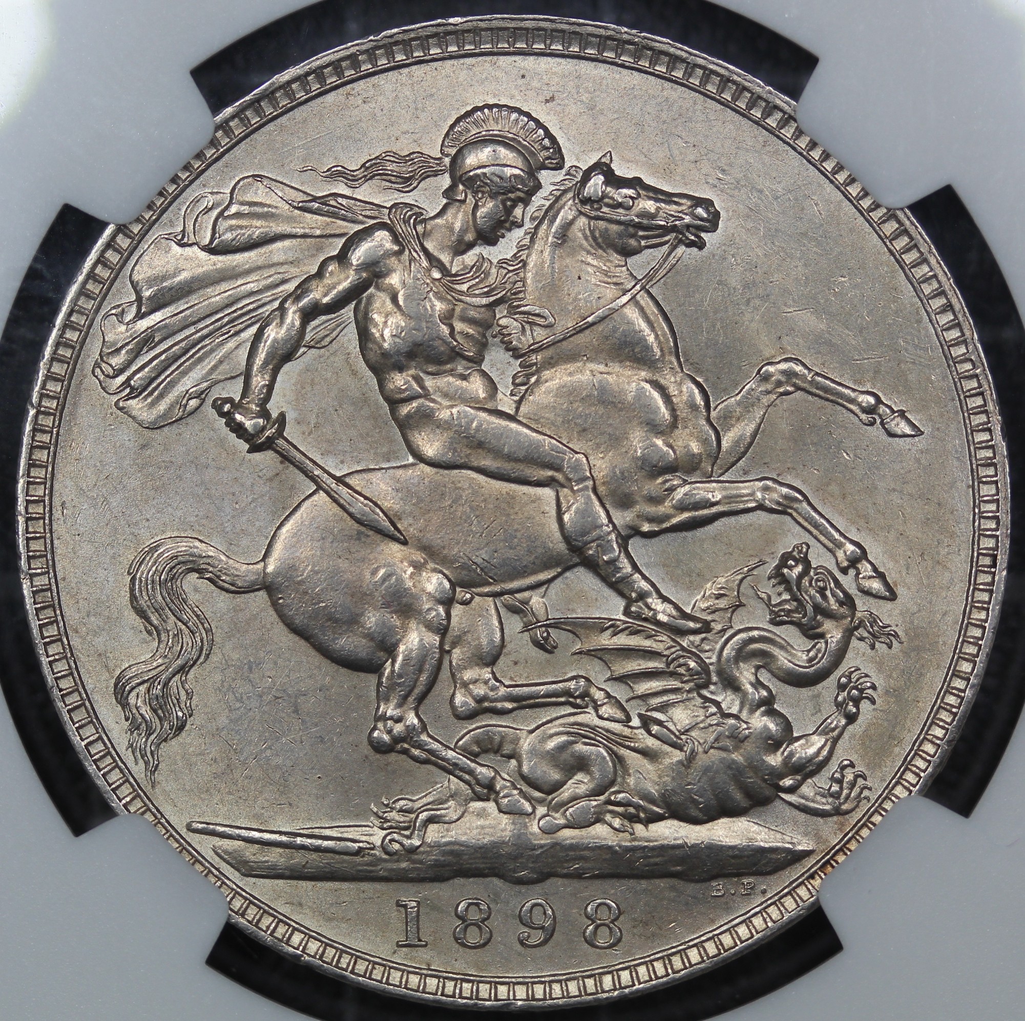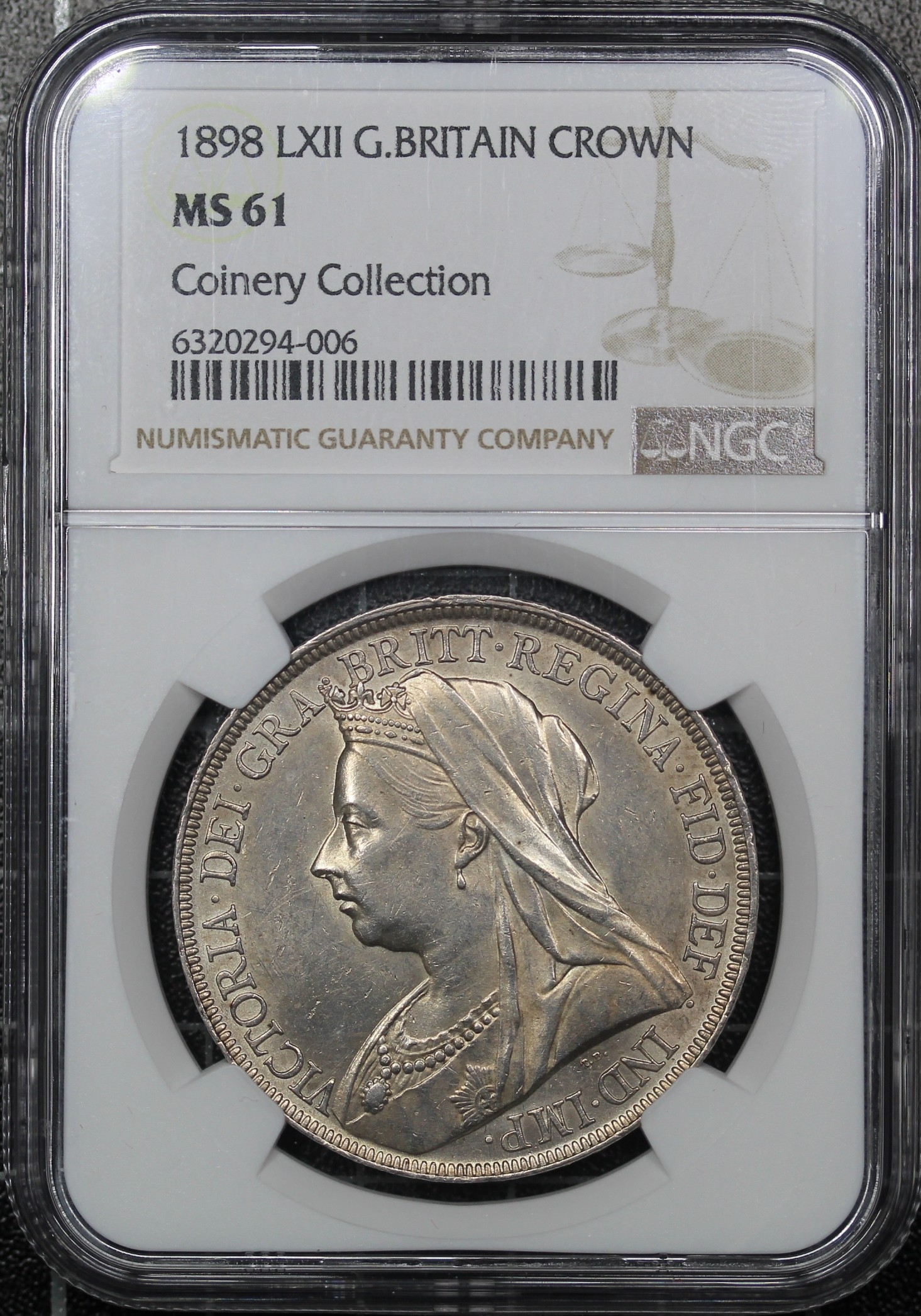 1898 Crown, Edge LXII, Victoria (ESC 315, Bull 2605, S.3937). Davies 527 (Dies 3+E). Graded MS61, gEF, in a Coinery Collection holder with some lustre.