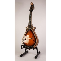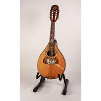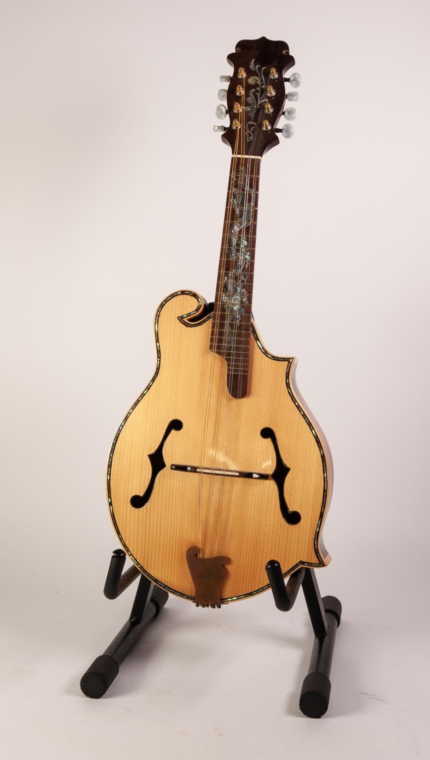 ANTONIOTSAI MODERN EIGHT STRING SCROLL TOP MANDOLIN, with mother of pearl inlay, the back and neck with five toed dragons, the head with meandering leafy foliage, 27” (68.5cm) long, in a hard ‘antique’ brown case