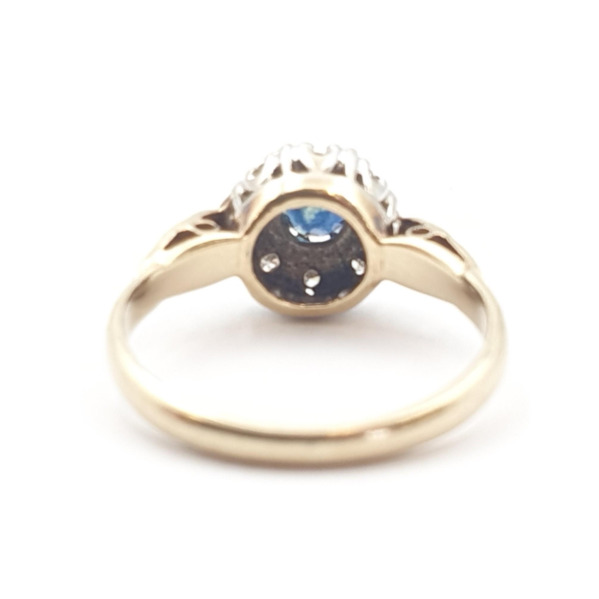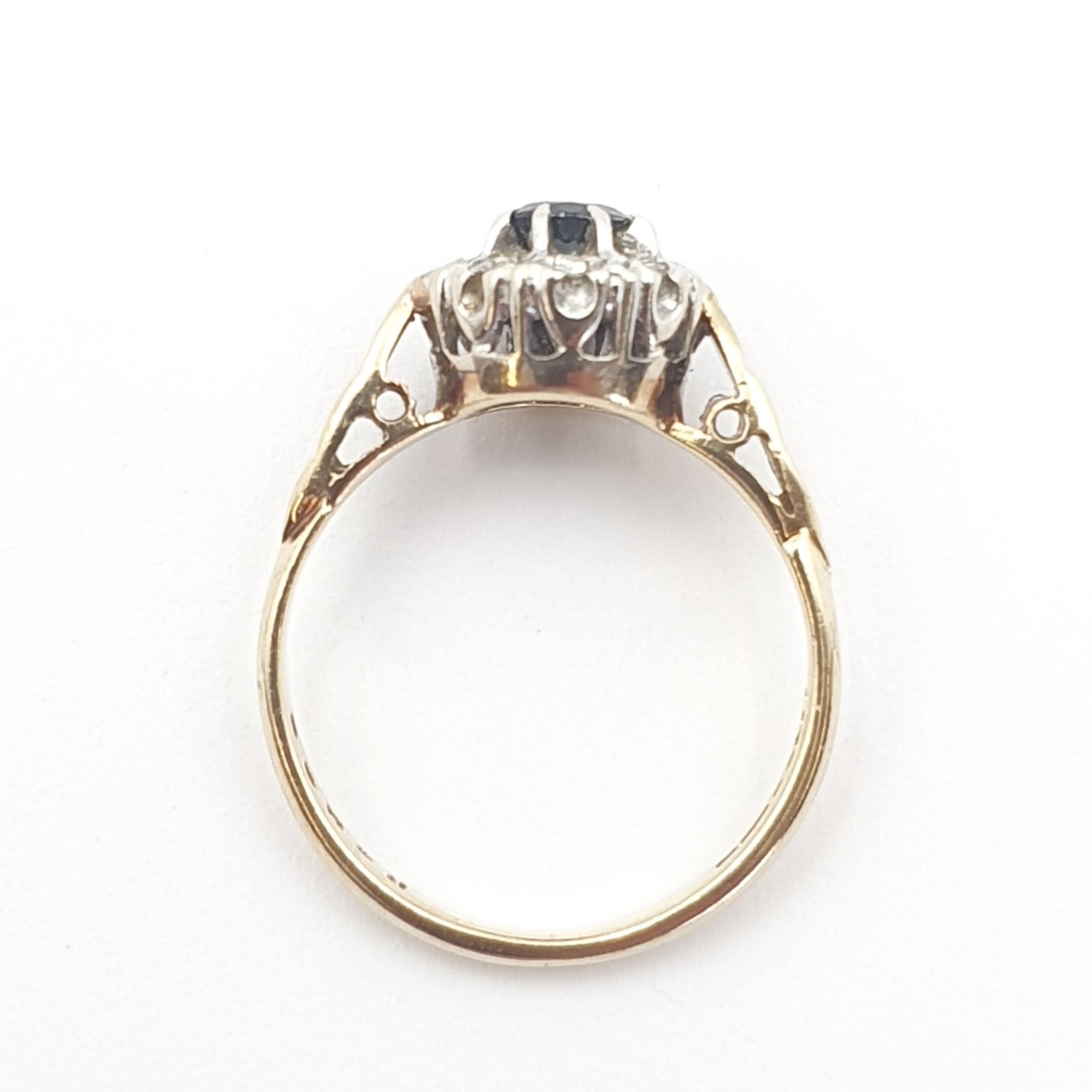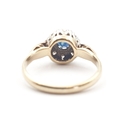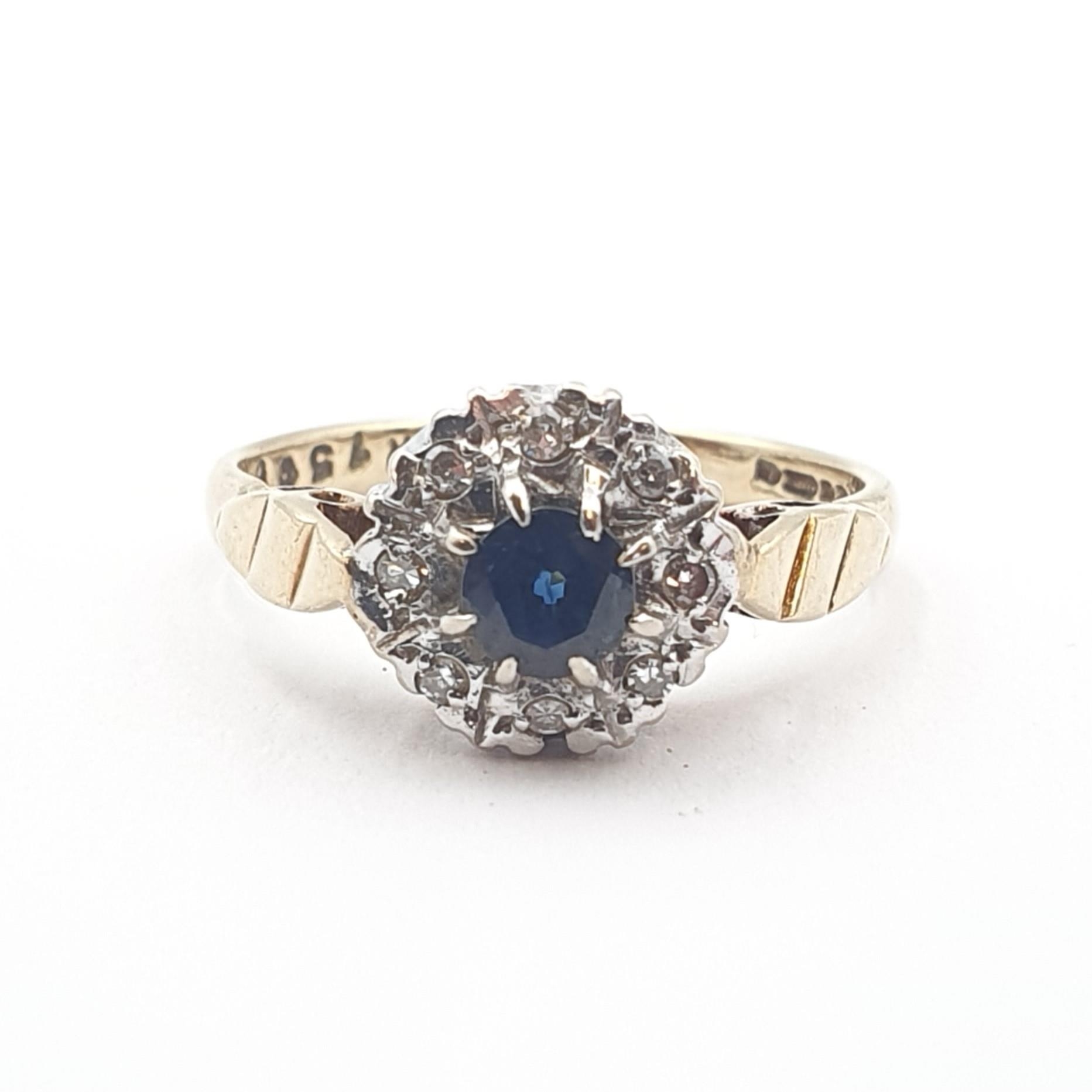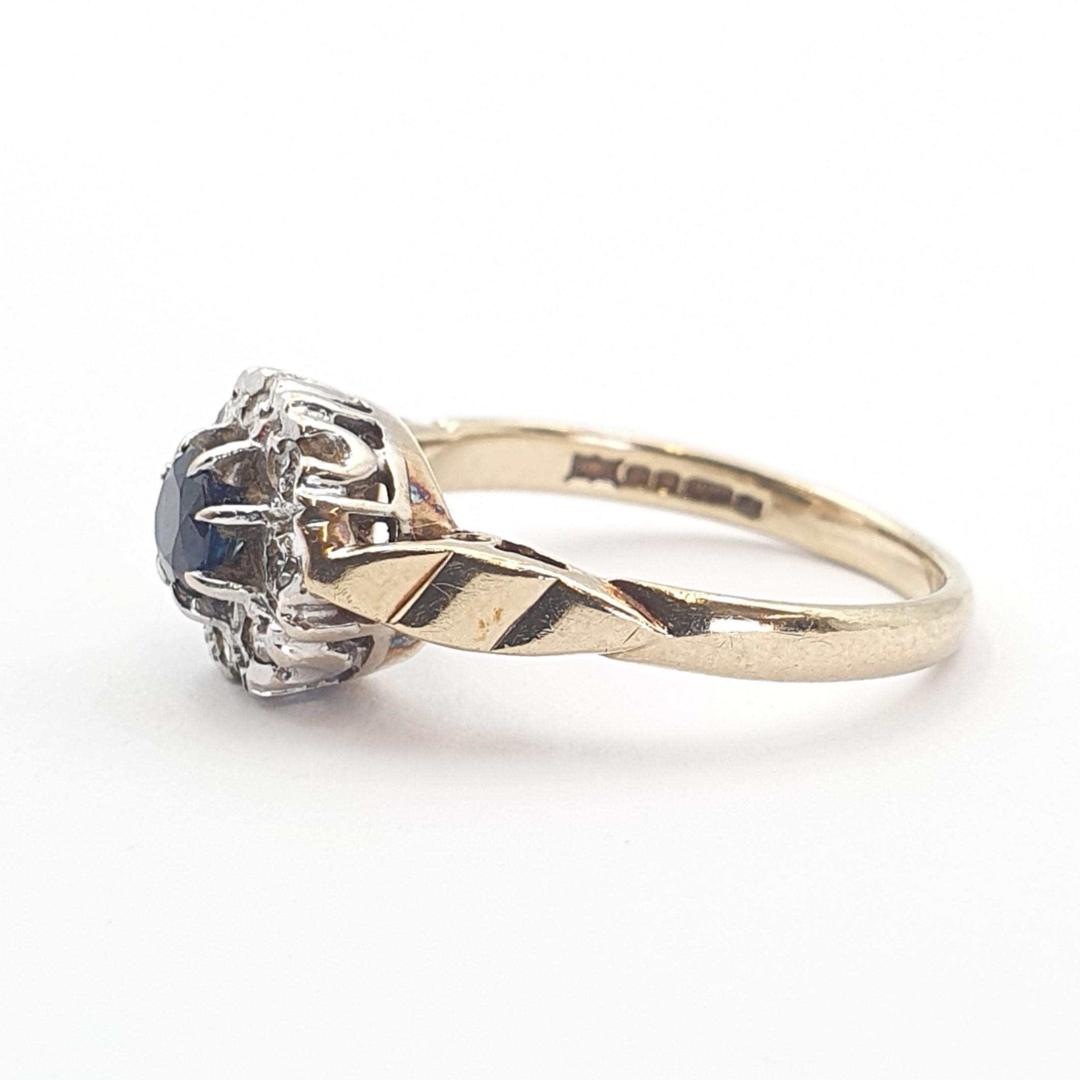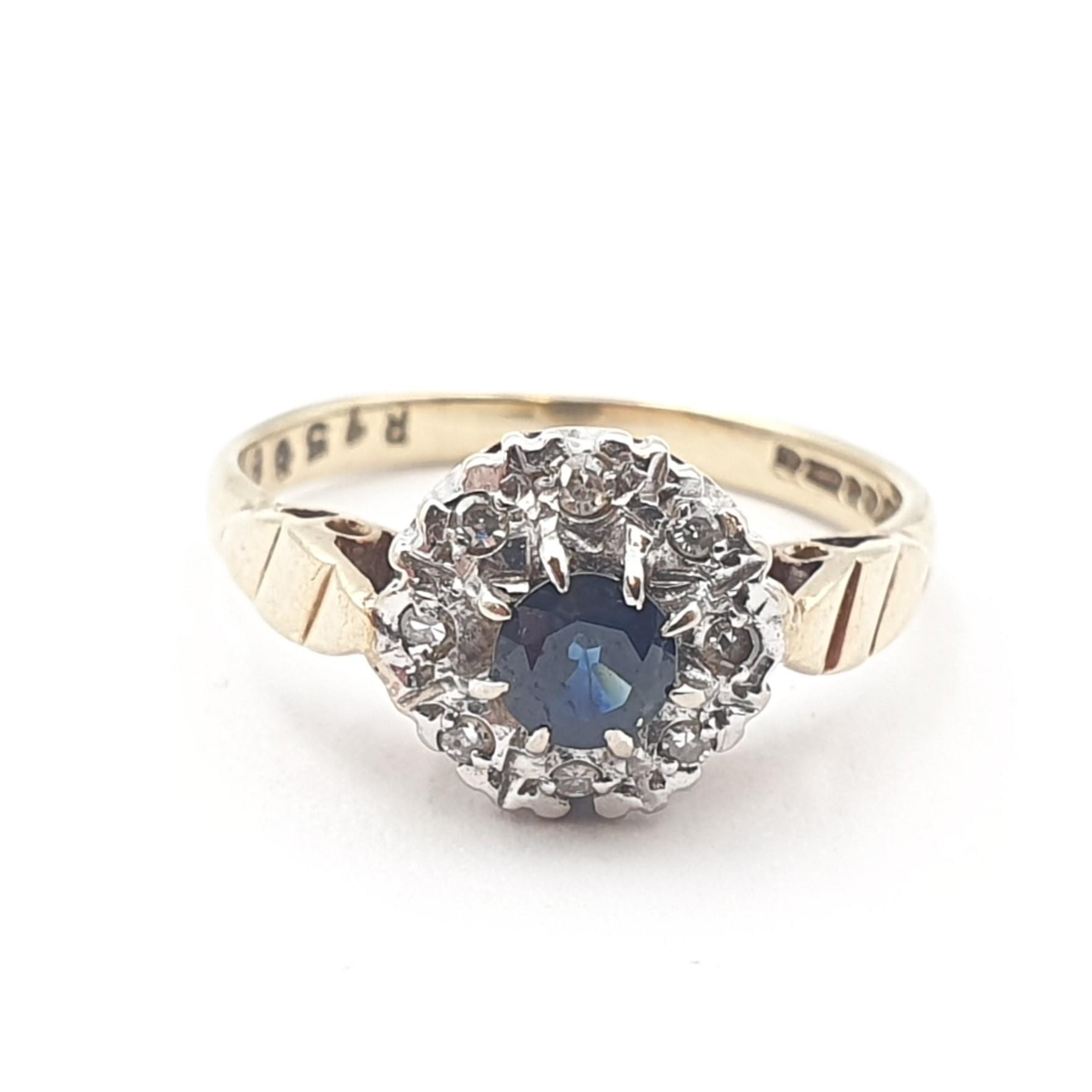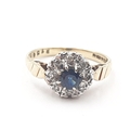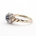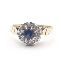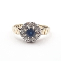 A 1970s Sapphire and Diamond Cluster Ring, claw-set round mixed-cut sapphire surrounded by pave-set single-cut diamonds in white gold on yellow gold shank, 9ct gold, ring size J 1/2, approx 2.2gms