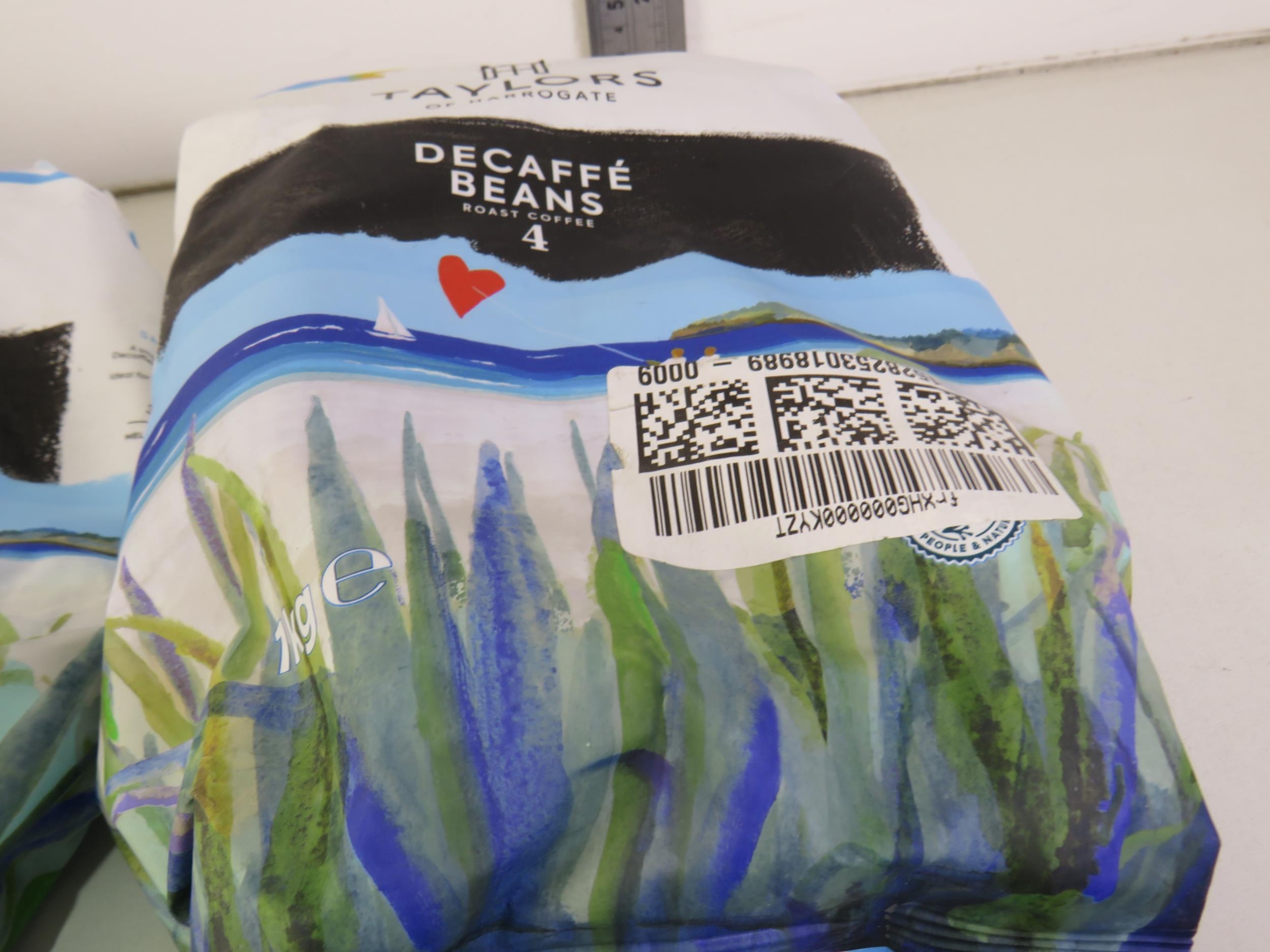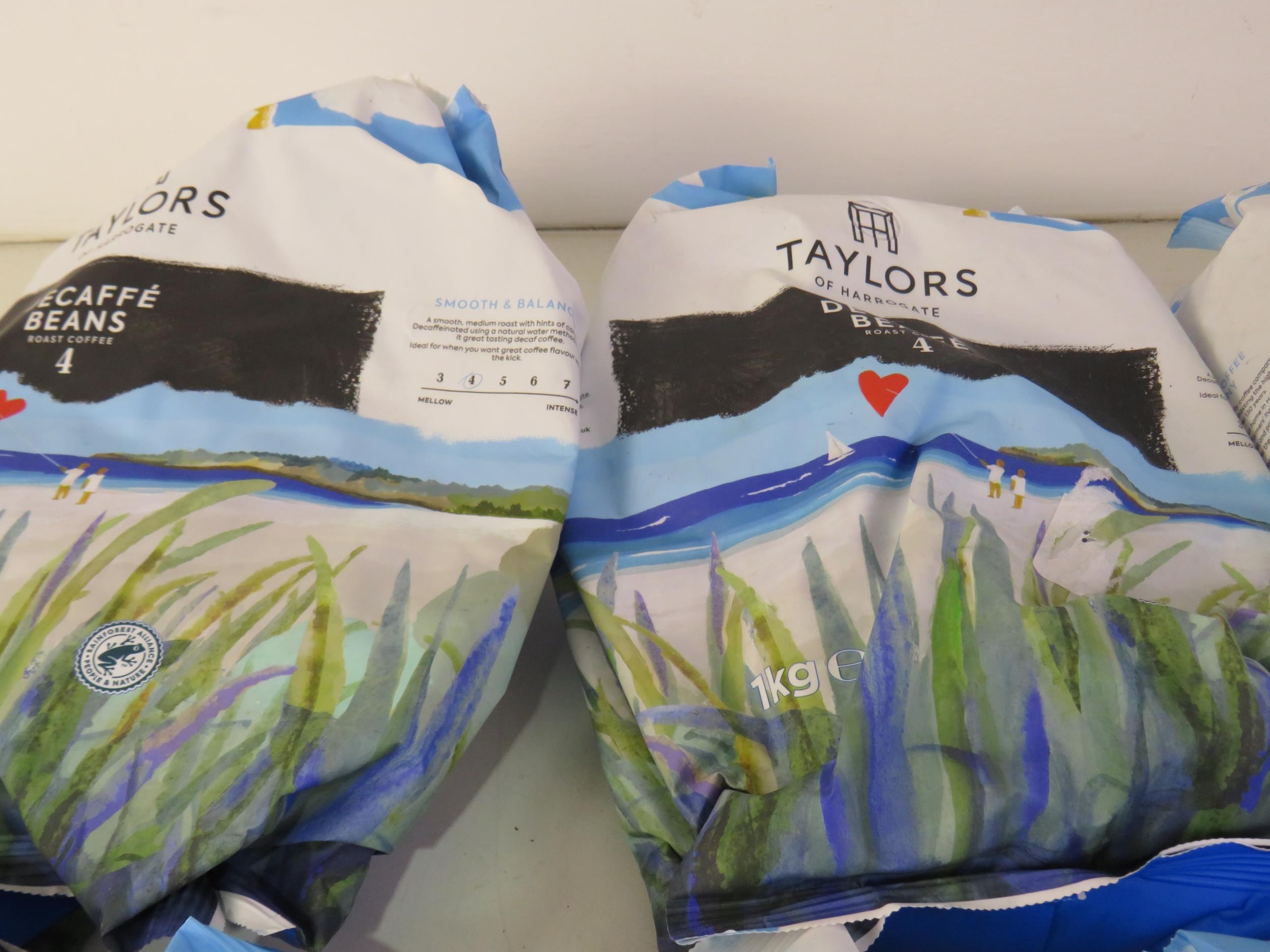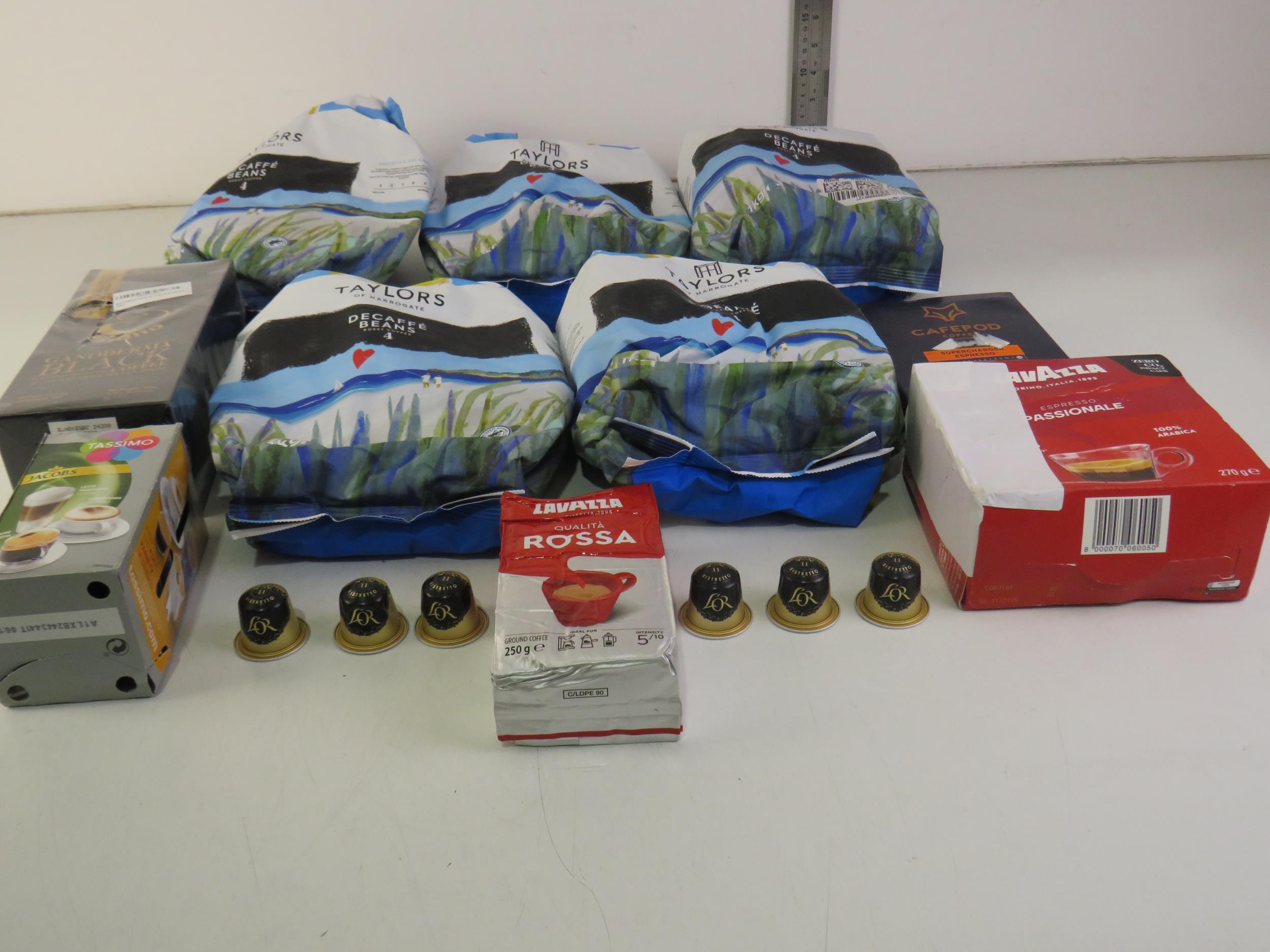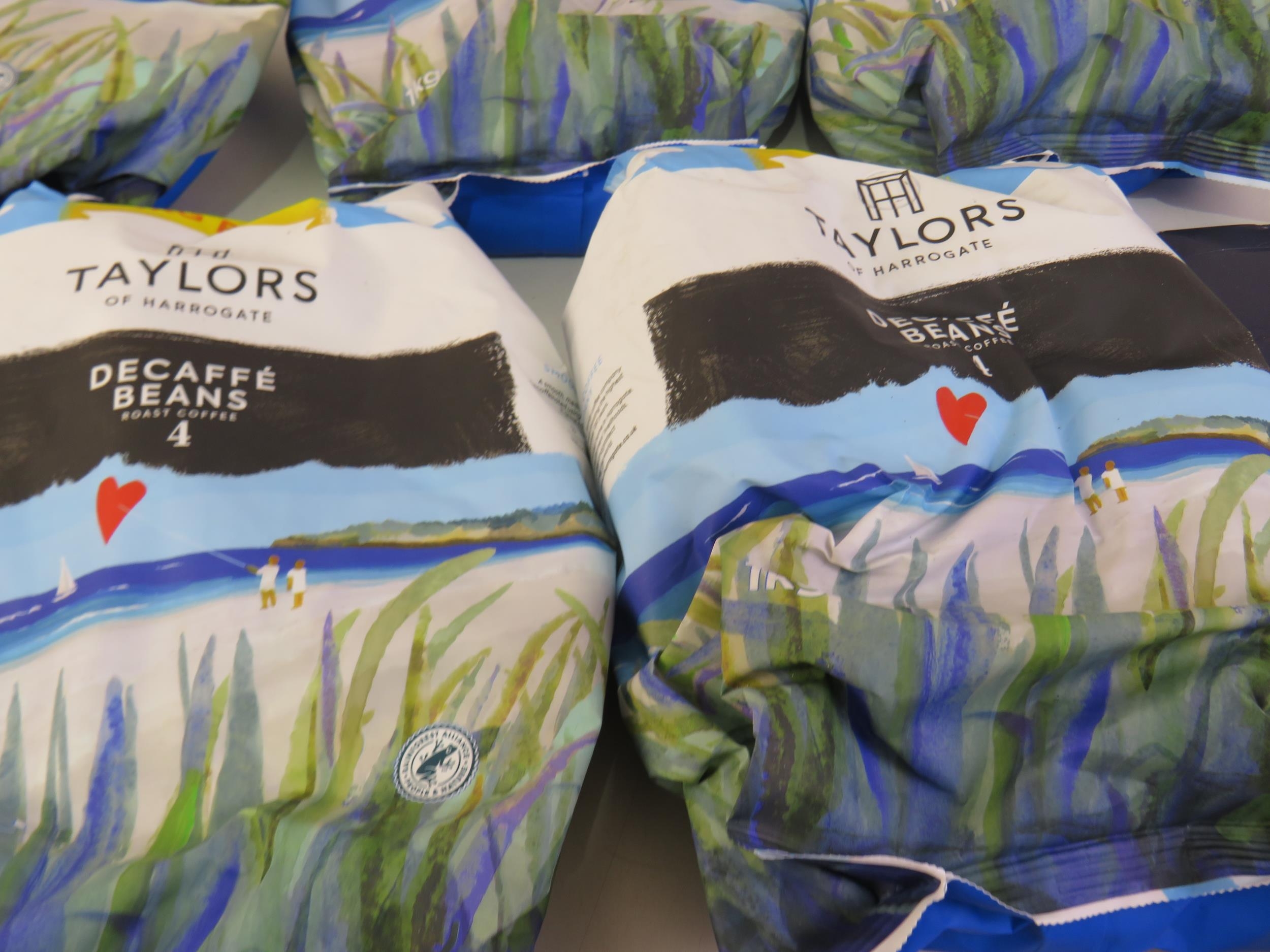 Five 1kg bags taylors coffee beans and five packs of assorted coffee