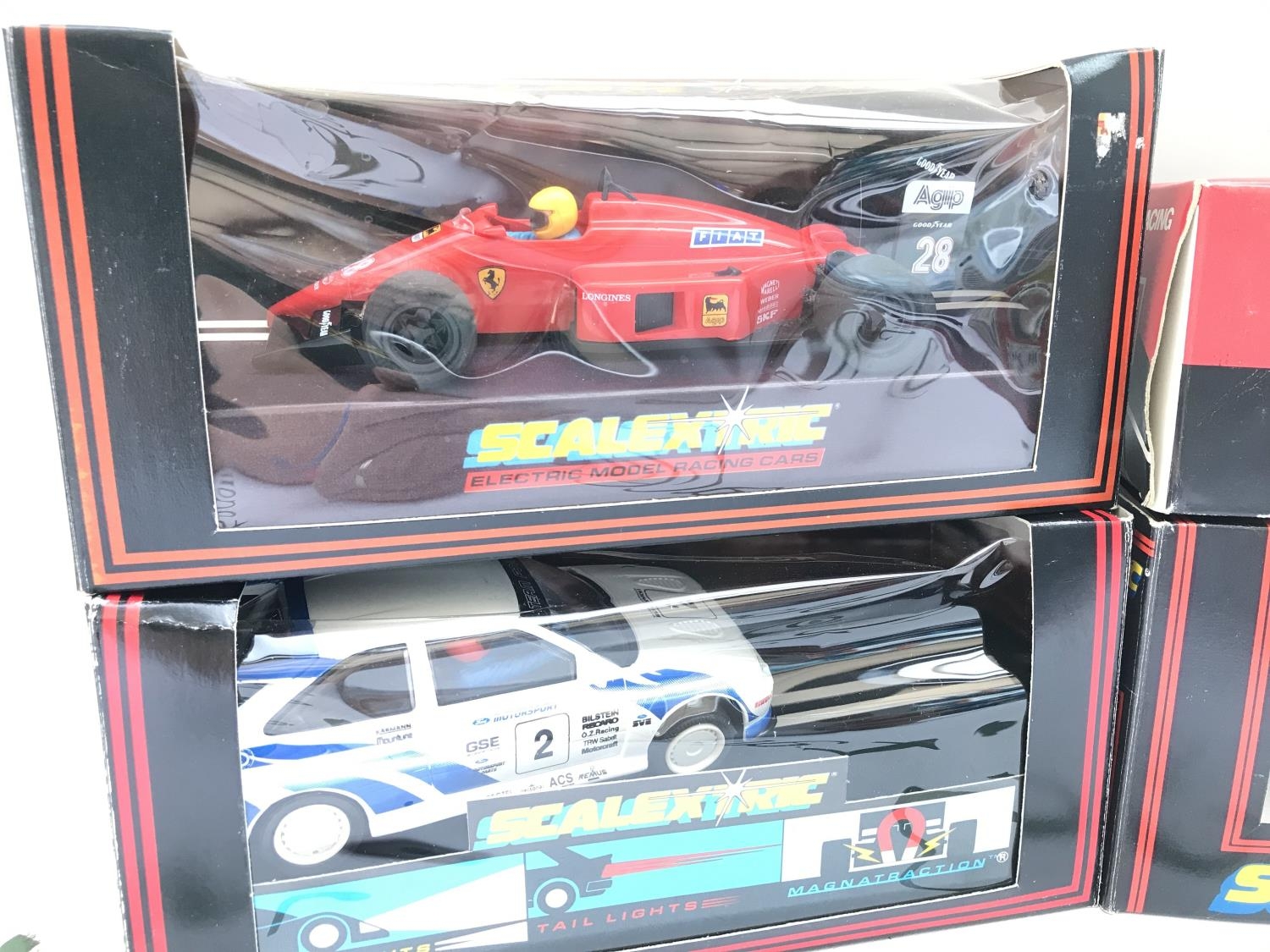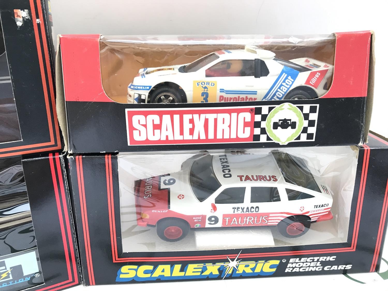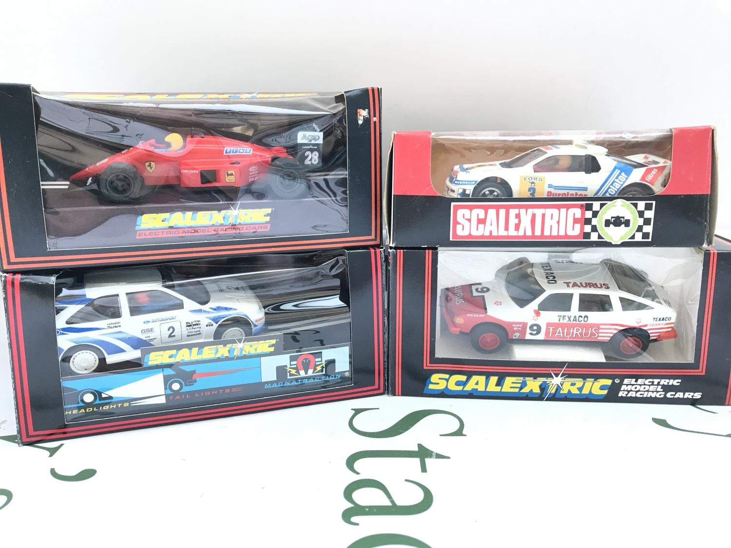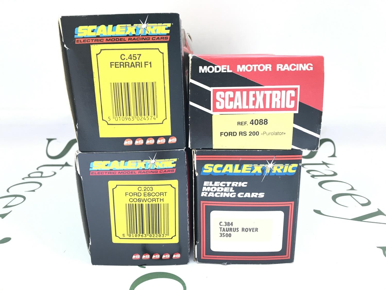 4 X Boxed Scalextric Cars. A Ferrari F1 #C.457. A Ford Escort Cosworth #C.203. A Taurus Rover 3500 #C.384 And A Spanish Ford R.S. 200 #4088.
