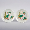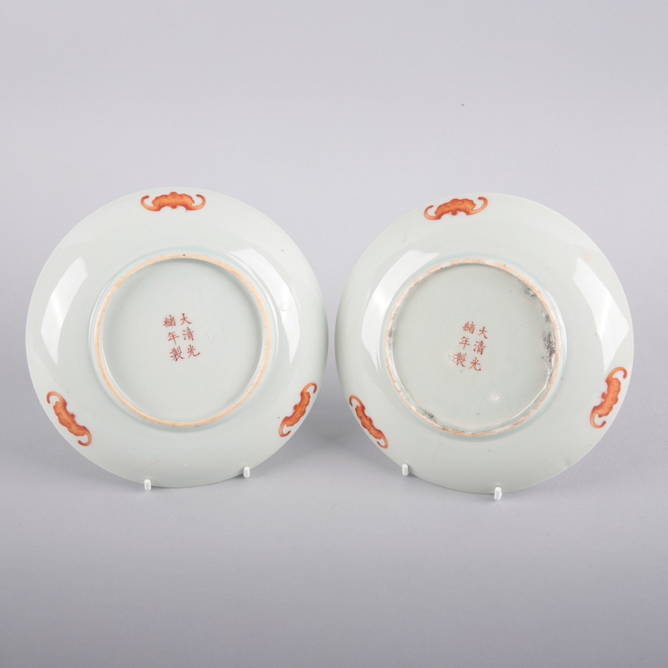 A PAIR OF CHINESE PORCELAIN FAMILLE VERTE PLATESbearing six character Guangxu marks to the base and possibly of the period, decorated with plums and a husk of corn, 16.5cm diameter (2)