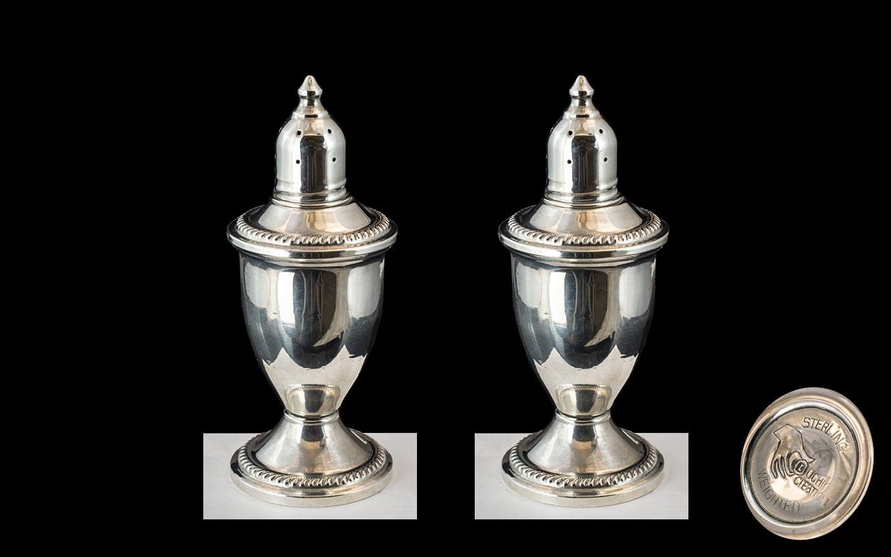 A Fine Pair of Sterling Silver Pepperettes of Pleasing Form. Both Marked Sterling, Each with a Weighted Base and of Solid Construction. Each Stands 4,5 Inches - 11.25 cms High. Both In Good Condition. Total Weight 268.7 grams.