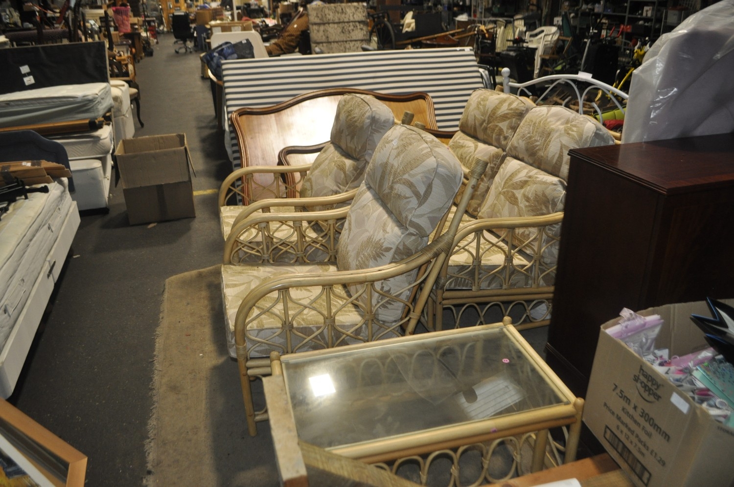 A BAMBOO AND WICKER 3 PIECE CONSERVATORY SUITE COMLETE WITH A MATCHING TABLE