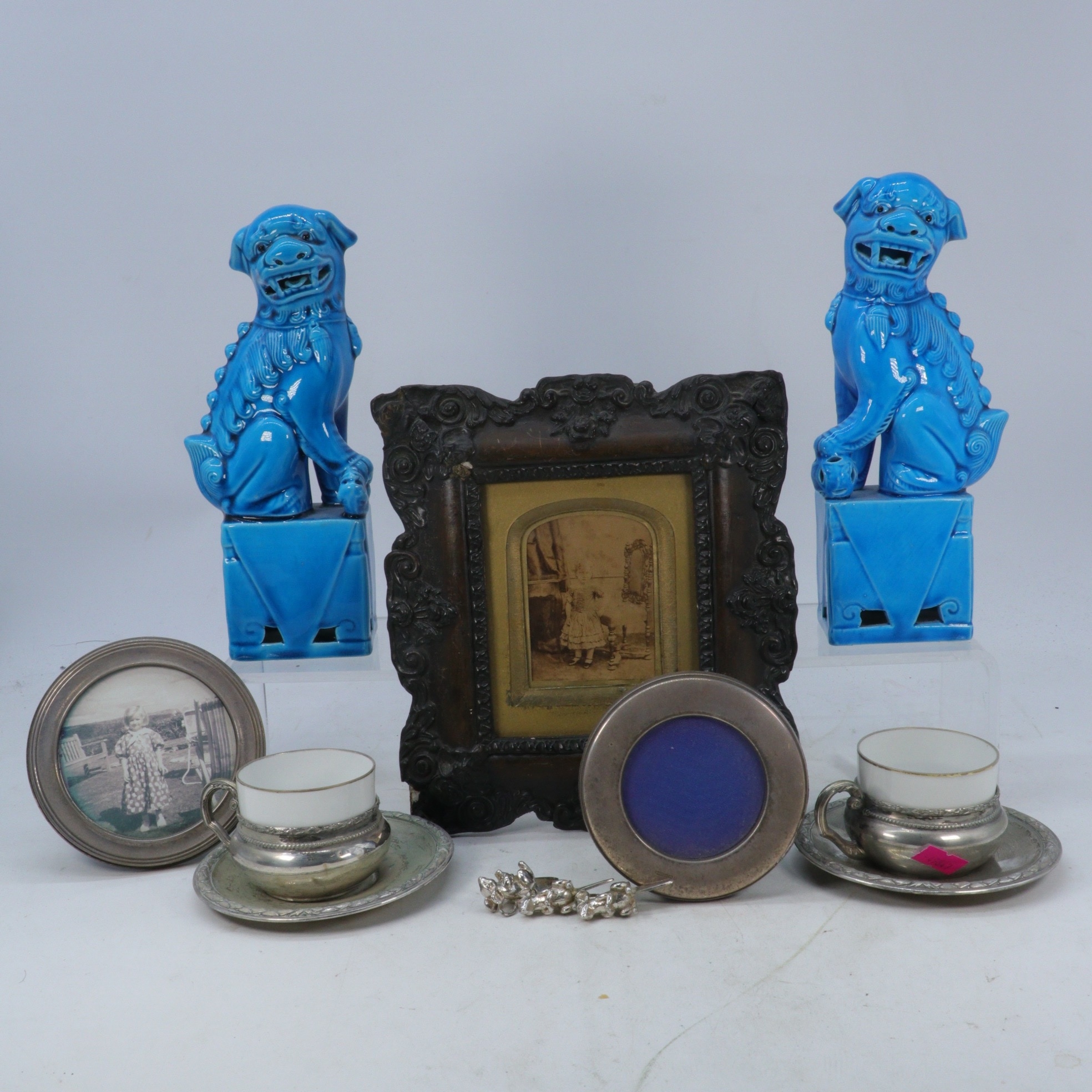 Two silver hallmarked small photo frames, 800 grade cups and saucer, antique picture frame, and a pair of blue glazed dogs of fo etc