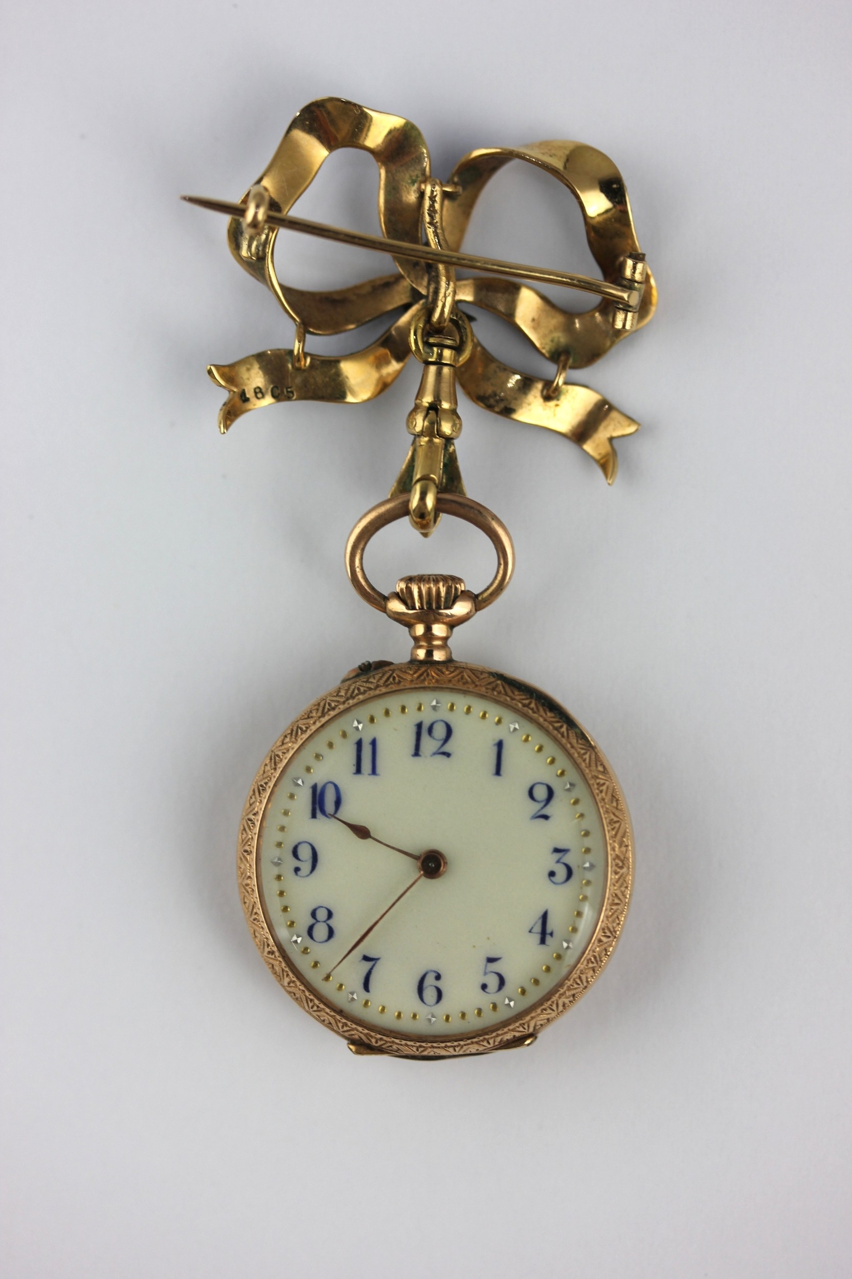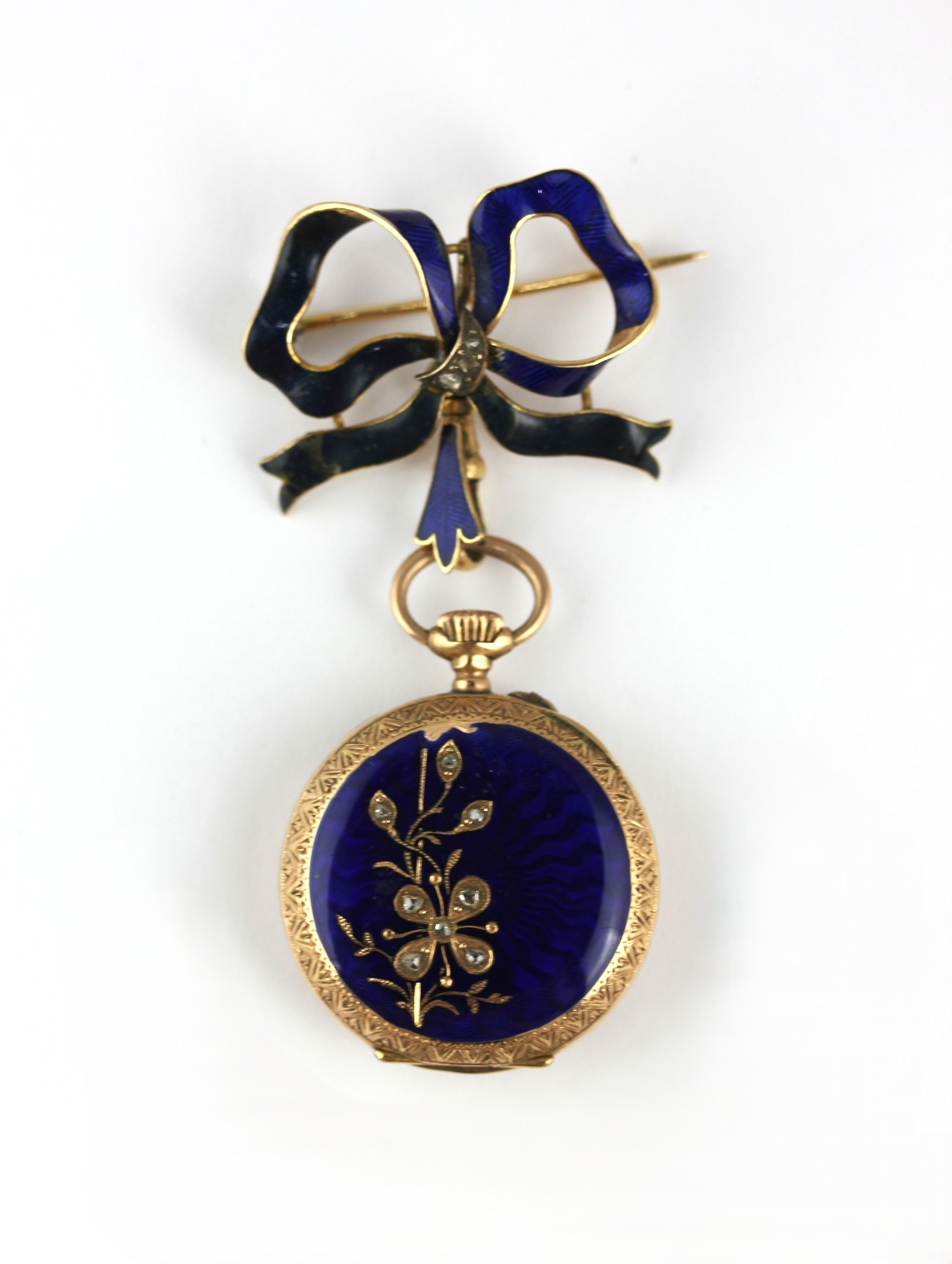 A ladies gold cased blue enamelled and rose diamond set keyless wind open-faced fob watch detailed 0.585 with a gold, rose diamond and blue enameled bow brooch, gross weight 19.5g