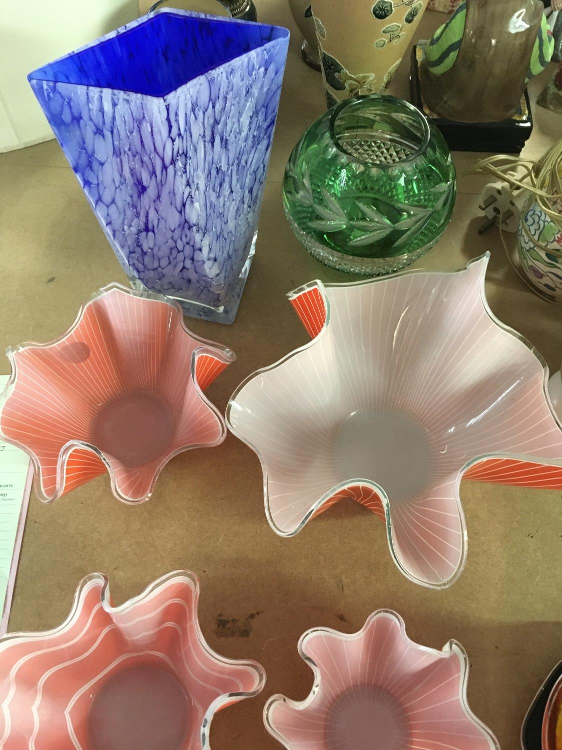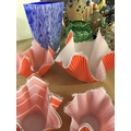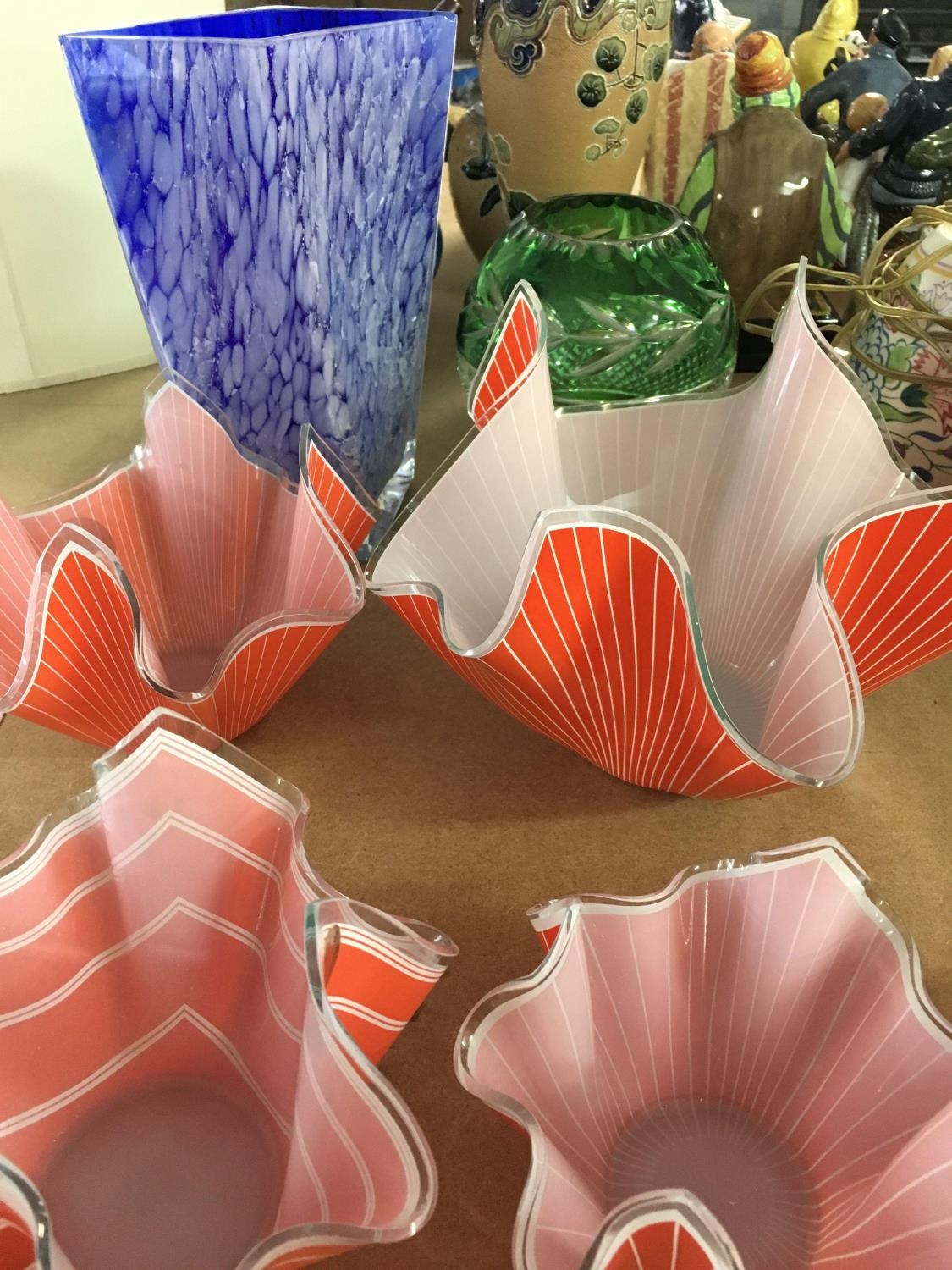 A collection of glass ware including four handkerchief vases and two vases .