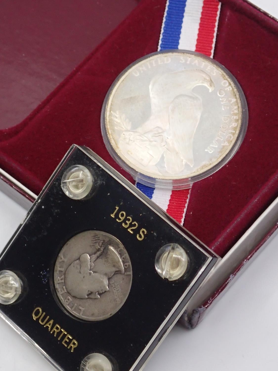 A Quarter dated 1932s and an American silver one dollar coin dated 1984