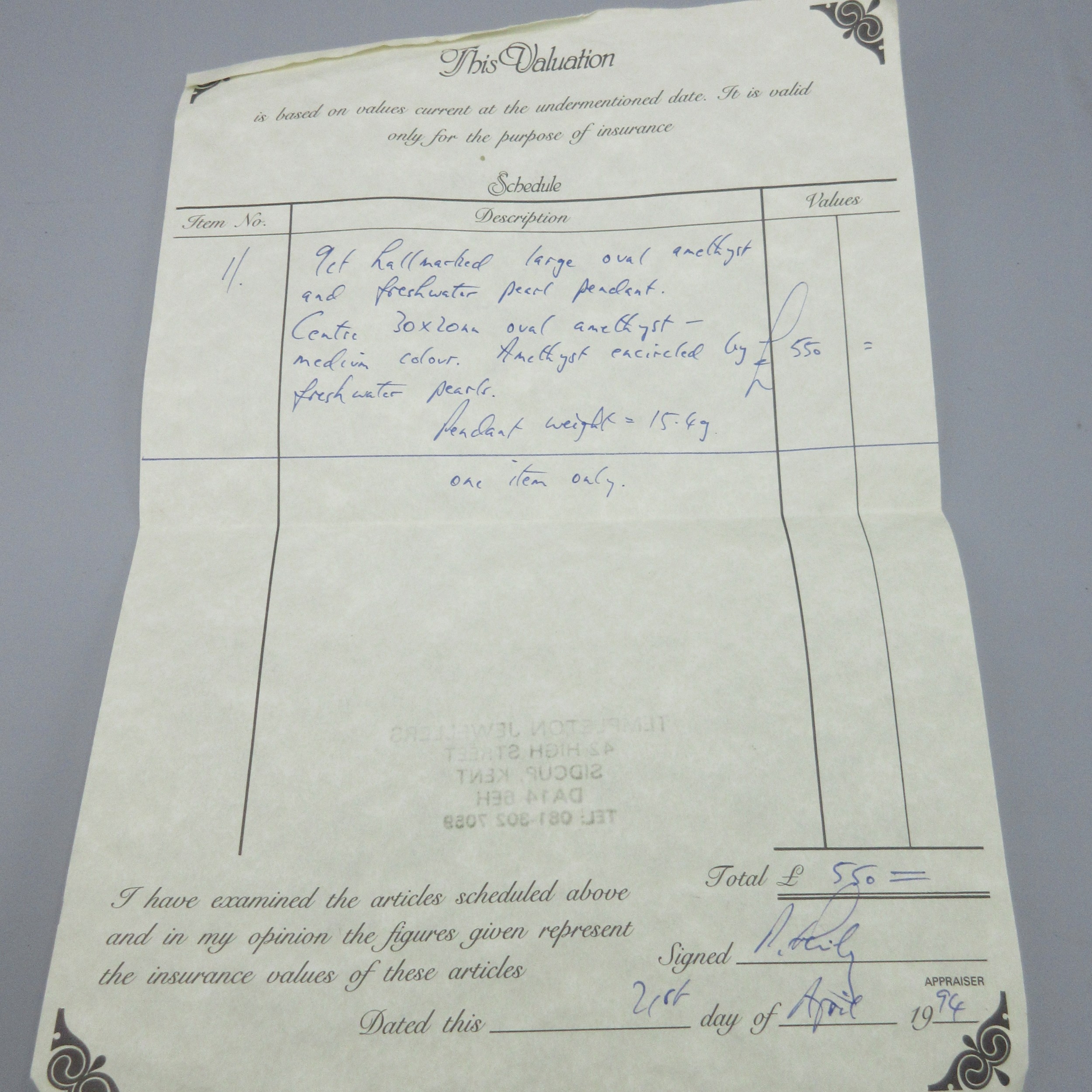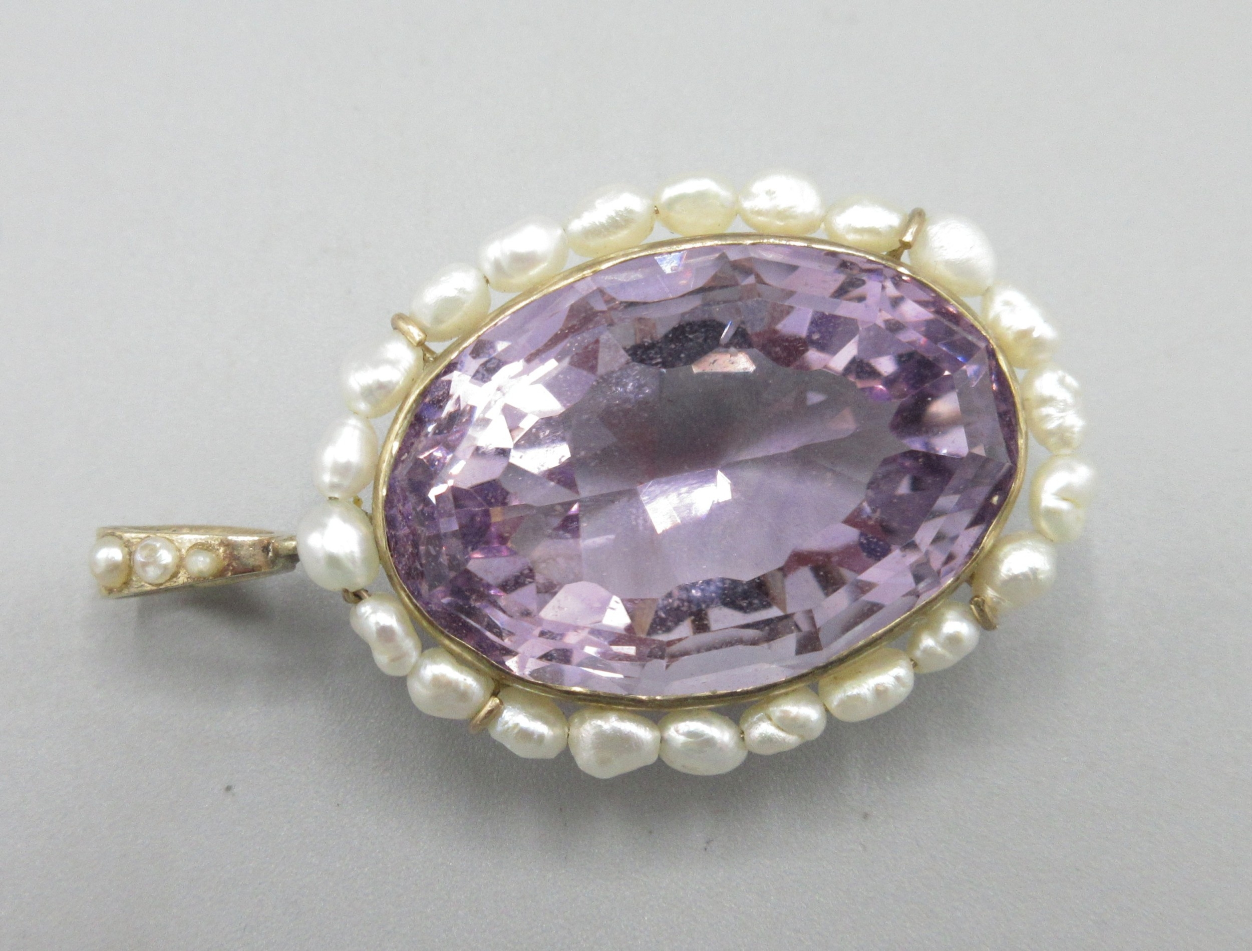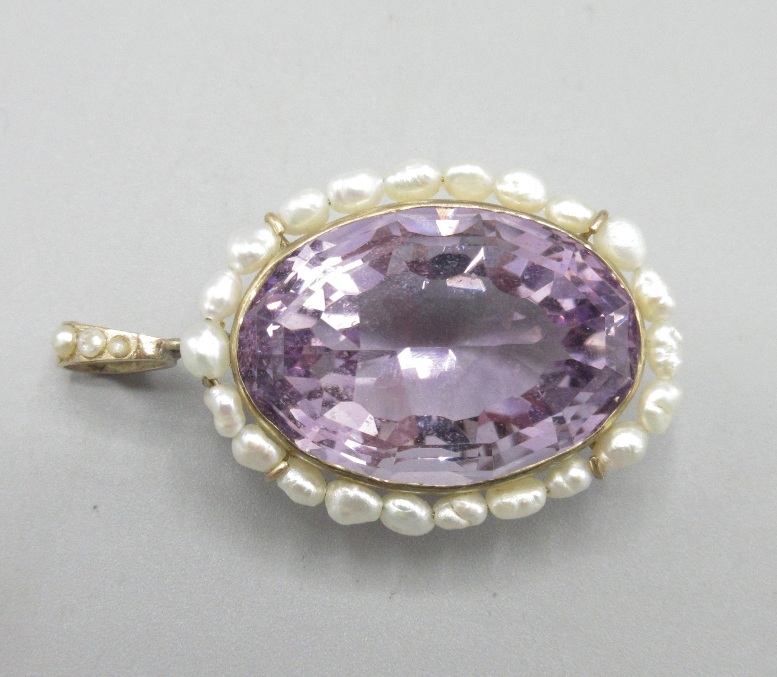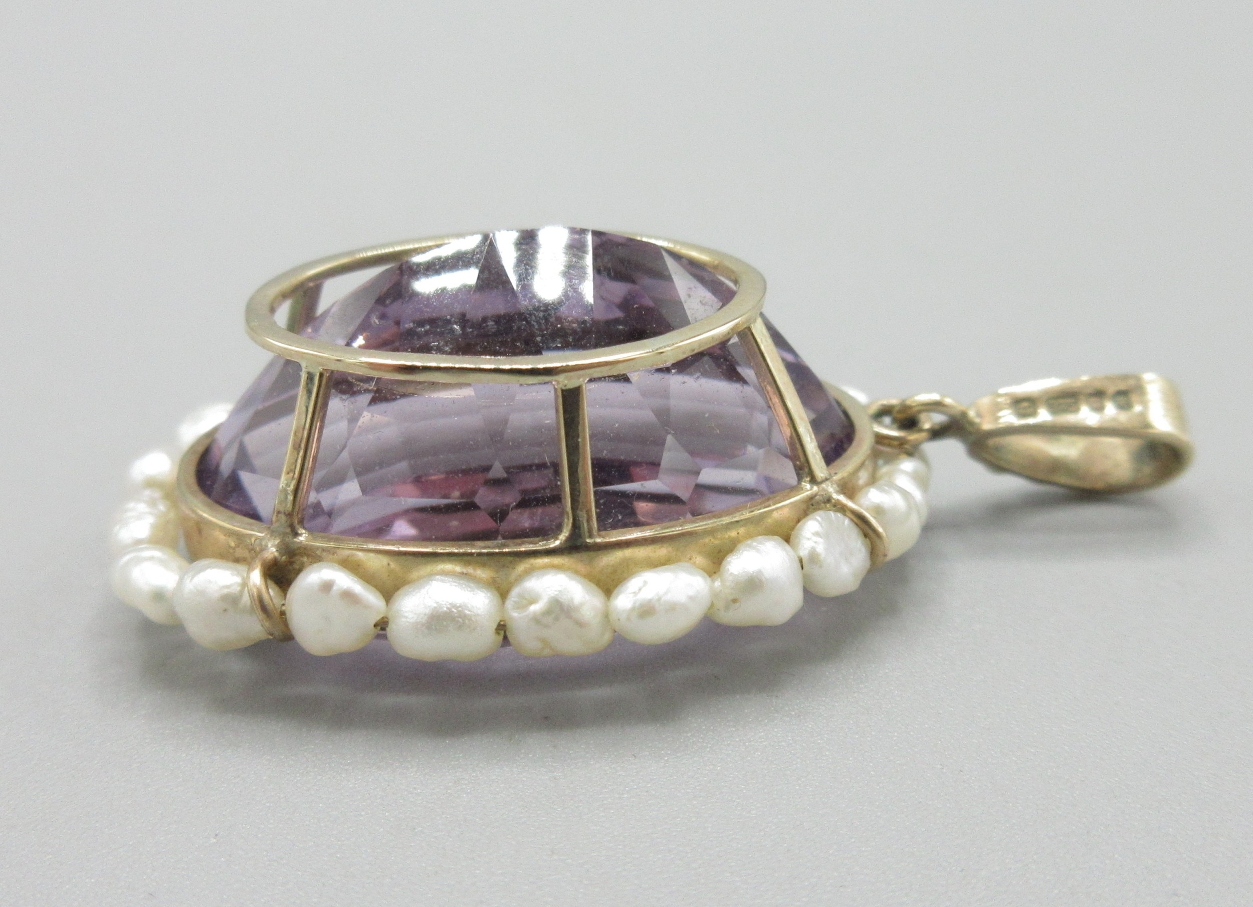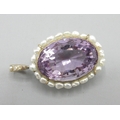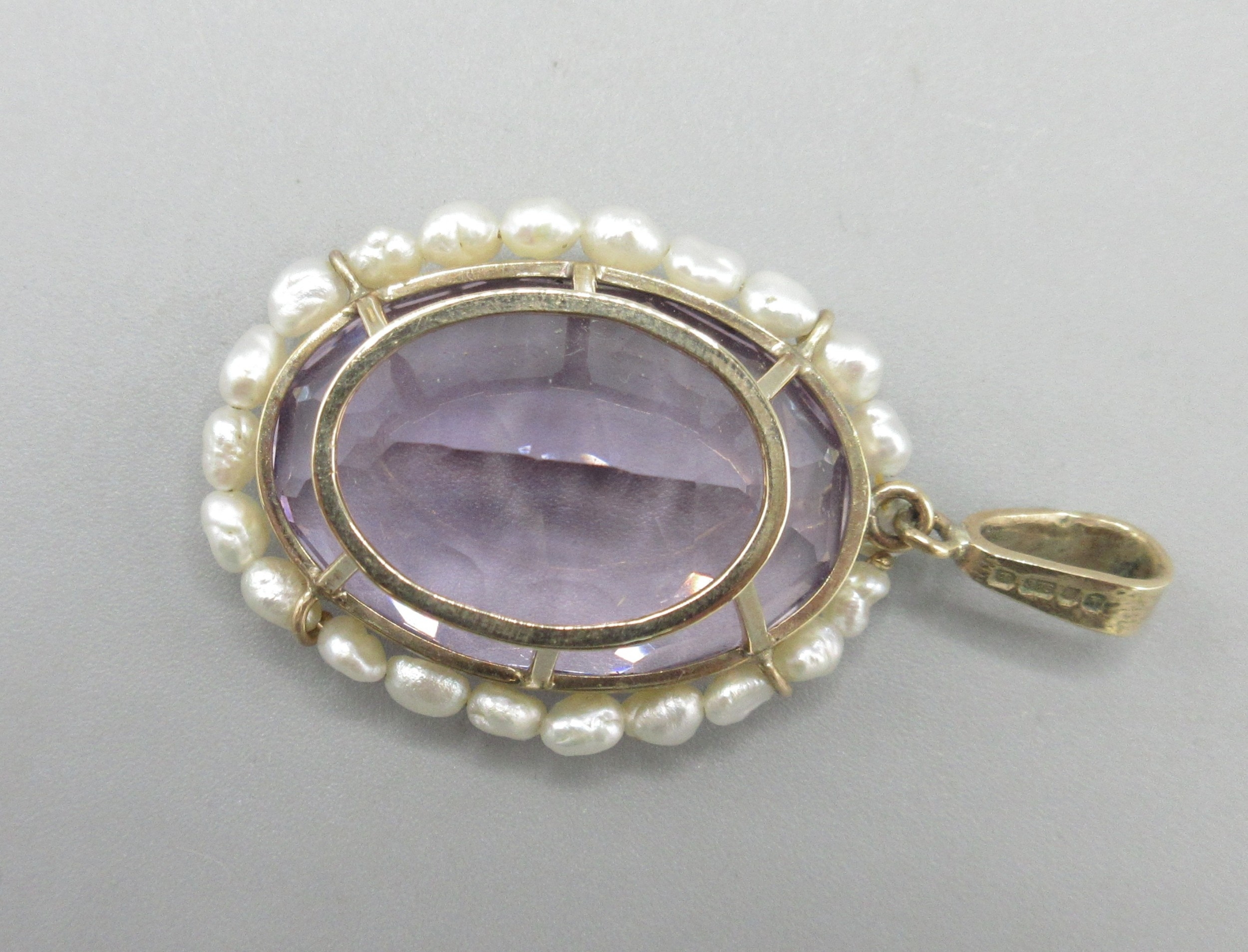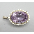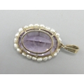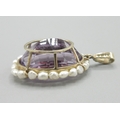 9ct yellow gold amethyst and fresh water pearl pendant, large oval amethyst encircled by pearls, L5cm, 15.4g with original 1994 insurance receipt