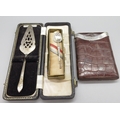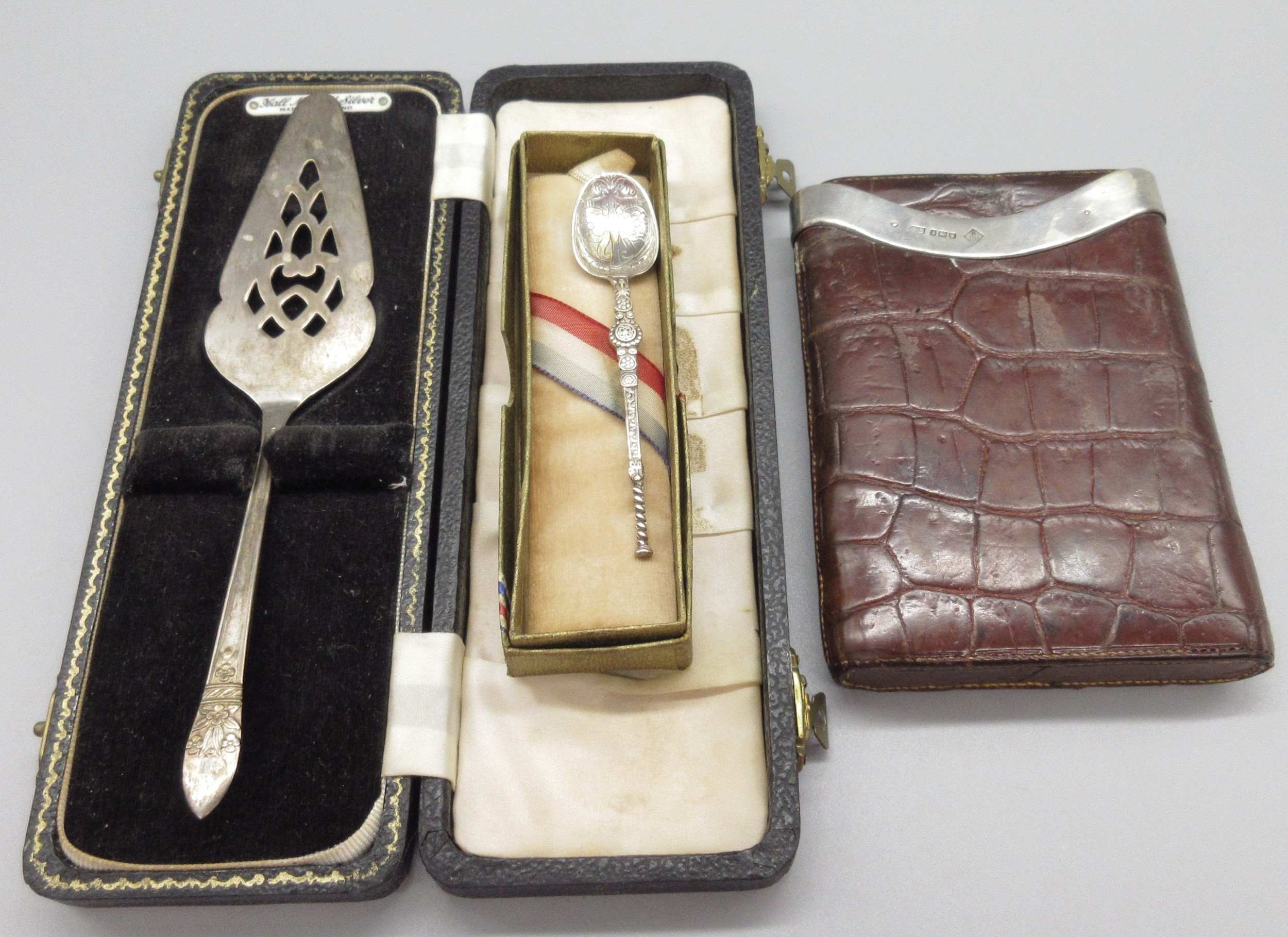 George V silver mounted crocodile skin cigar case by Blumfeld's Best Briars, London 1913, 20th century silver pierced cake slice by Angora Silver Plate Co Ltd, Birmingham, and a commemorative silver teaspoon, weighable, 1.3ozt