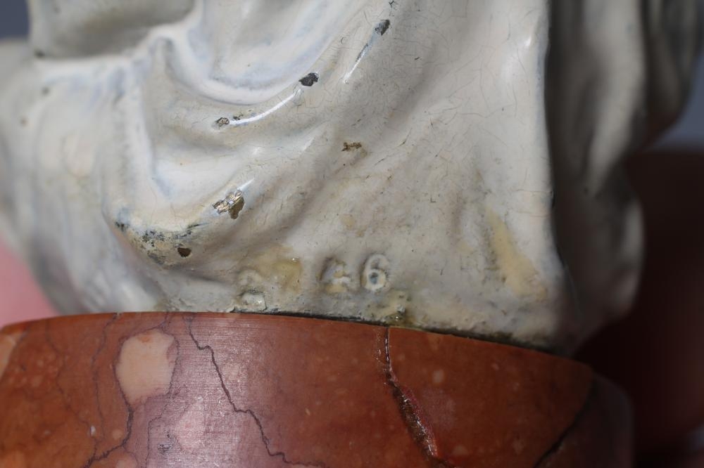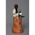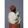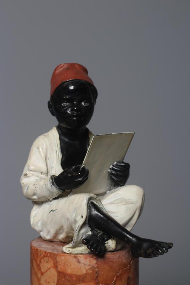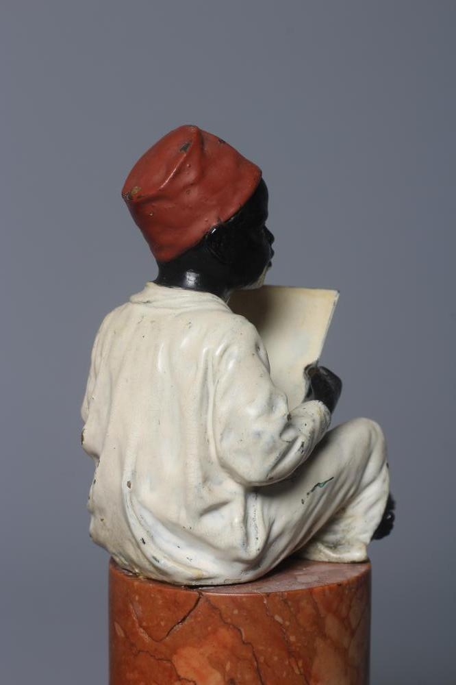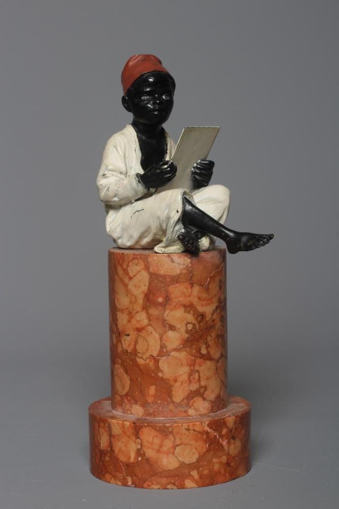 A BERGMAN COLD PAINTED BRONZE ARAB BOY, early 20th century, the boy seated and raised on a column stepped marble base, 7 1/4" high (Est. plus 24% premium inc. VAT)