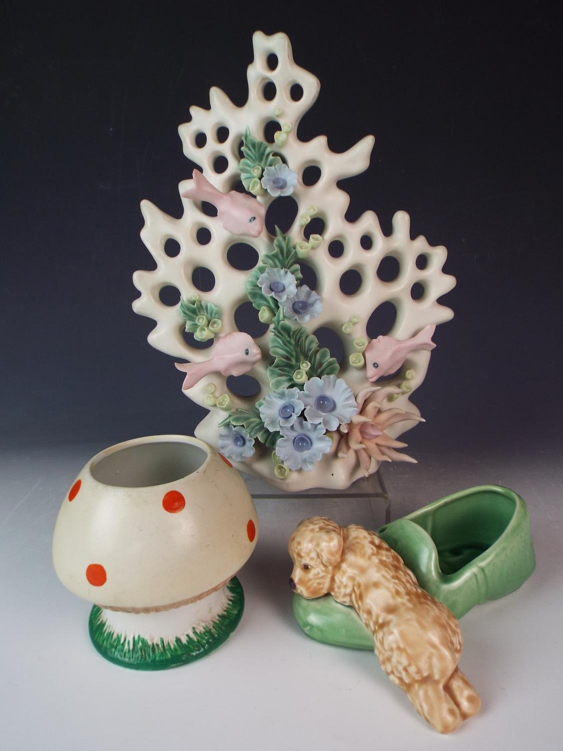 Mixed ceramics lot to include. Isle of Wight Undersea scene, Sylvac Whimsey dog plus a Shelly Mable Lucy Atwell Boo Boo sugar bowl. 1926.