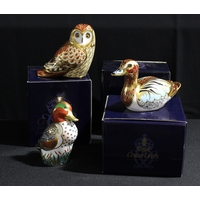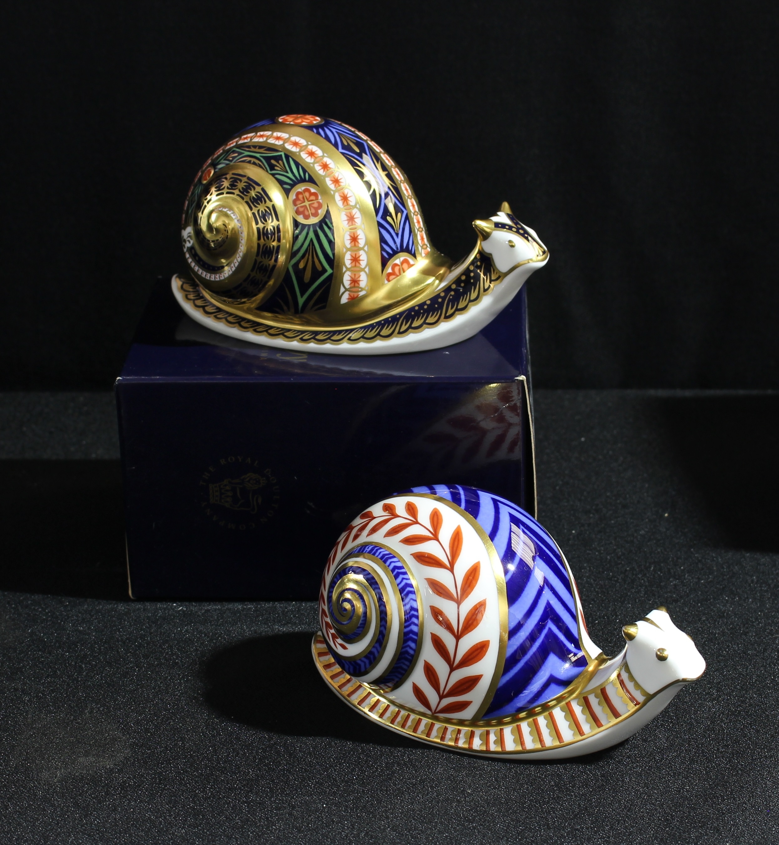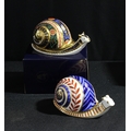 A Royal Crown Derby paperweight, Garden Snail, limited edition, 3,345/4,500, signed, gold stopper, certificate, boxed; another, Snail, gold stopper (2)