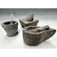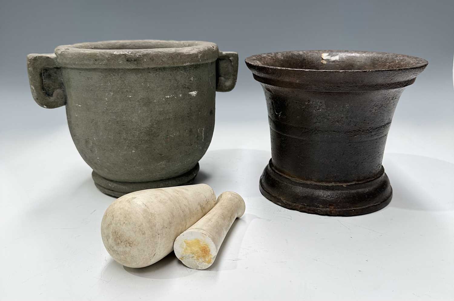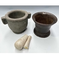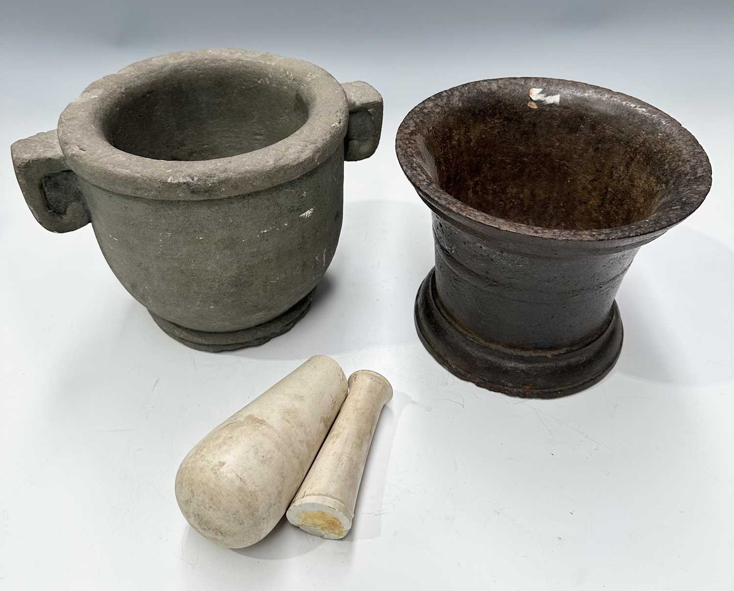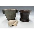 A carved basalt or sandstone mortar with Etruscan or Greek style lugs/ears, height 18cm, diameter 19cm, a cast iron mortar, height 16cm, together with the pieces of a Wedgwood pestle (3)