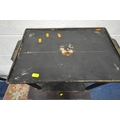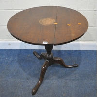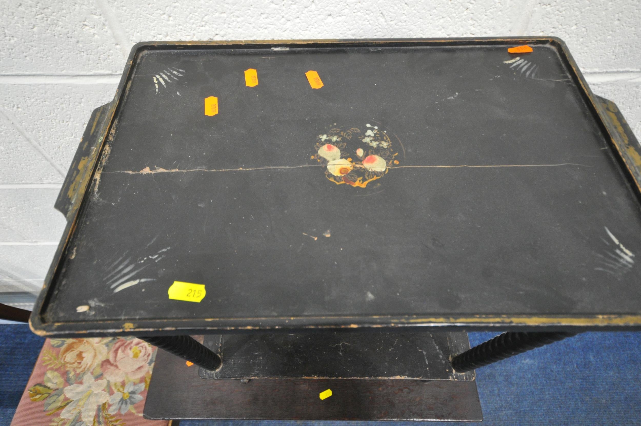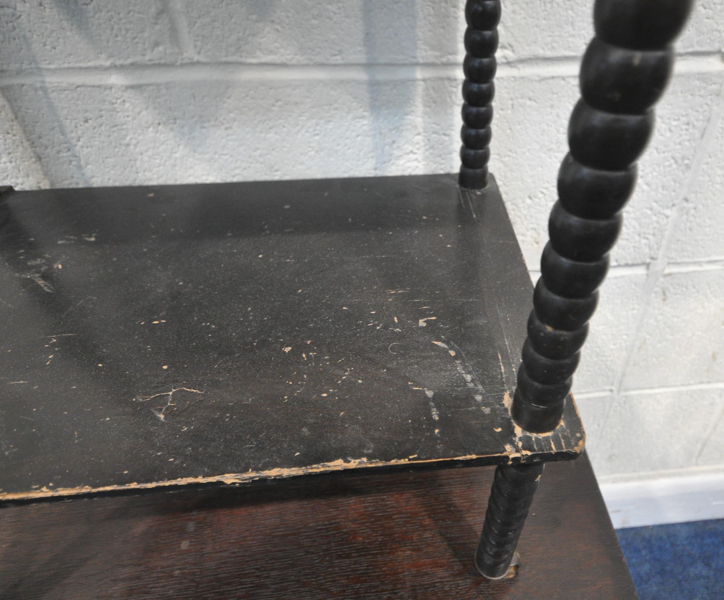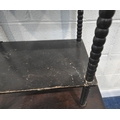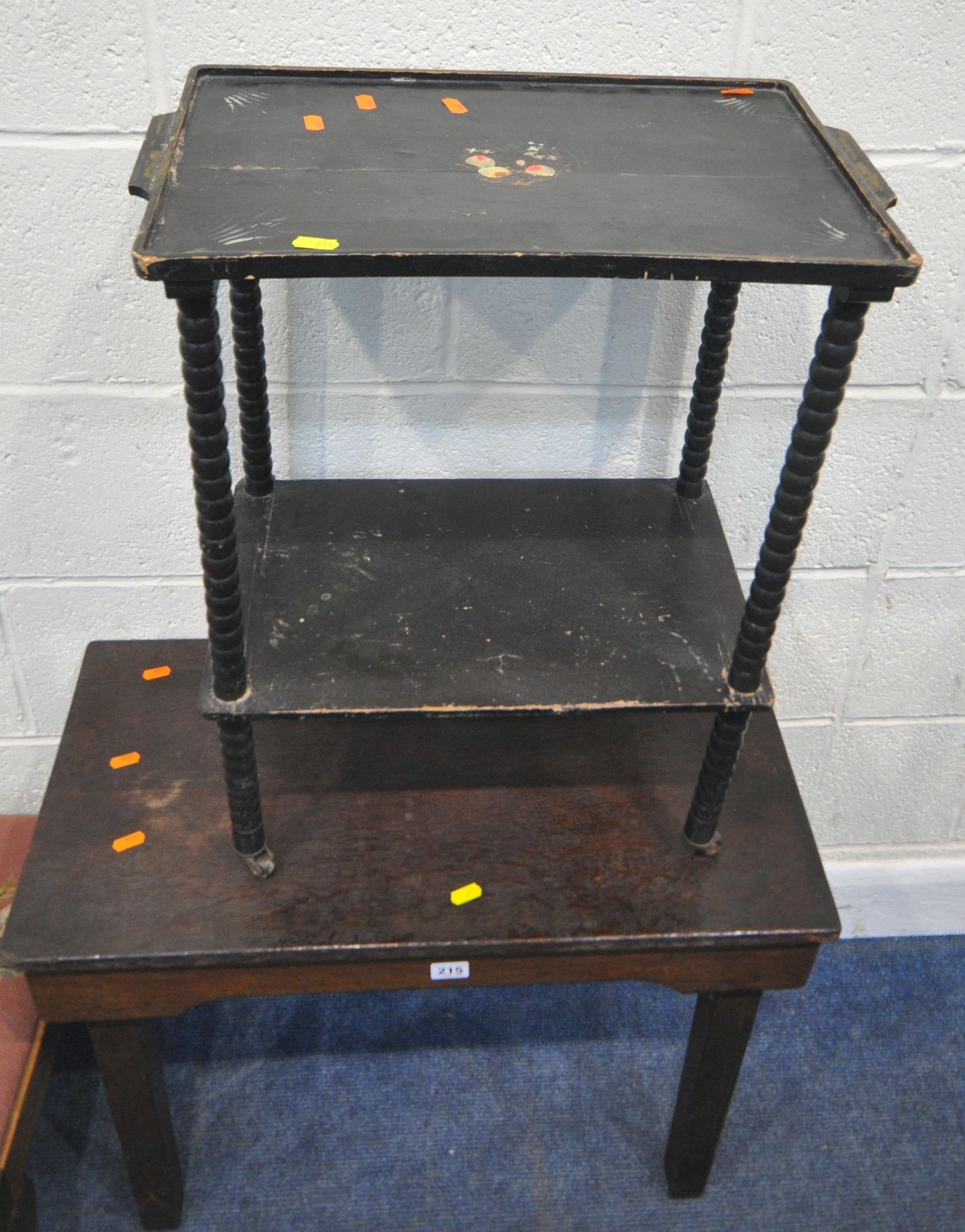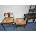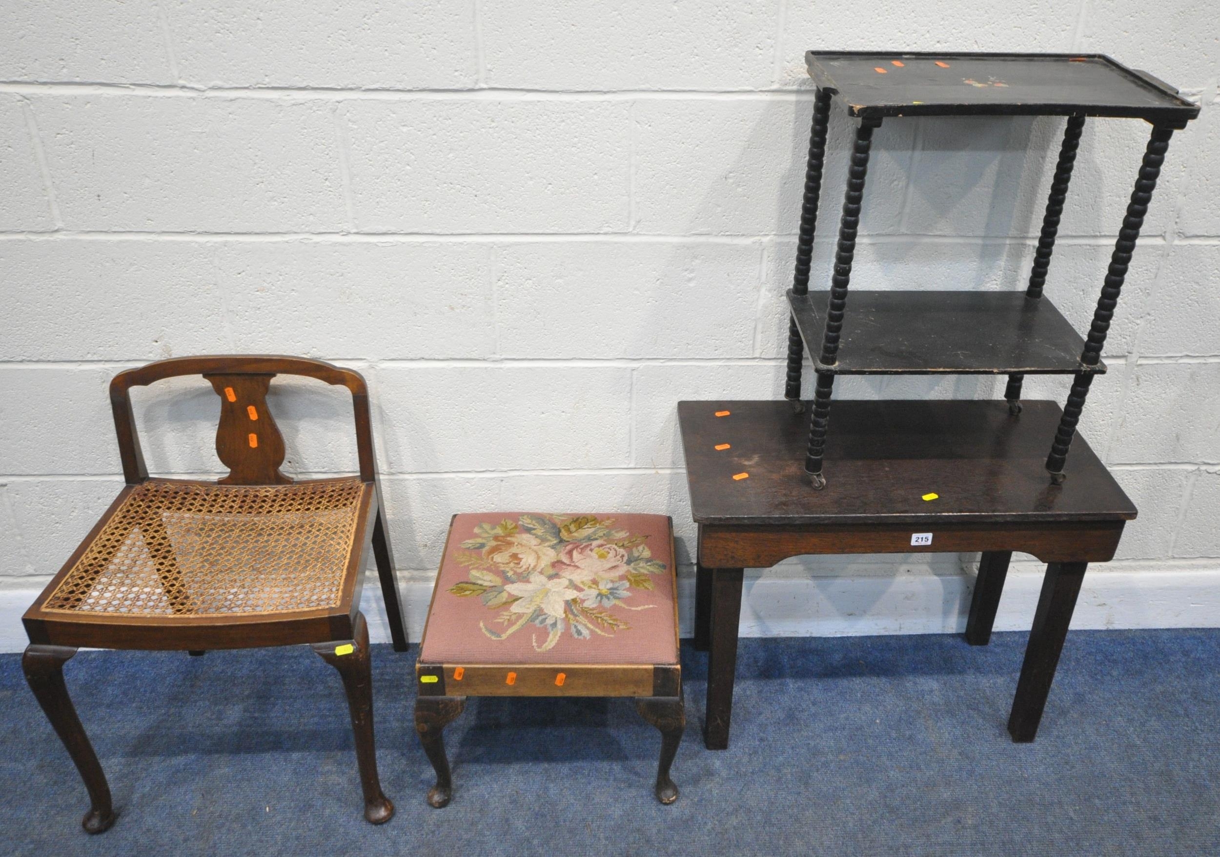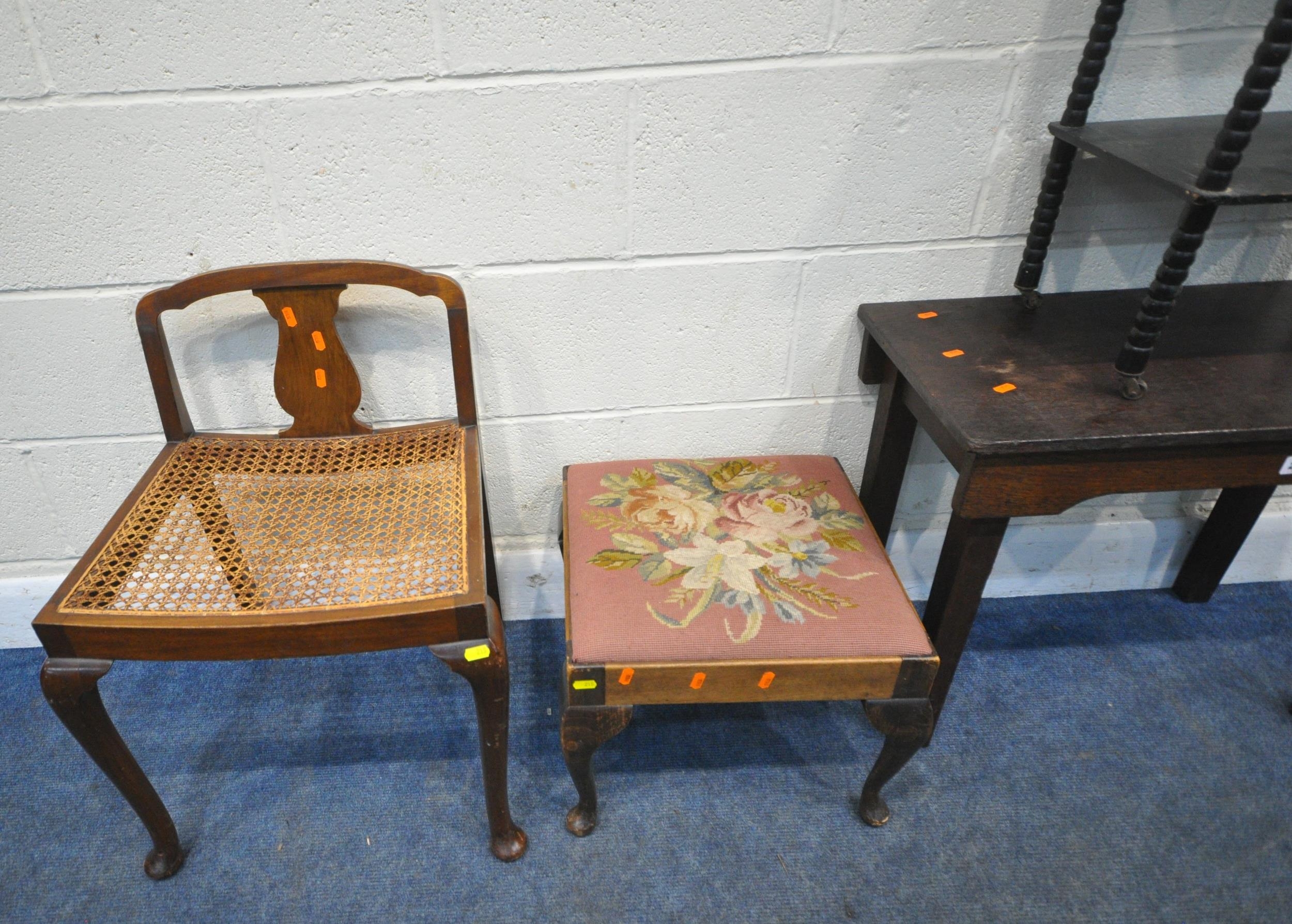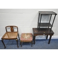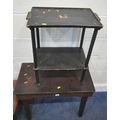 AN EARLY 20TH CENTURY MAHOGANY STOOL, with a low back rest, a cane seat, raised on front cabriole legs, another stool, an occasional table, along with an ebonised two tier trolley, condition report: trolley distressed, all others with general signs of usage (4)
