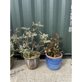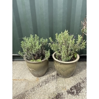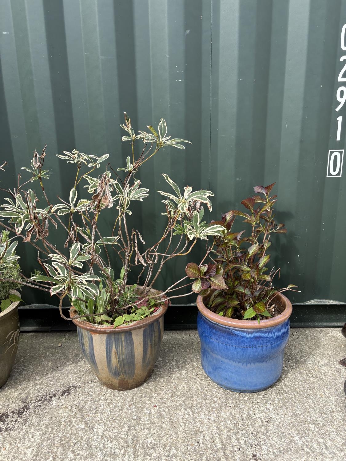 Two glazed pots plants with shrubs, each pot height 32 cms, diameter 32 cms