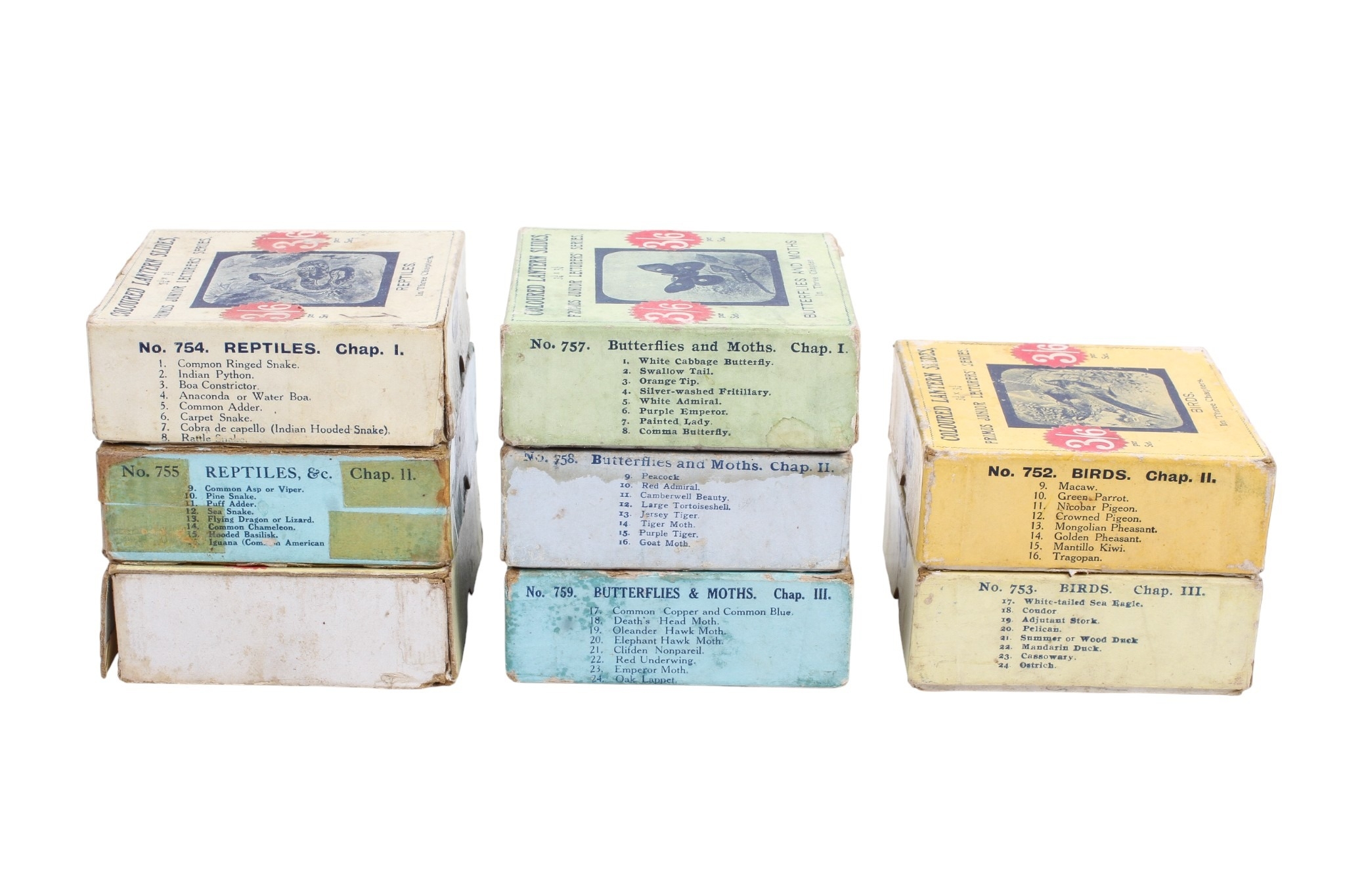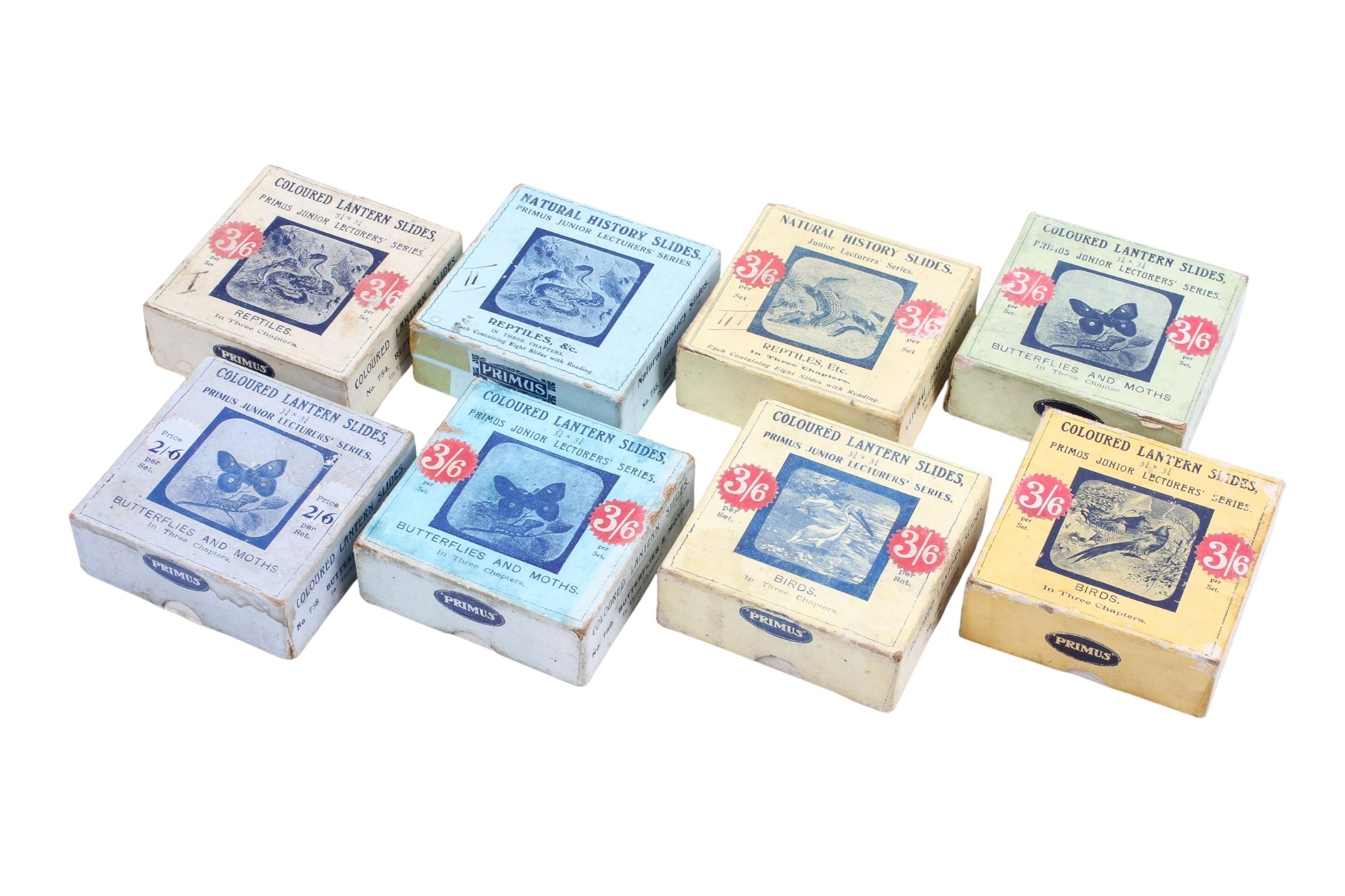 Eight boxed Primus Junior Lecturers' Series Magic Lantern Slide sets. To include; 'Birds' 752 Chap.I (missing slide 8) and 753 Chap.II; 'Reptiles' 754 Chap.I, 755 Chap.II, and 756 Chap.III; and 'Butterflies and Moths' 757 Chap.I, 758 Chap.II, and 759 Chap.III. (63 slides).