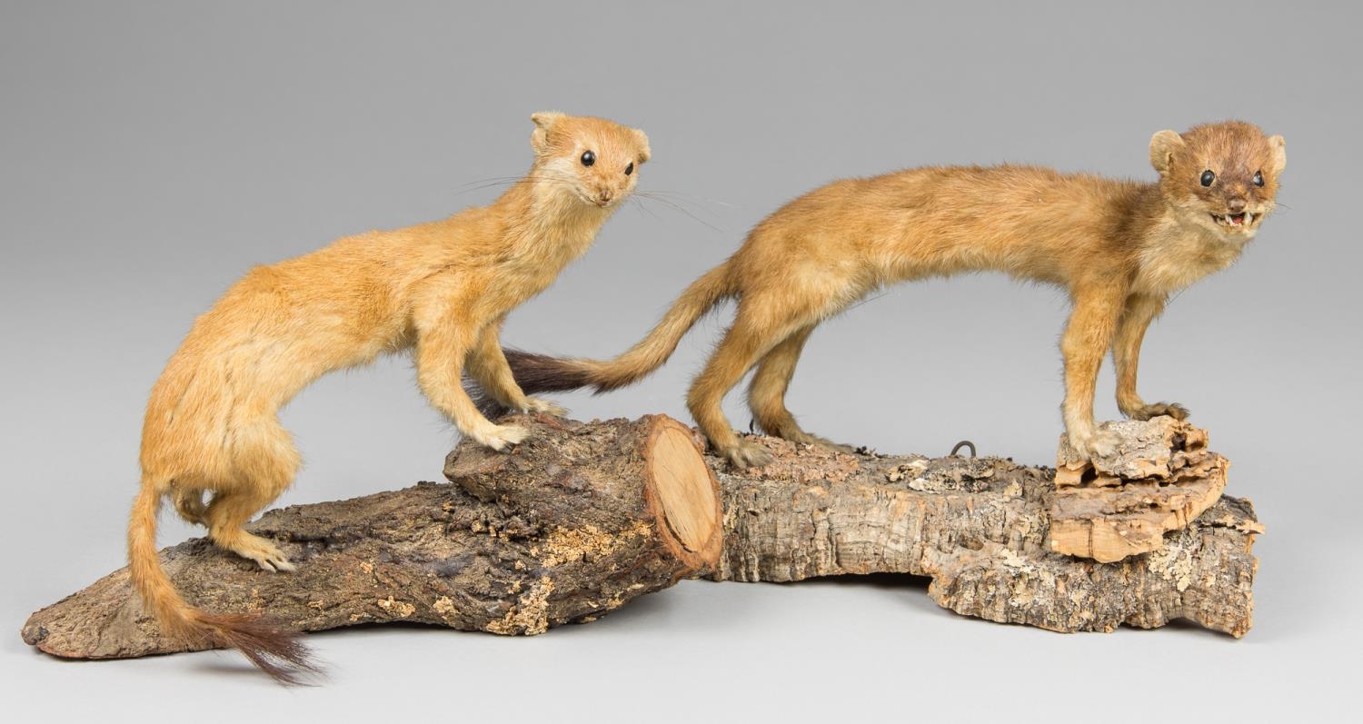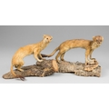 A PAIR OF 20TH CENTURY TAXIDERMY STOATS UPON NATURALISTIC BASES. The largest (w 34cm).