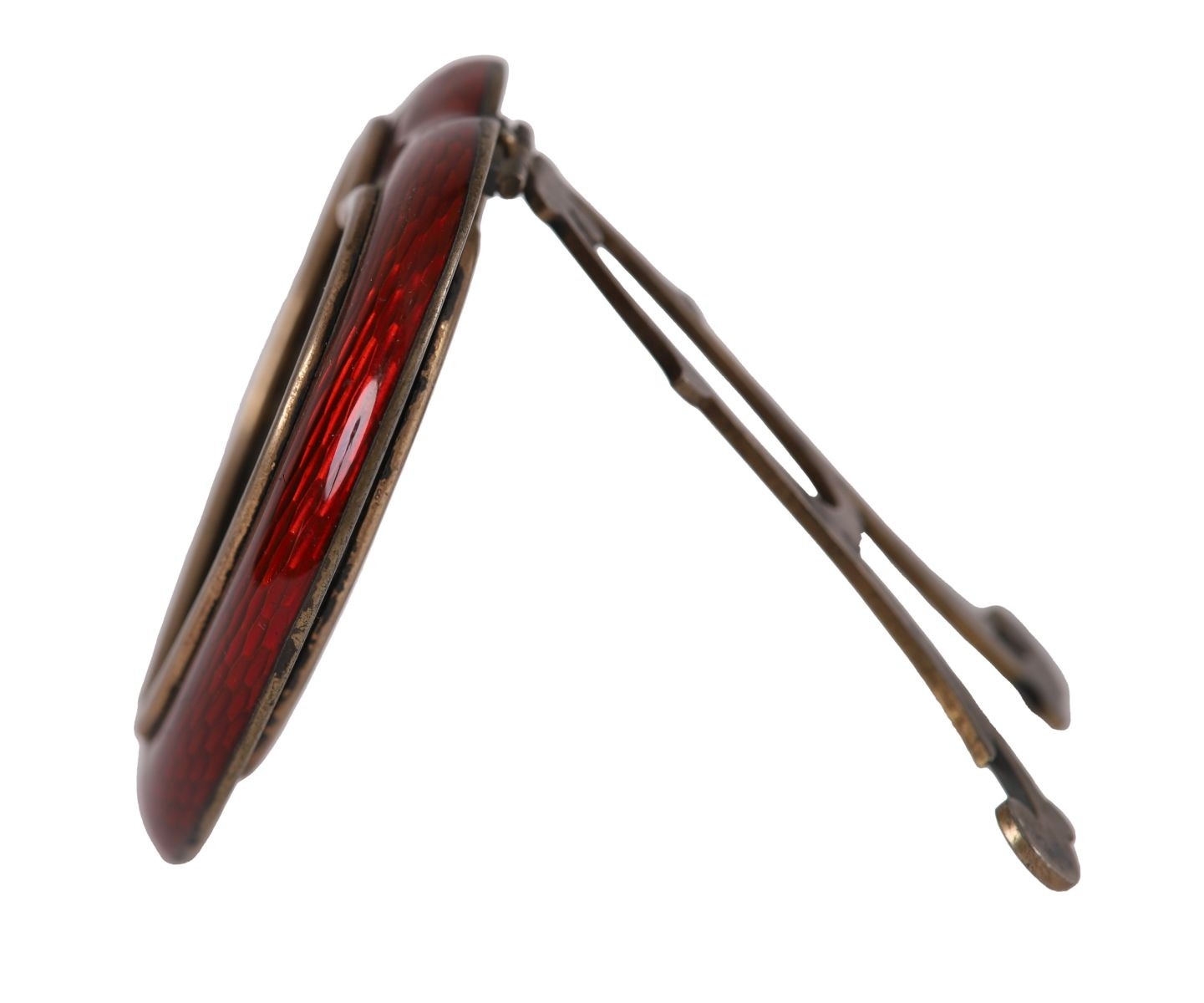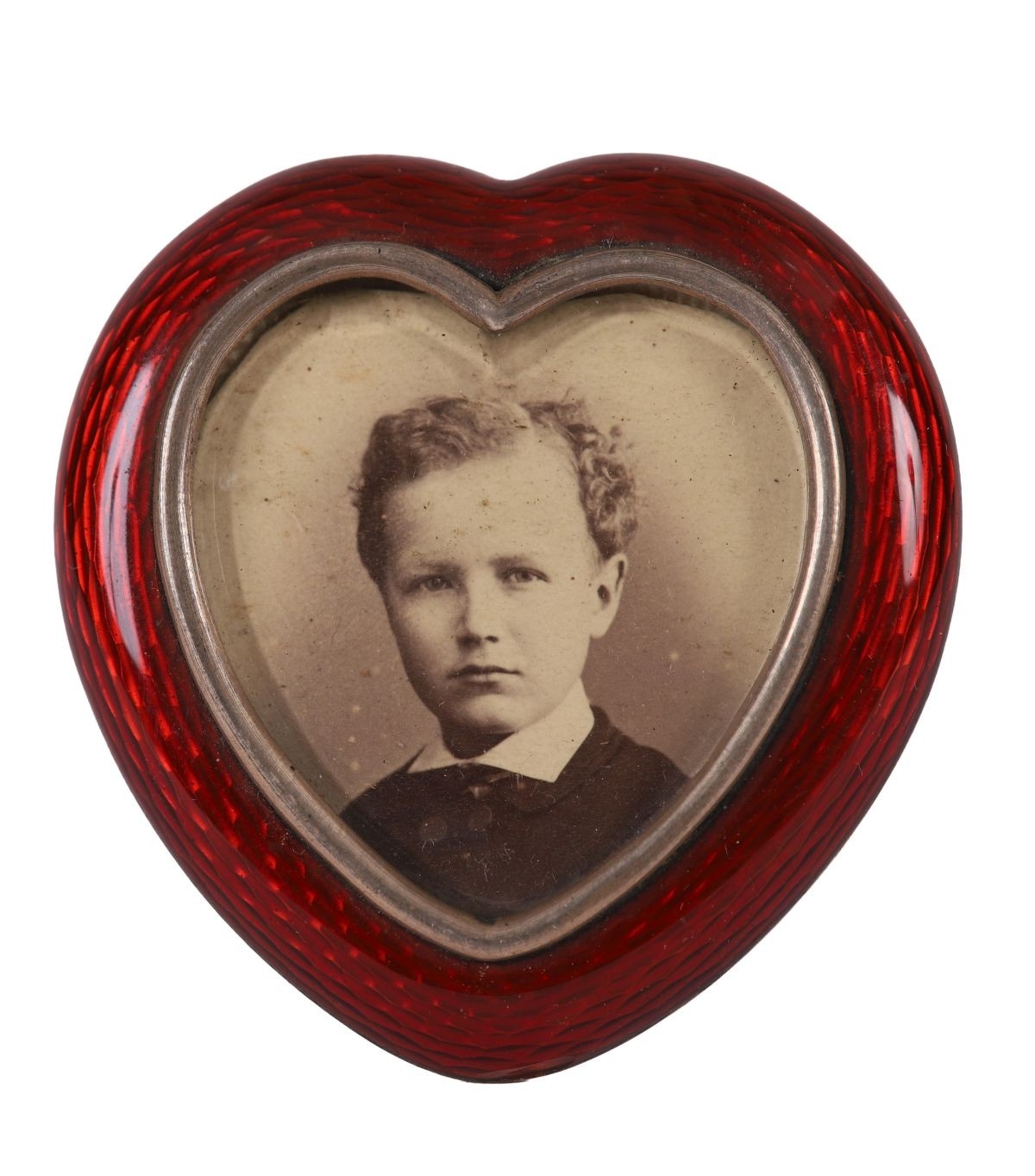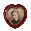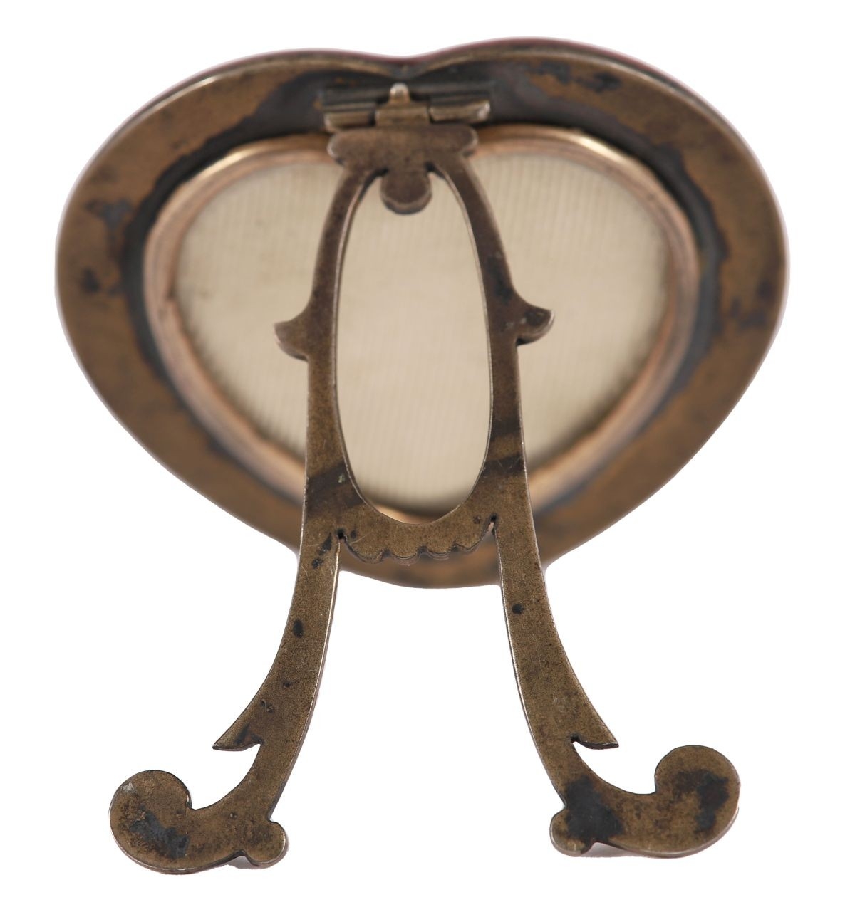 Heart-shaped frame with red glass surround and gilt metal mount, raised on a small easel support.