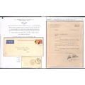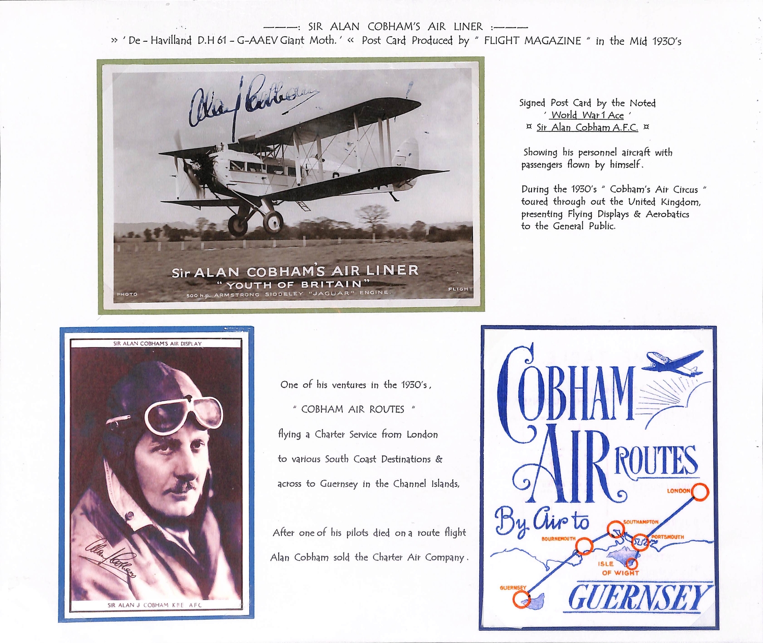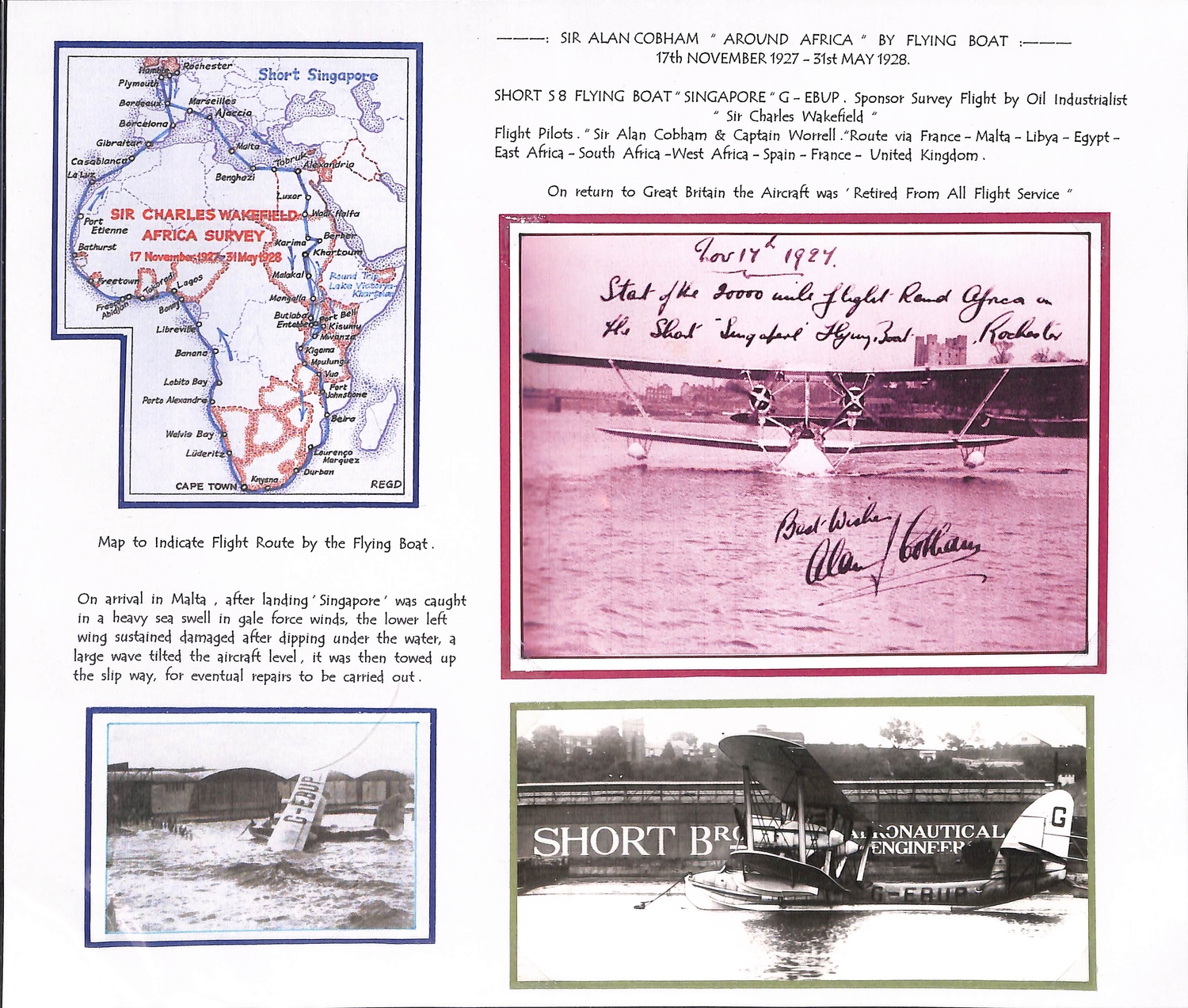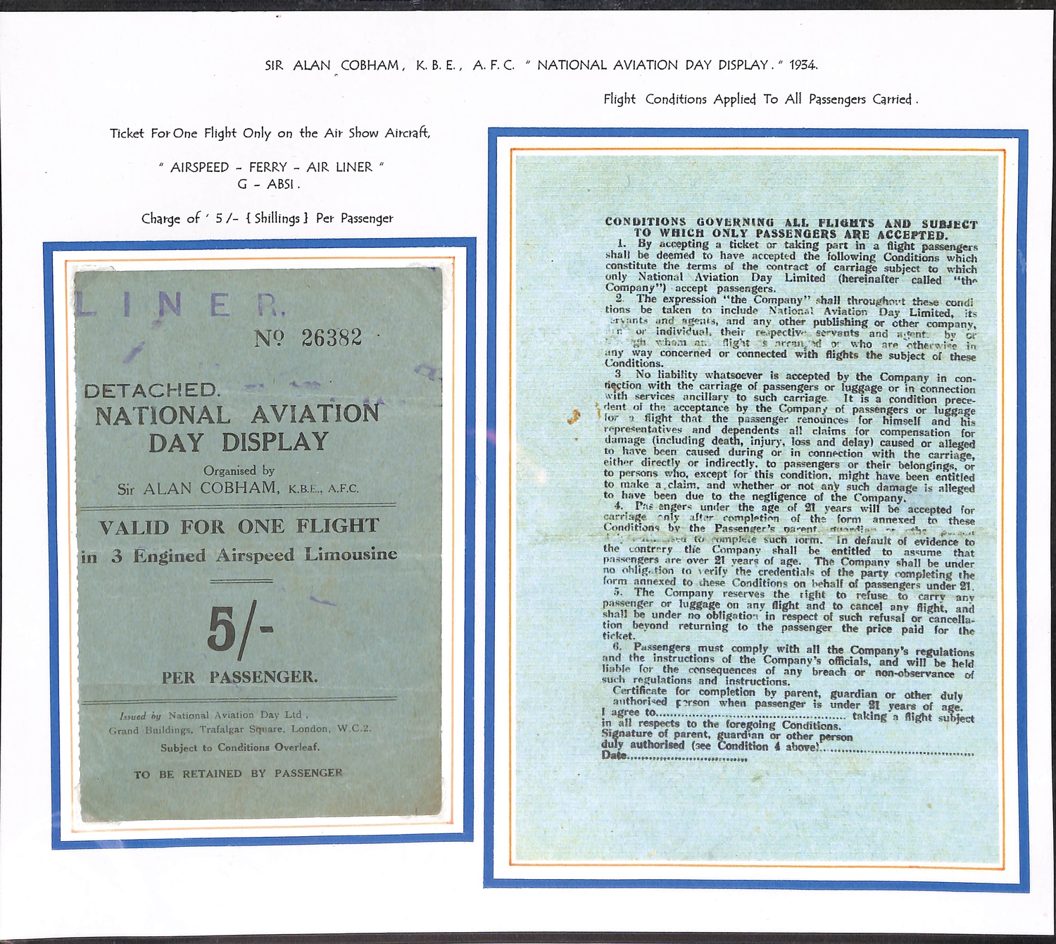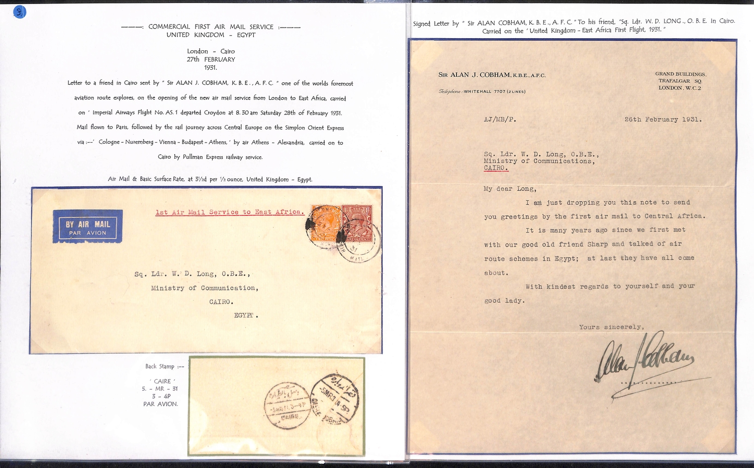 Alan Cobham. 1931 (Feb 26) Cover from London to "Sq Ldr W.D Long, Ministry of Communication, Cairo" carried on the Imperial Airways first flight, with an enclosed typed letter signed by Alan Cobham on his headed notepaper; a picture postcard of Sir Alan Cobham's Air Liner "Youth of Britain" signed in ink by Alan Cobham; and a 5/- ticket for a flight during the 1934 National Aviation Day Display organised by Cobham. (3).