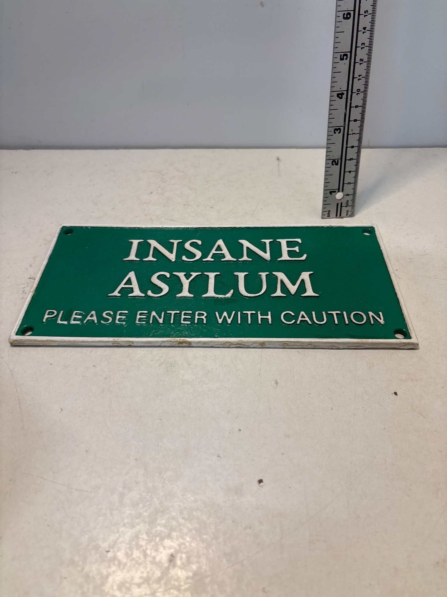 Green metal sign with white text reading 'Insane Asylum: Ple...