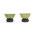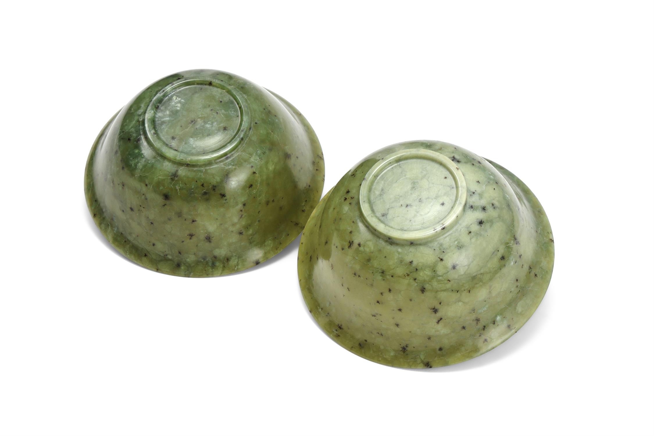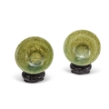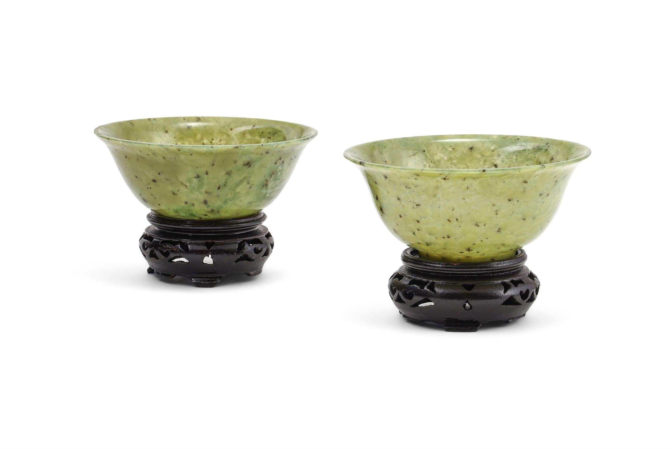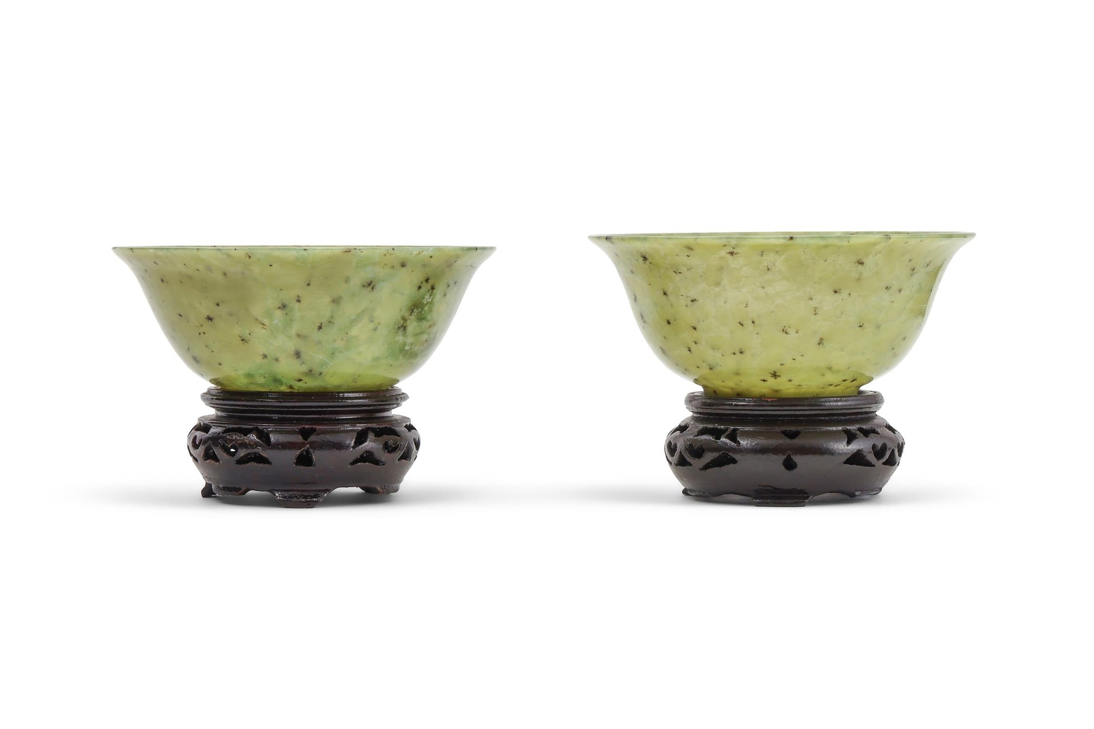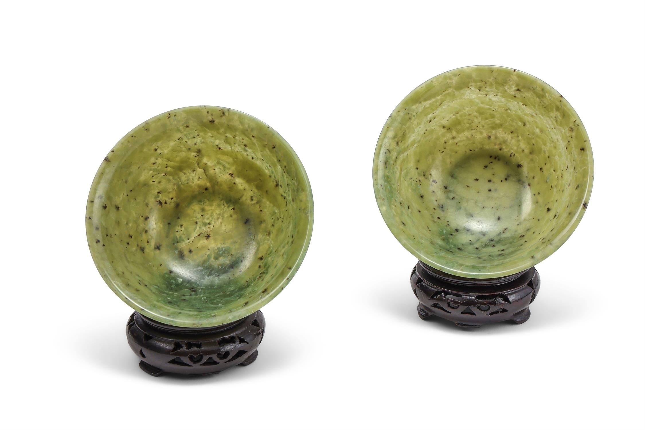 A PAIR OF SPINACH JADE BOWLS 20TH CENTURYOn hardwood stands12cm diameterProvenance:Private Collection