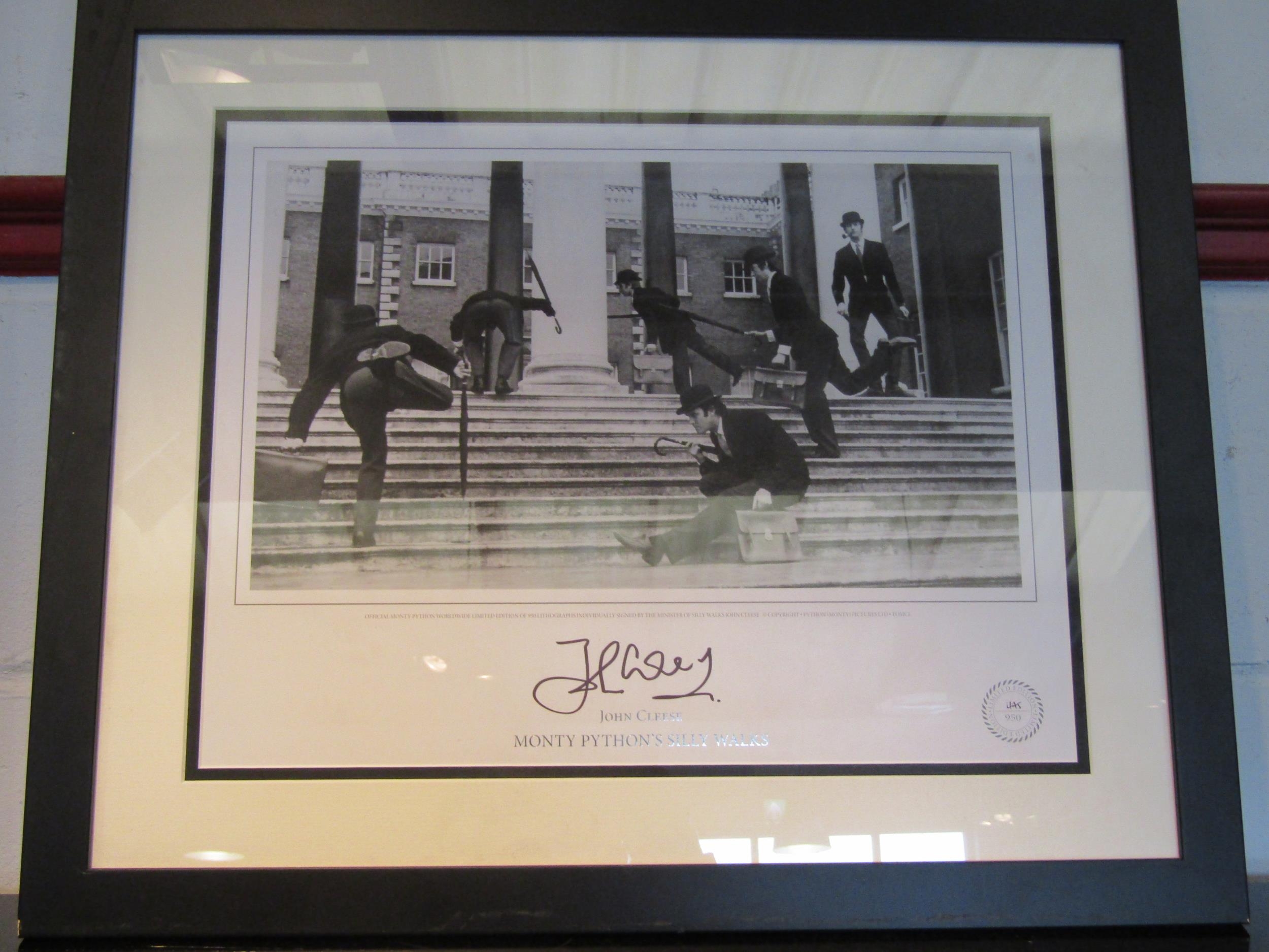 A limited edition Monty Python’s Silly Walks lithograph signed by John Cleese, no. 475/950, framed and glazed, 24cm x 42cm image size