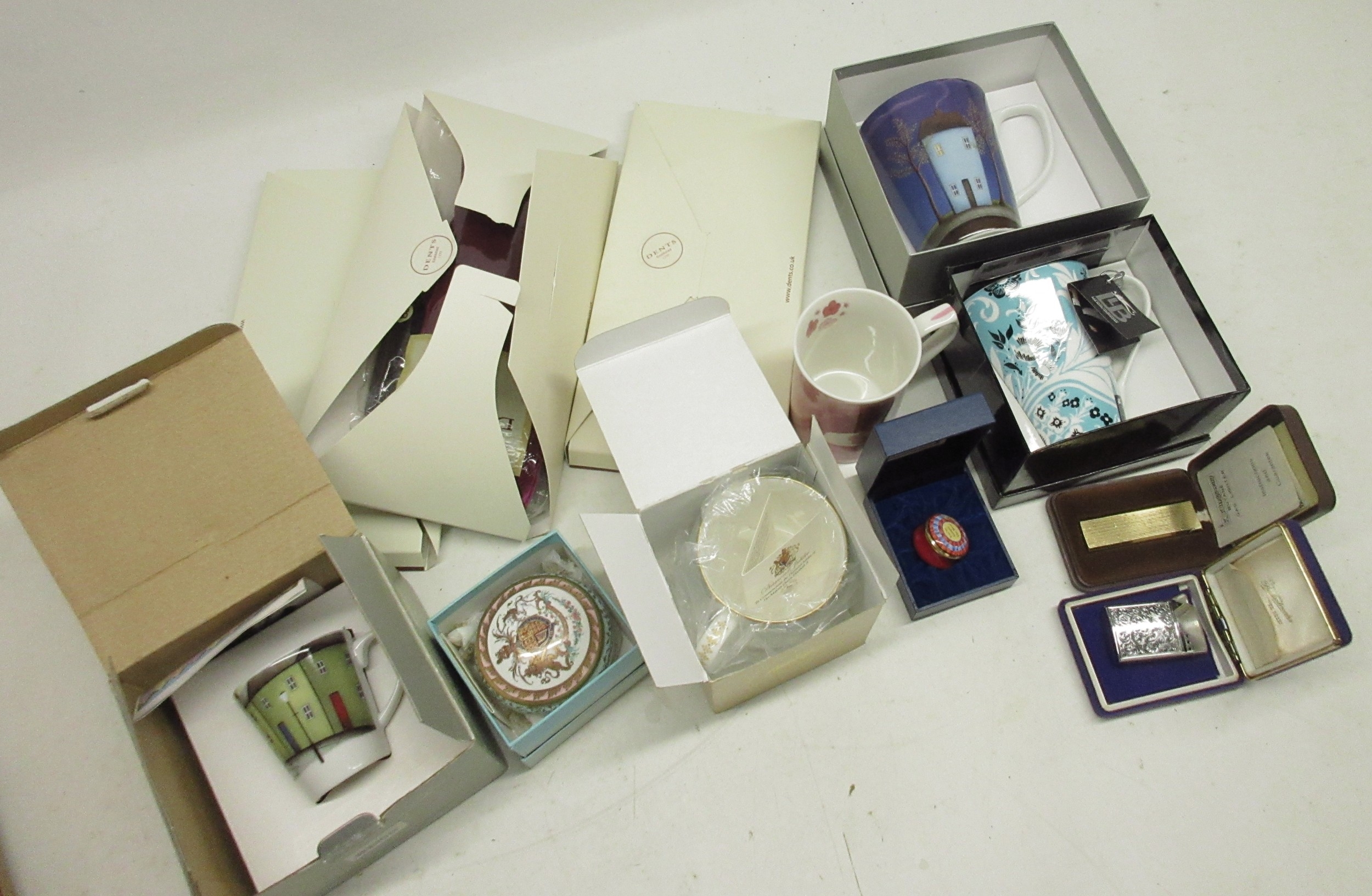 Pair of Dent's black velvet and purple velvet evening gloves, pair of Dent's black sateen evening gloves, pair of Dent's black evening gloves, Halcyon days enamel pot, SIM luxe lighter, Kingsway lighter, two royal commemorative mugs, two royal Worcester mugs, etc.