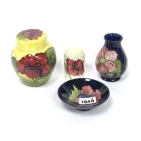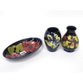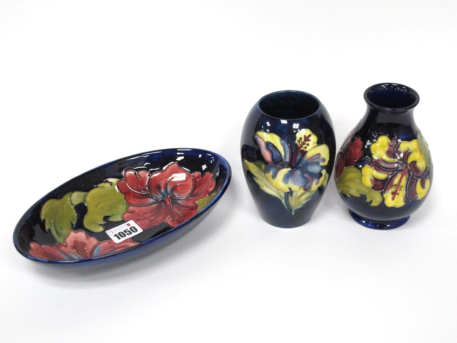 A Moorcroft Pottery Oval Dish, painted in the 'Hibiscus' pattern of pink flowers against a dark blue ground, impressed marks, 23cm long and two matching vases, 13-14cm high. (3)